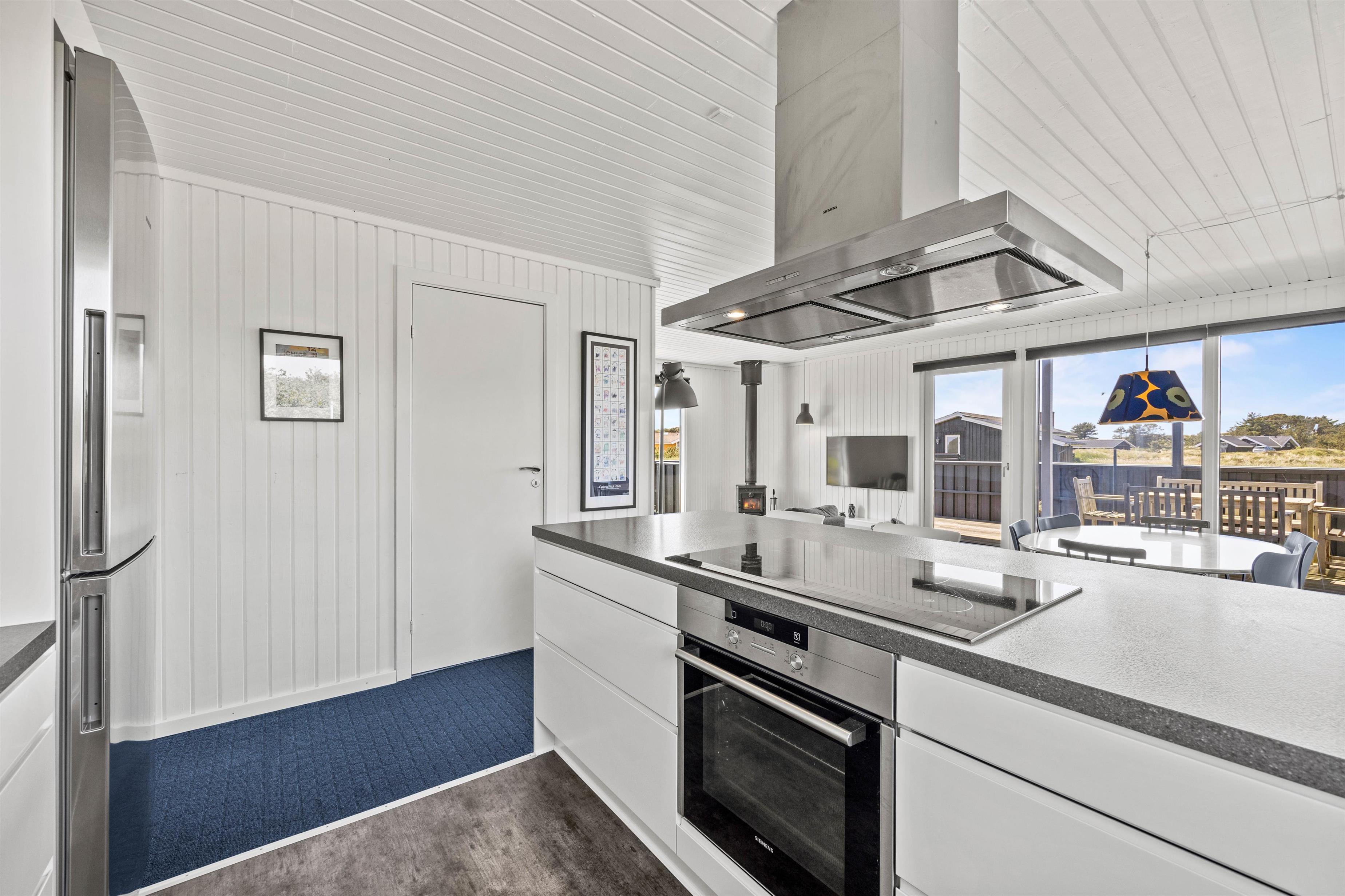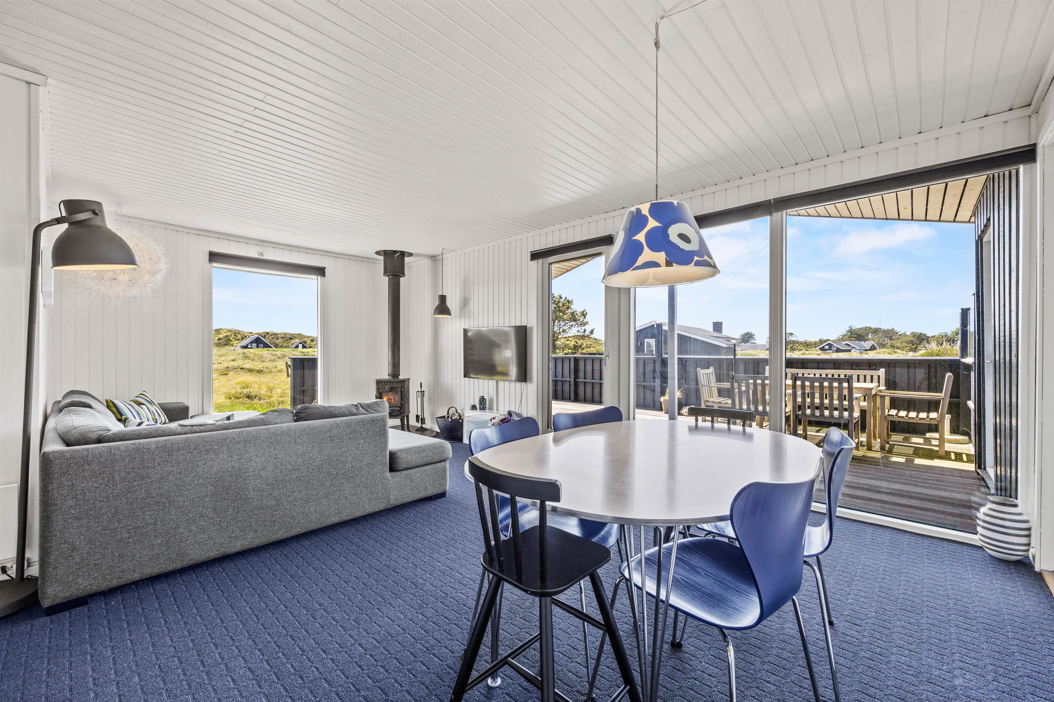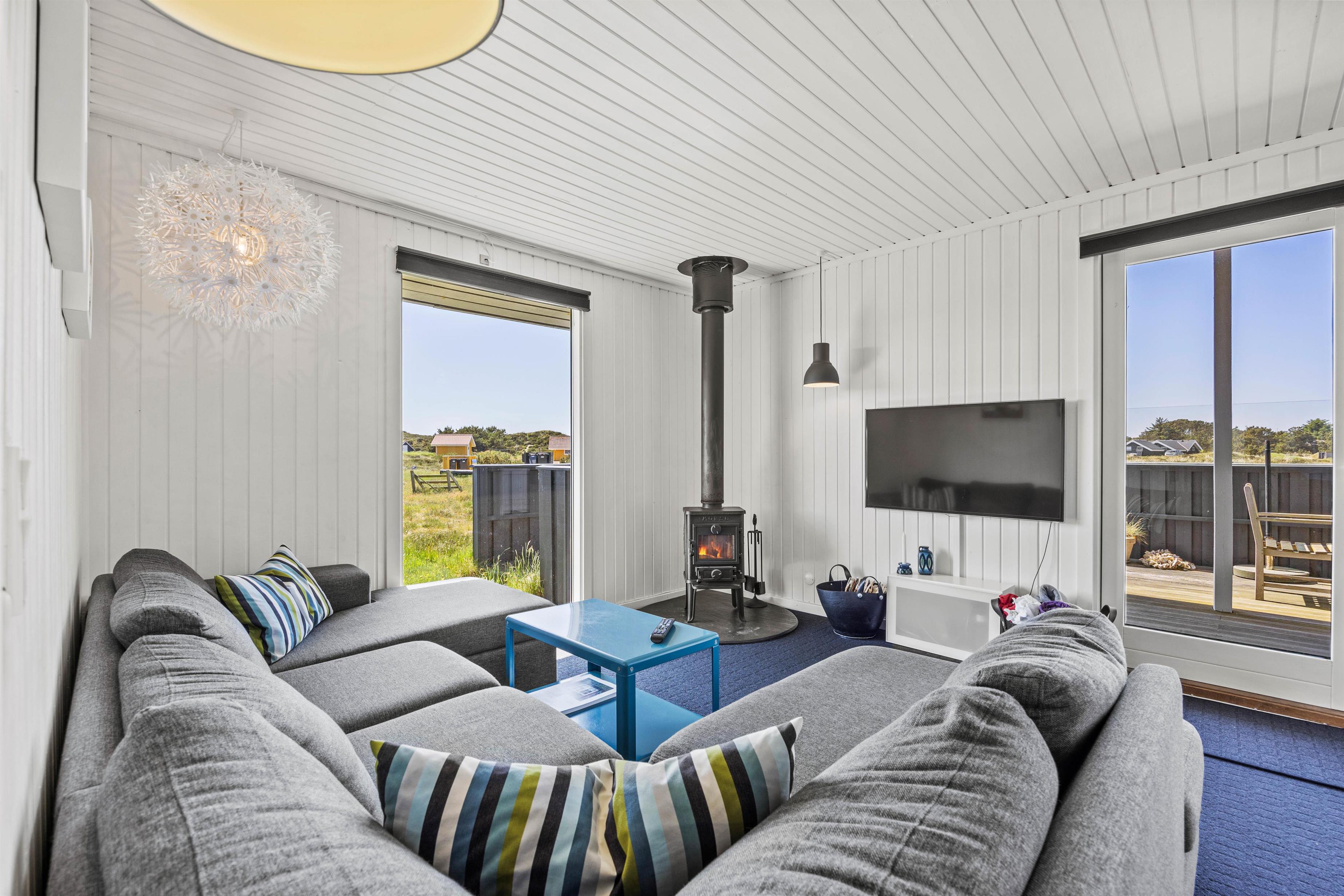 Dette hyggelige feriehus har en lys og indbydende atmosfære, hvor I hurtigt kan føle jer hjemme. Det åbne opholdsrum udstråler en lys og indbydende atmosfære takket være de store vinduer, som lukker masser af naturligt lys ind. De smagfulde møbler med en behagelig sofa og en varmende pejs skaber et hyggeligt sted, hvor I kan læne jer tilbage og nyde jeres tid sammen. Her flyder stue, spiseplads og køkken sammen og skaber et socialt miljø – perfekt til familielivet.
