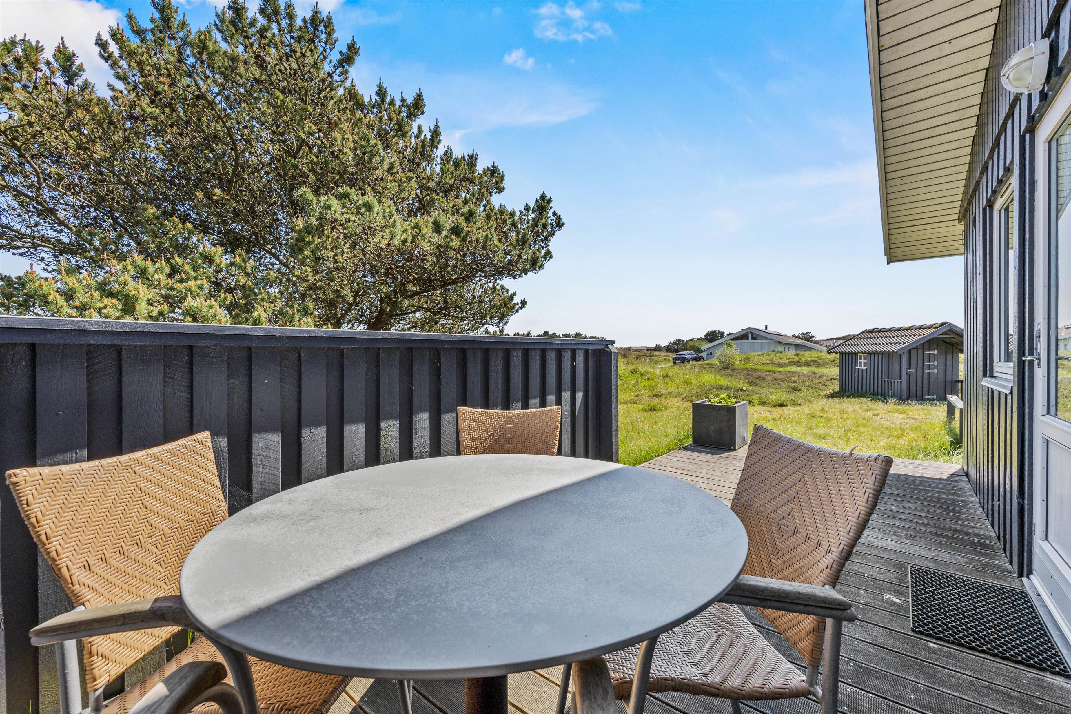 Feriehuset ligger på en idyllisk naturgrund, og her kan I nyde solen på den delvist overdækkede, lukkede terrasse. Her finder I både havemøbler og liggestole til afslapning. At terrassen er lukket skaber et børne- og hundevenligt miljø, hvor børn kan lege sikkert, og hunde kan løbe frit omkring.