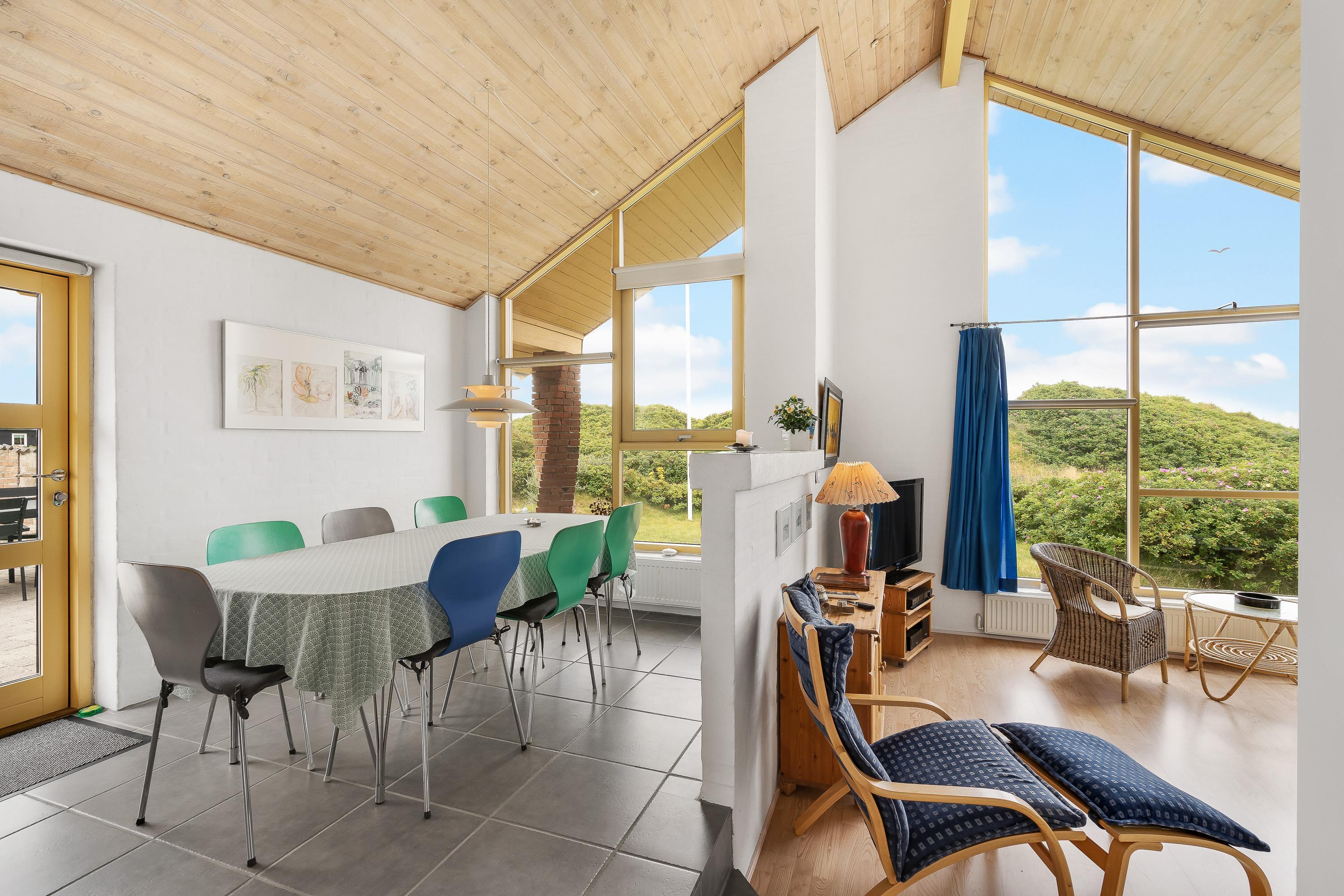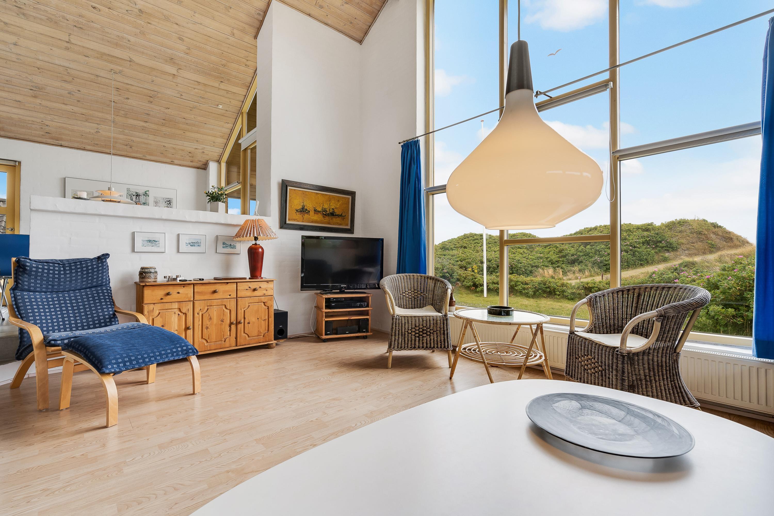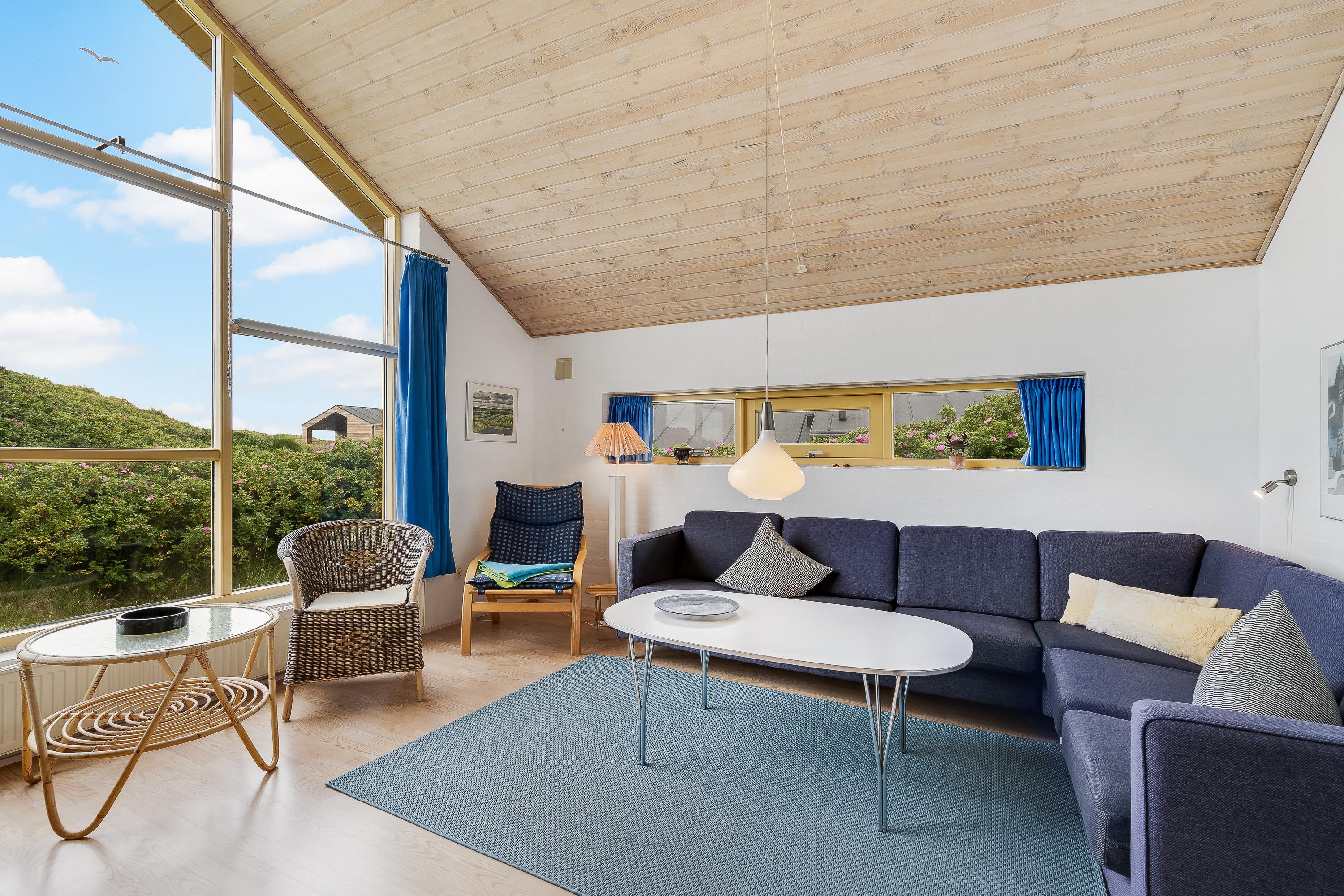 Sommerhuset er indrettet i typisk skandinavisk ”hygge”-stil. Opholdsrummet består af et veludstyret køkken i åben forbindelse til spiseplads samt stue, der er i forskudt niveau. Stuen er indrettet med komfortable møbler og en brændeovn, så I her kan læne jer tilbage efter en lang feriedag fuld af aktiviteter, og streame en god film på sommerhusets Chromecast.