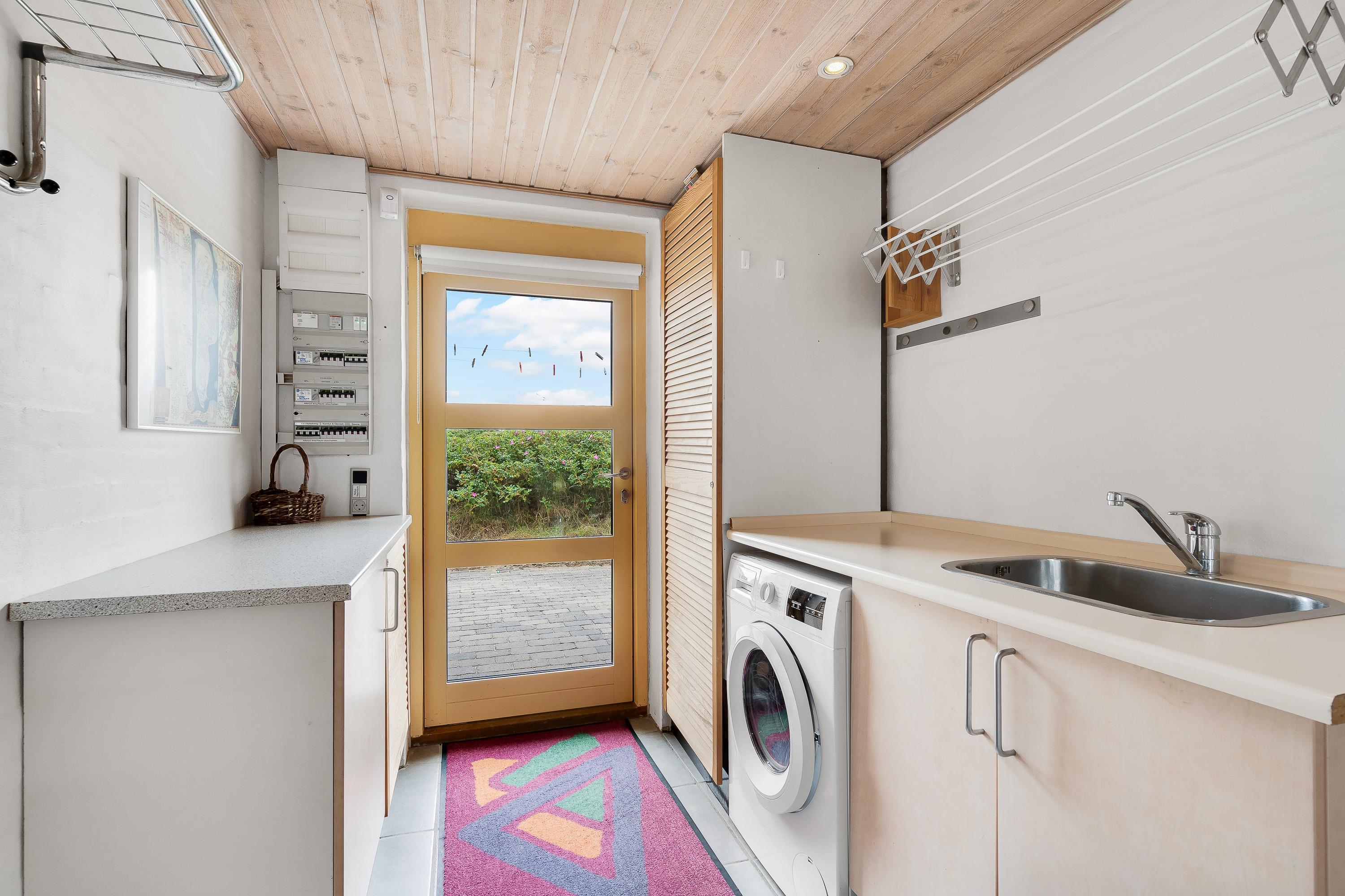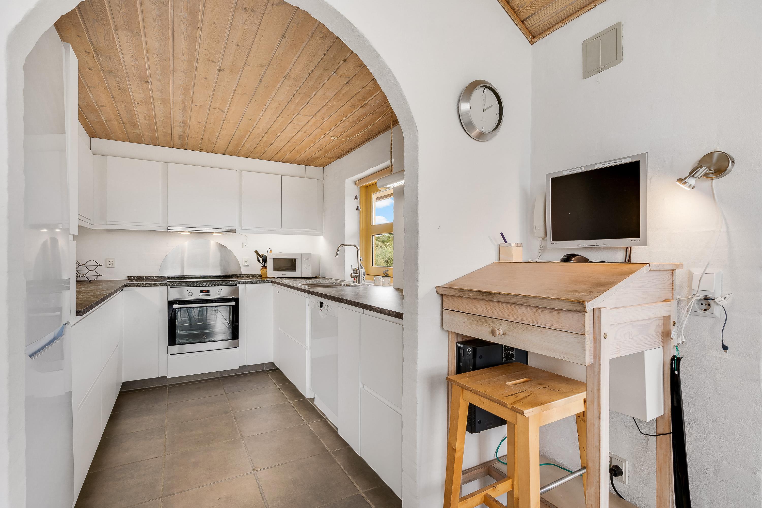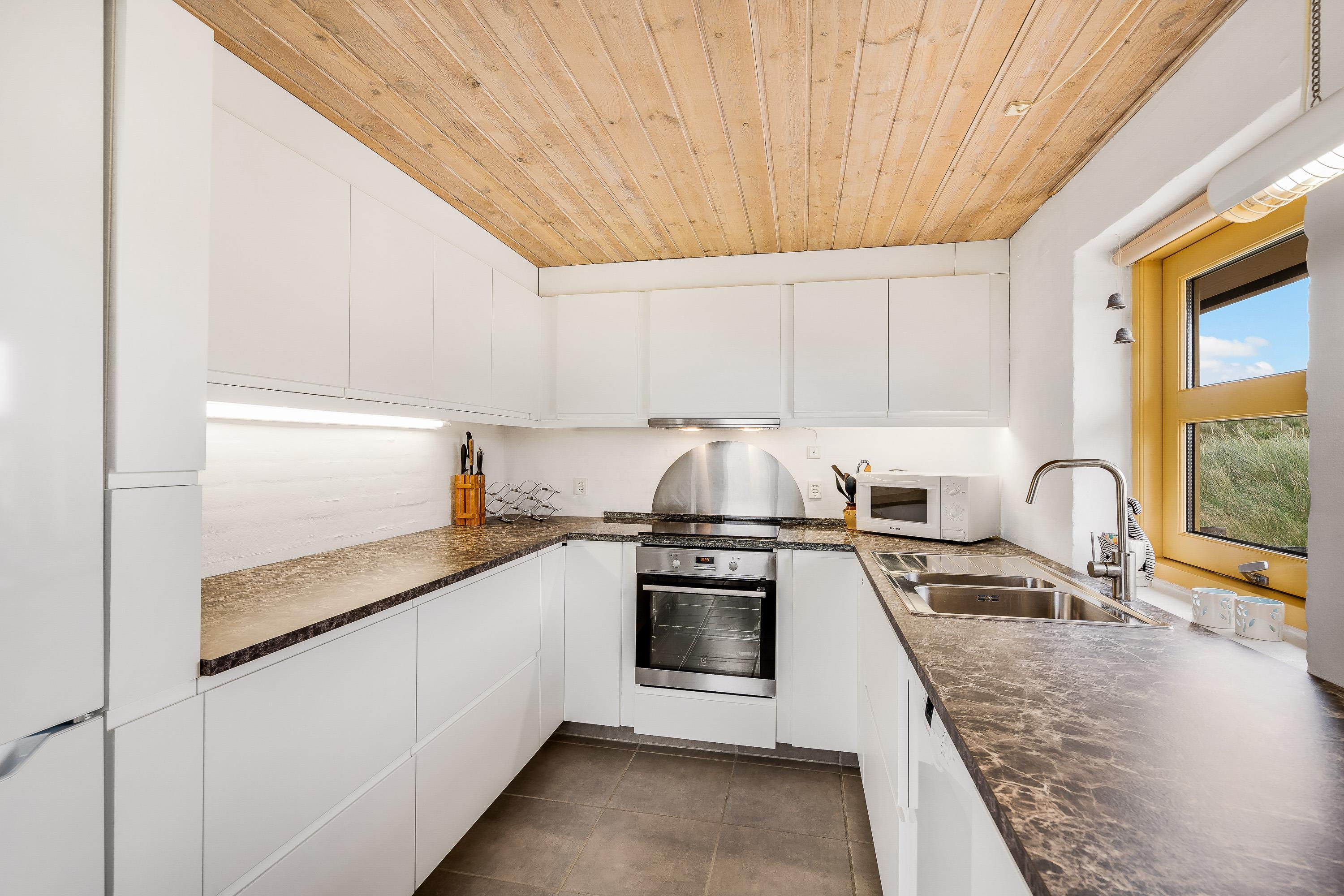 Sommerhuset er indrettet i typisk skandinavisk ”hygge”-stil. Opholdsrummet består af et veludstyret køkken i åben forbindelse til spiseplads samt stue, der er i forskudt niveau. Stuen er indrettet med komfortable møbler og en brændeovn, så I her kan læne jer tilbage efter en lang feriedag fuld af aktiviteter, og streame en god film på sommerhusets Chromecast.
