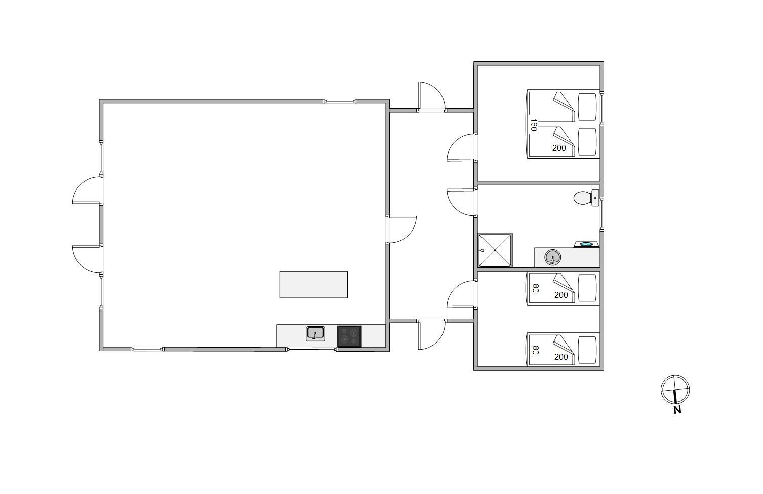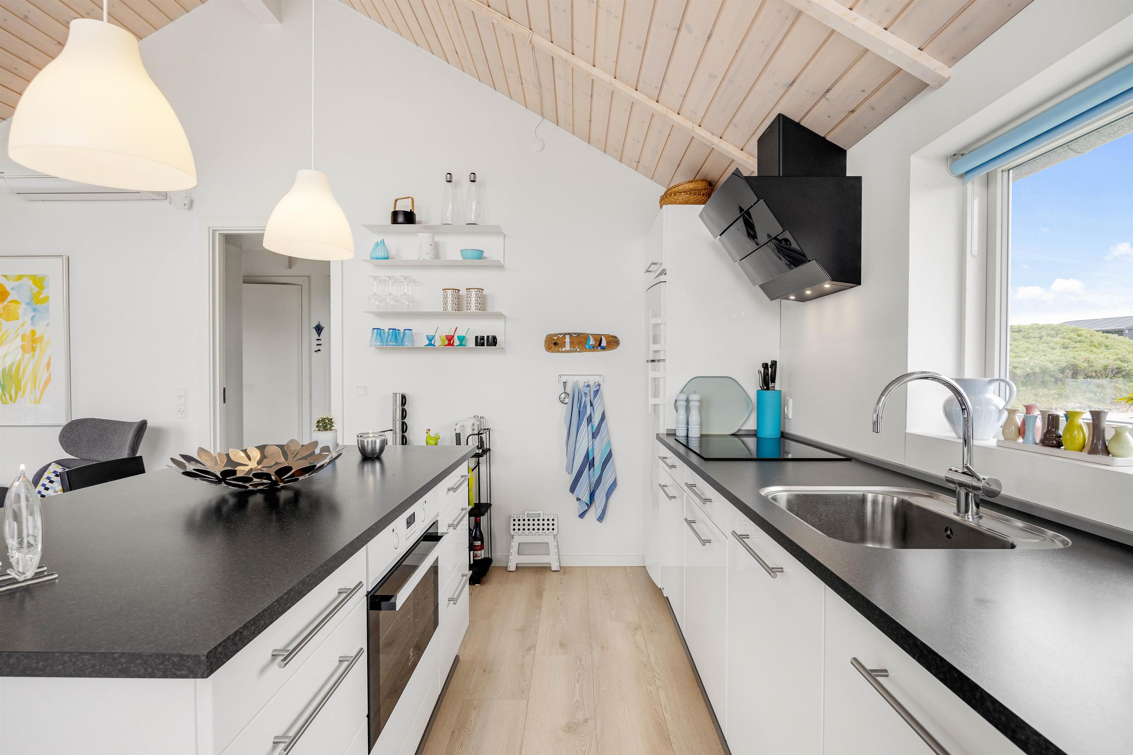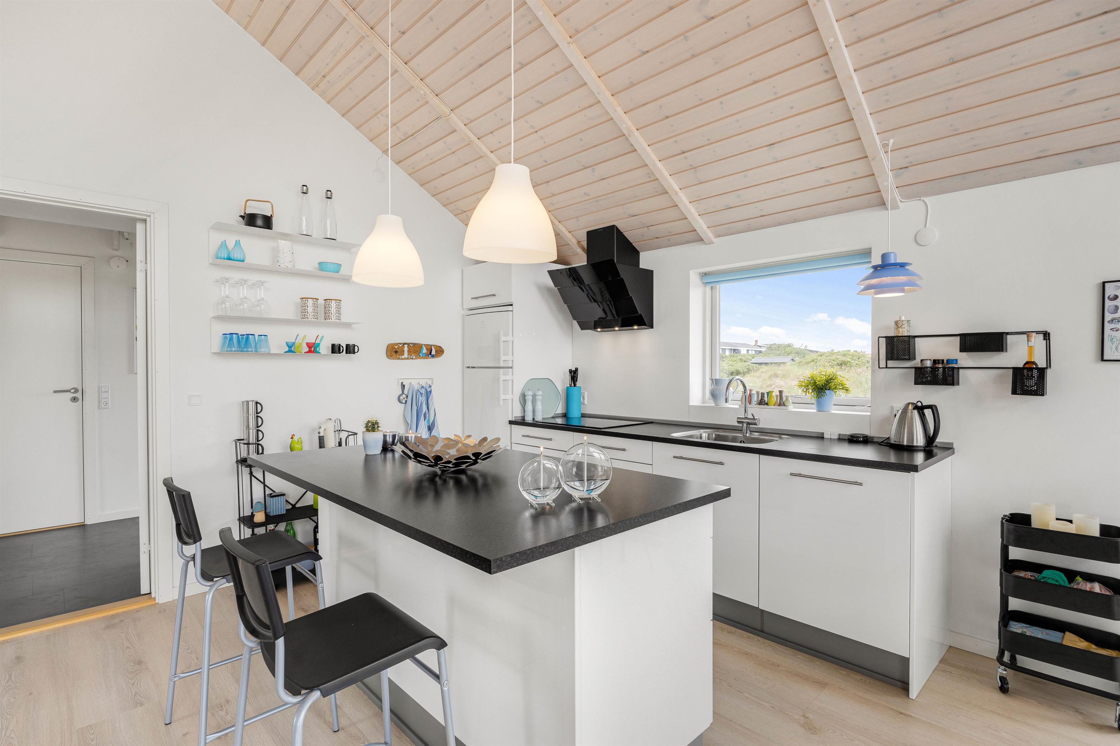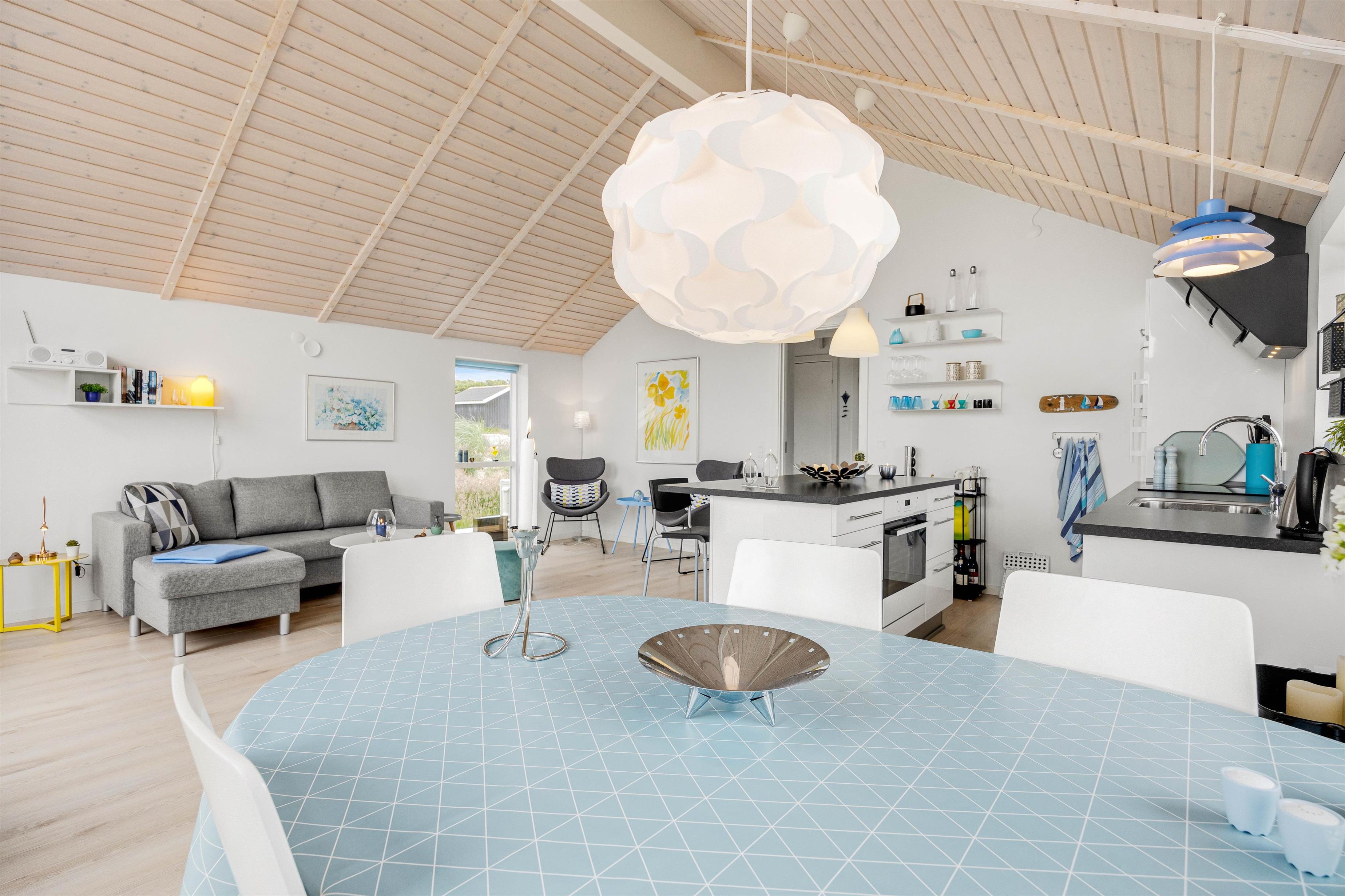 Hjertet i det 75 kvadratmeter store sommerhus er alrummet, hvor I har mulighed for at være sammen om at lave mad, spille spil og se film. Samtidig kan I også nyde hinandens selskab, selvom nogle står for madlavningen i køkkenet, mens andre slapper af foran tv’et.