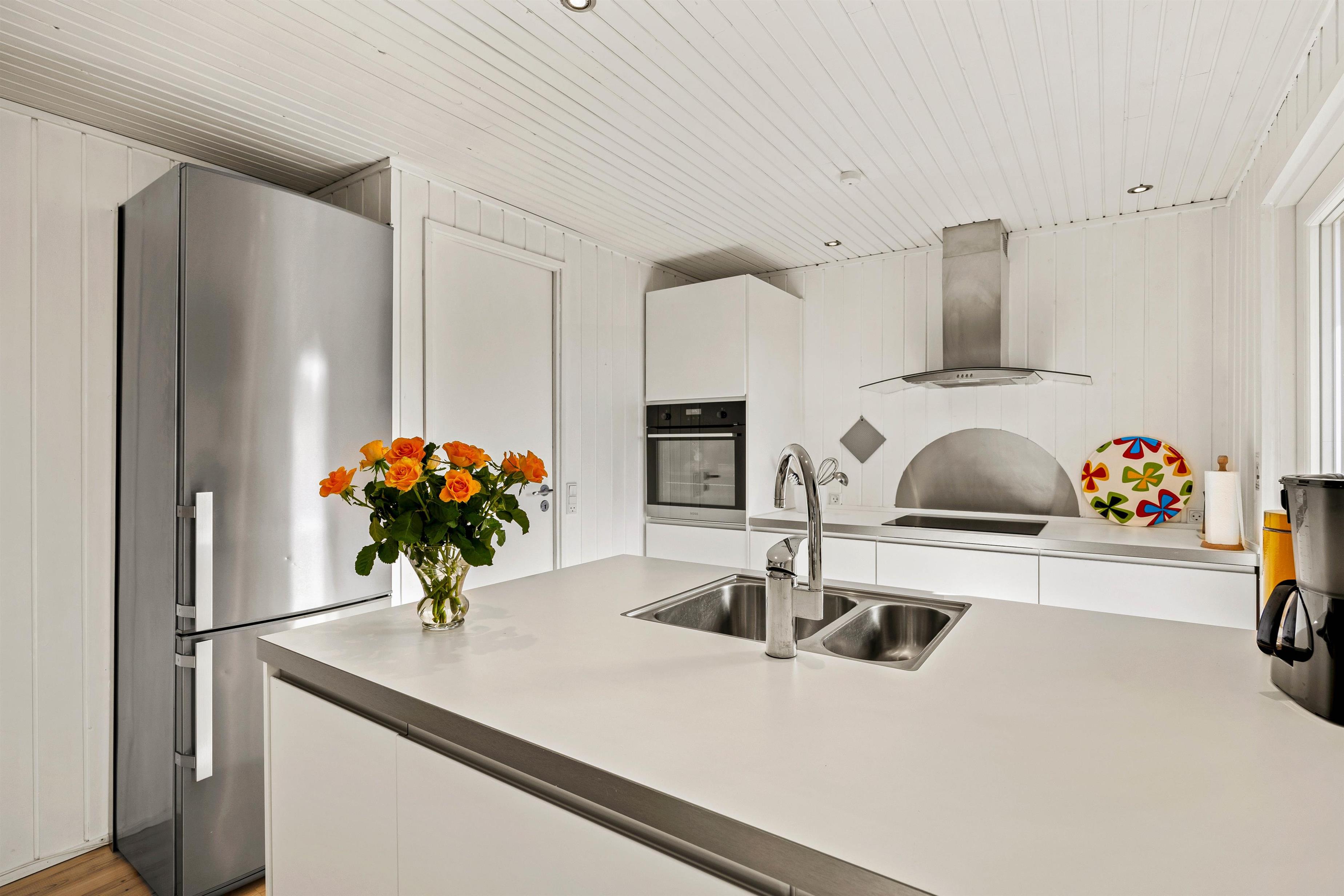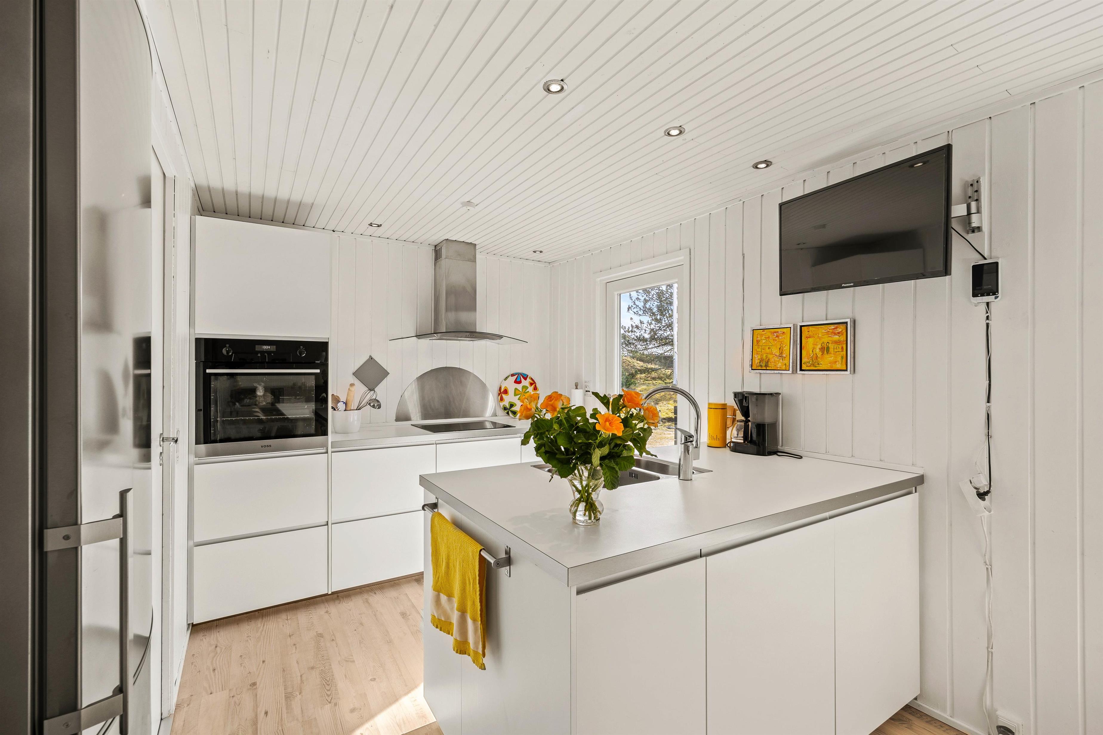 Man mærker feriestemningen straks, man træder ind ad døren til Meldbjergvej 17. De træbeklædte vægge og lofter samt det fine lysindfald giver en dejlig, luftig stemning. Her kan I hygge jer i stuen ved den knitrende ild i brændeovnen, eller I kan trække ud i udestuen og nyde samværet og den skønne udsigt der. I køkkenet er alt, hvad I behøver for at tilberede lækre hjemmelavede måltider til hinanden, for eksempel induktionskomfur, opvaskemaskine og separat fryser på 60 liter. Der er flere steder både indendørs og udendørs, hvor I kan indtage måltiderne, så føl jer hjemme, og flyt rundt efter, hvad I har mest lyst til.