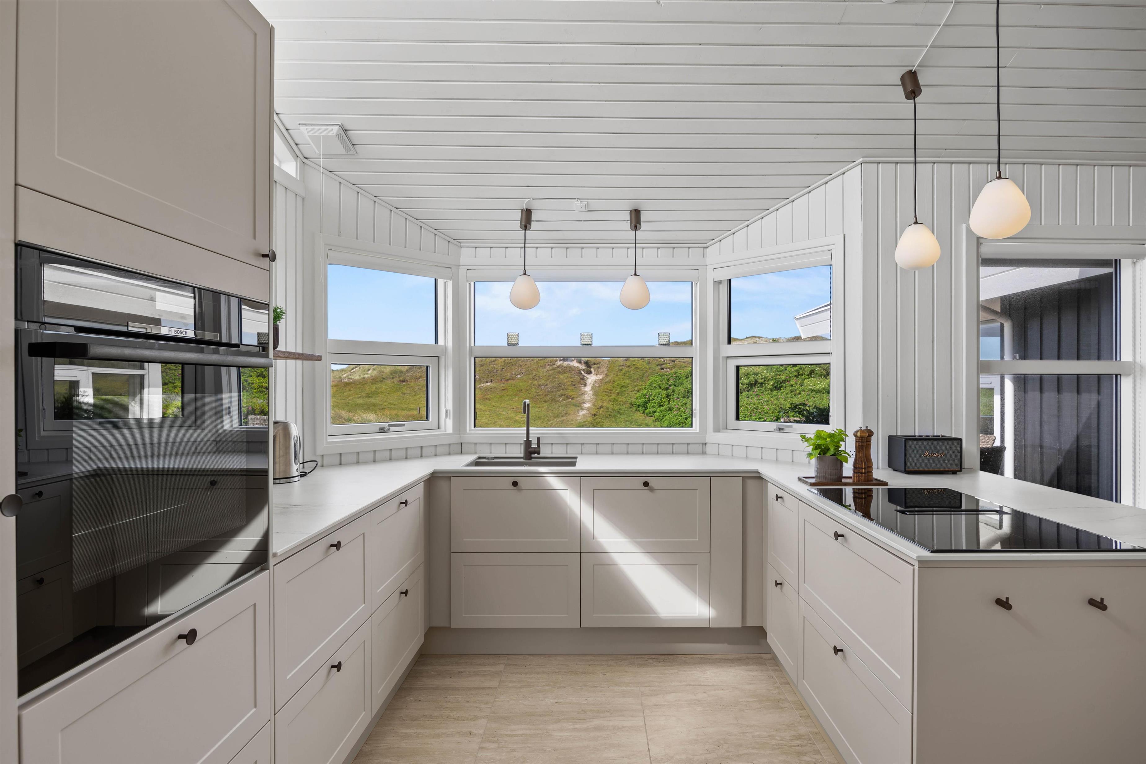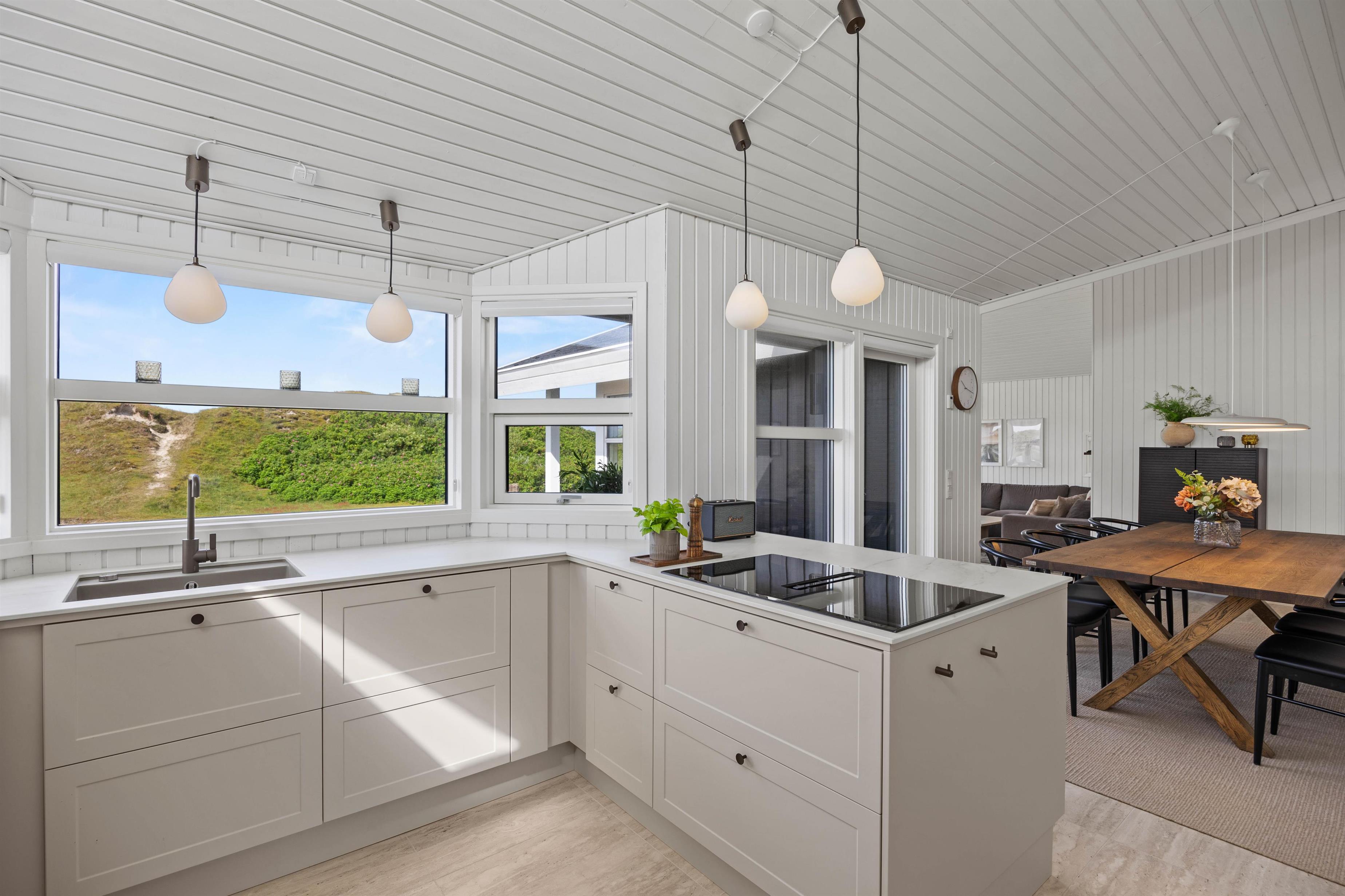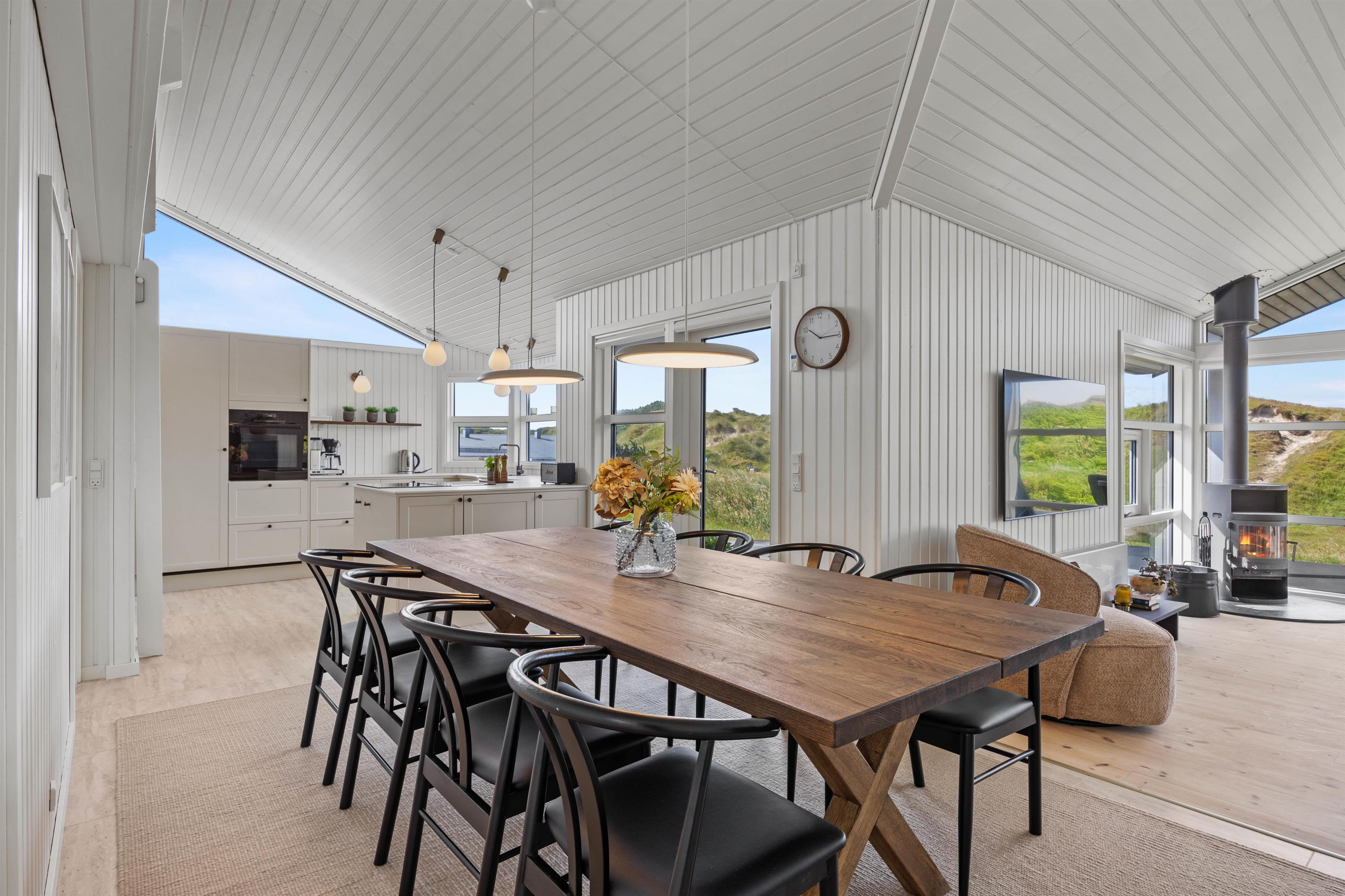 Hele ferieflokken kan samles til mange hyggelige feriestunder i alrummet, hvor køkken, stue og spiseplads er forenet. Her kan I samles om madlavning, sjove spil og spændende film i tv’et, mens brændeovnen knitrer i baggrunden og fuldender feriestemningen. Også køkkenet er renoveret i 2025.