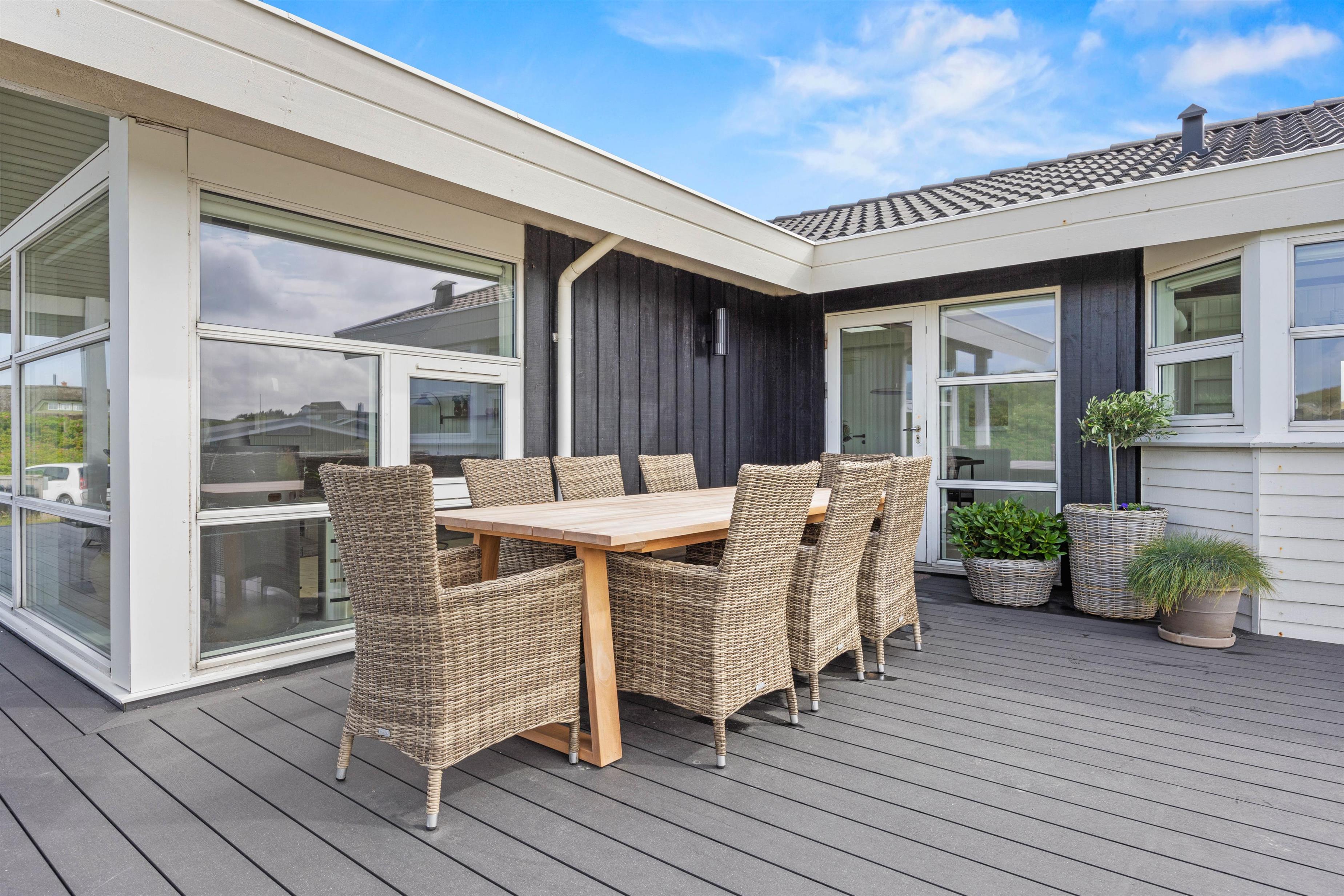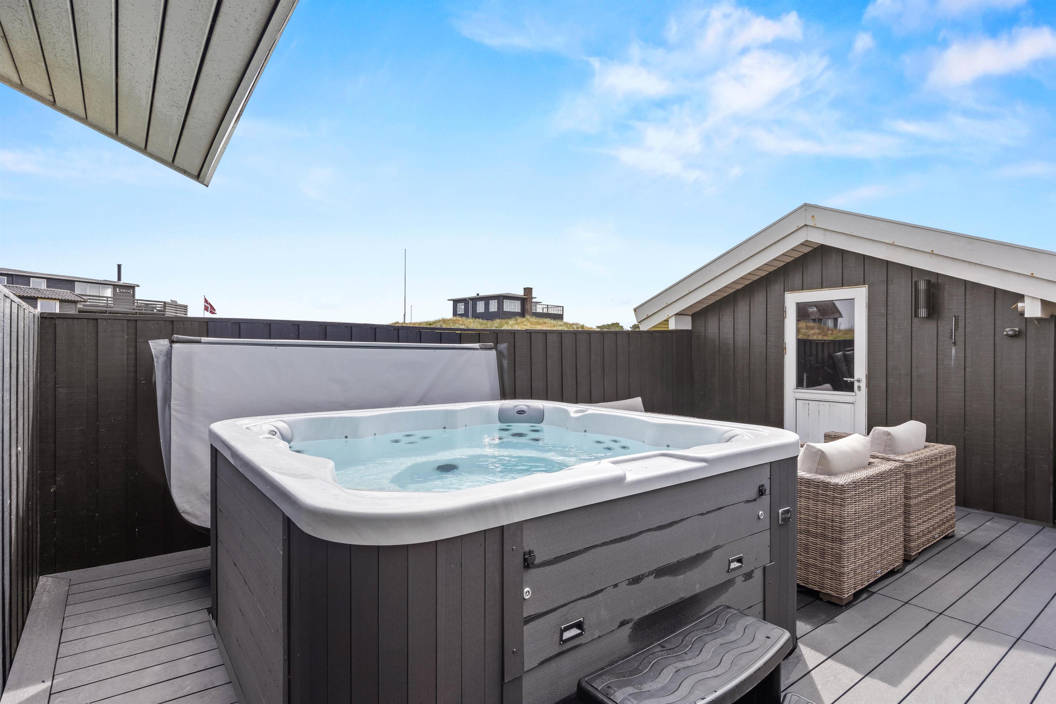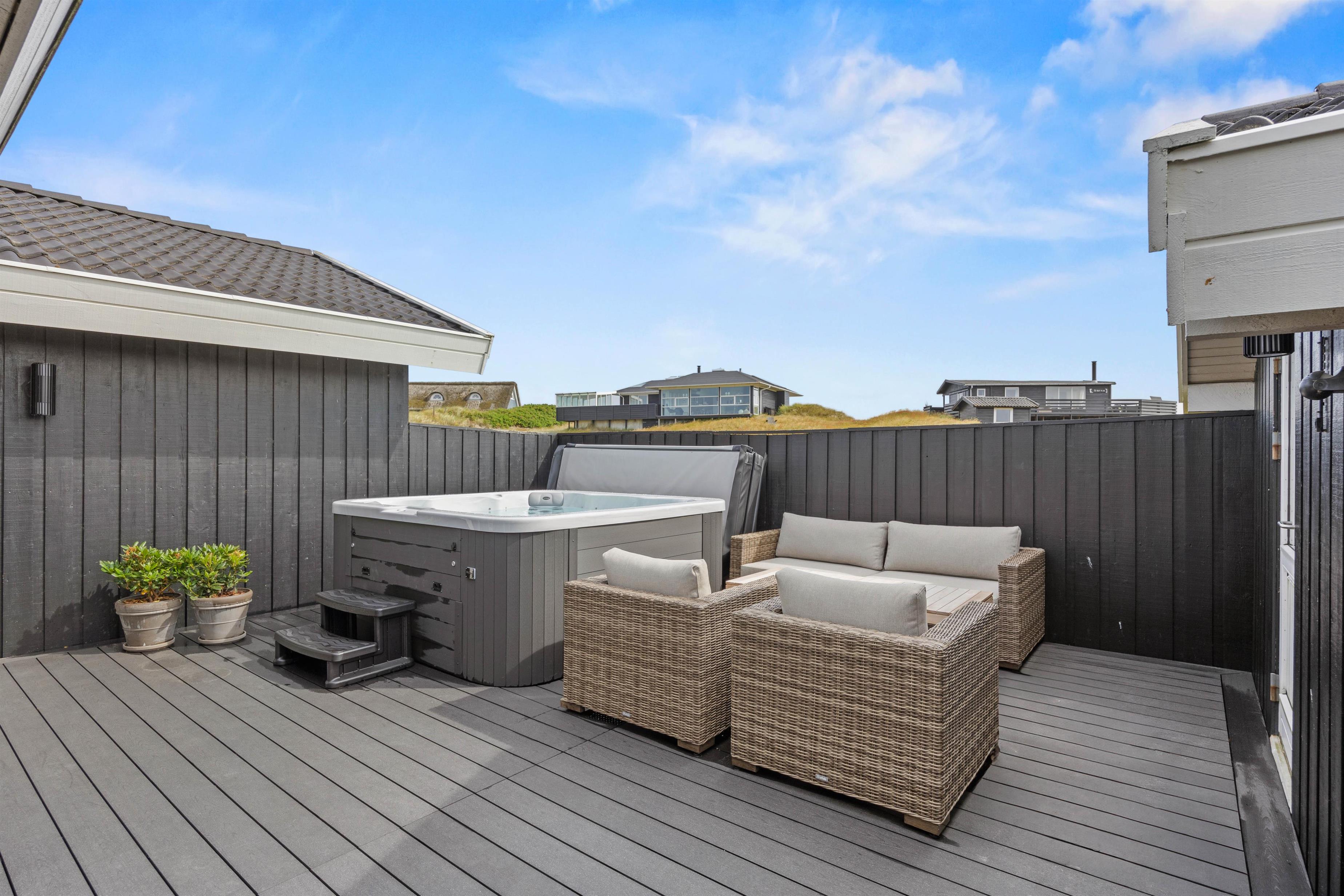 Udendørs byder feriehuset på en terrasse, der er åben og delvist overdækket, og som er det oplagte sted at tilbringe de solrige feriedage. På terrassen har I havemøbler og liggestole til rådighed, så I kan finde jer godt til rette på en plads i solen. Alt imens kan børnene gynge på gyngestativet i haven. Efter en frisk gåtur på stranden, kan I skylle jer under den udendørs bruser efterfulgt af en tur i udespaen. Den udendørs bruser kan benyttes fra april til november.