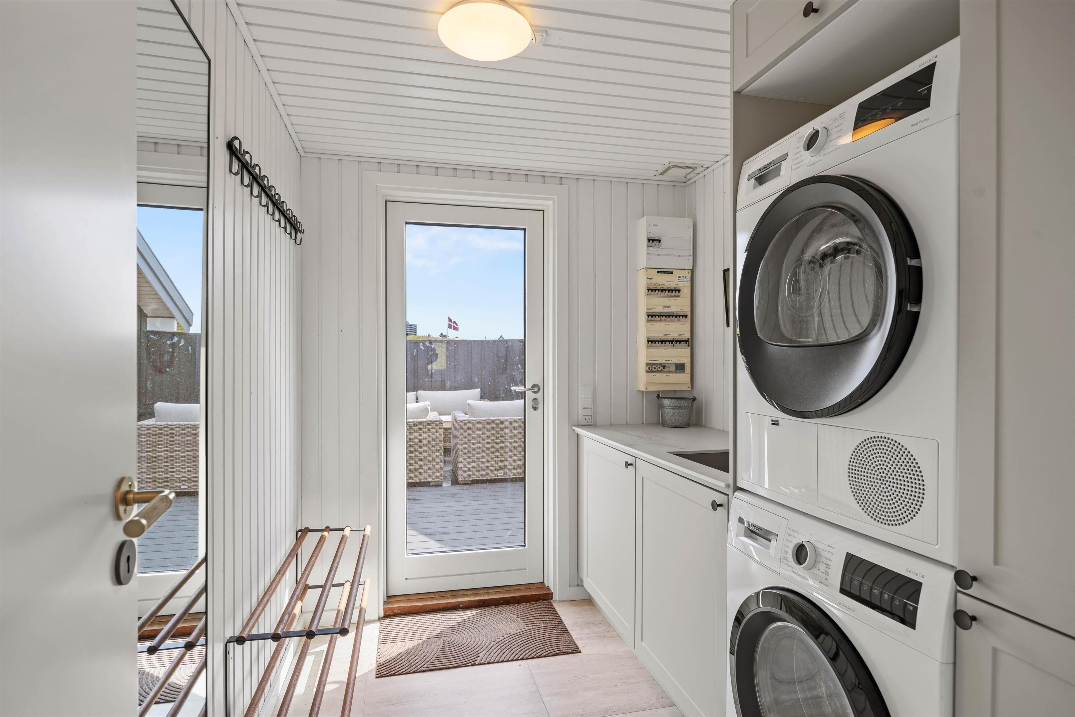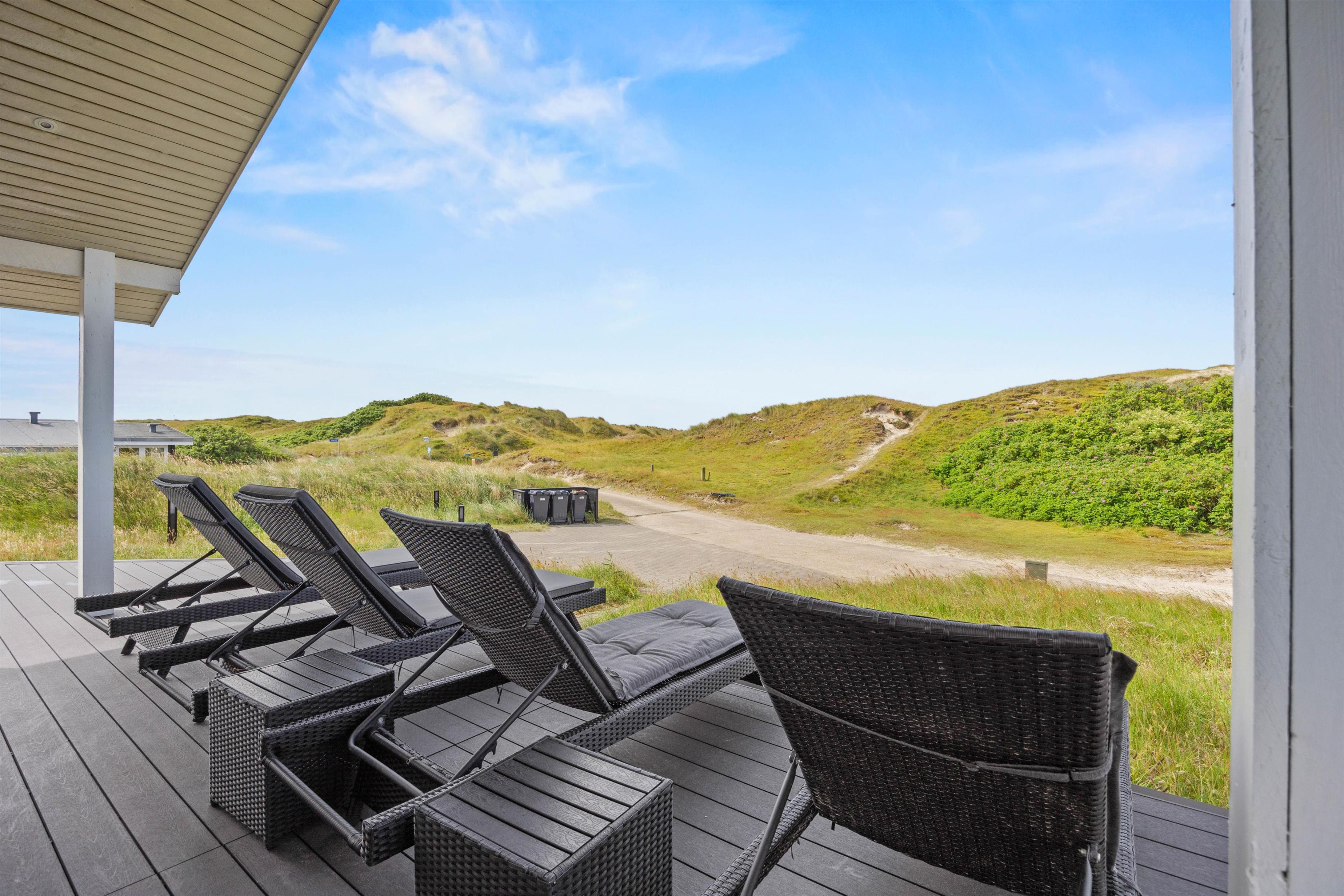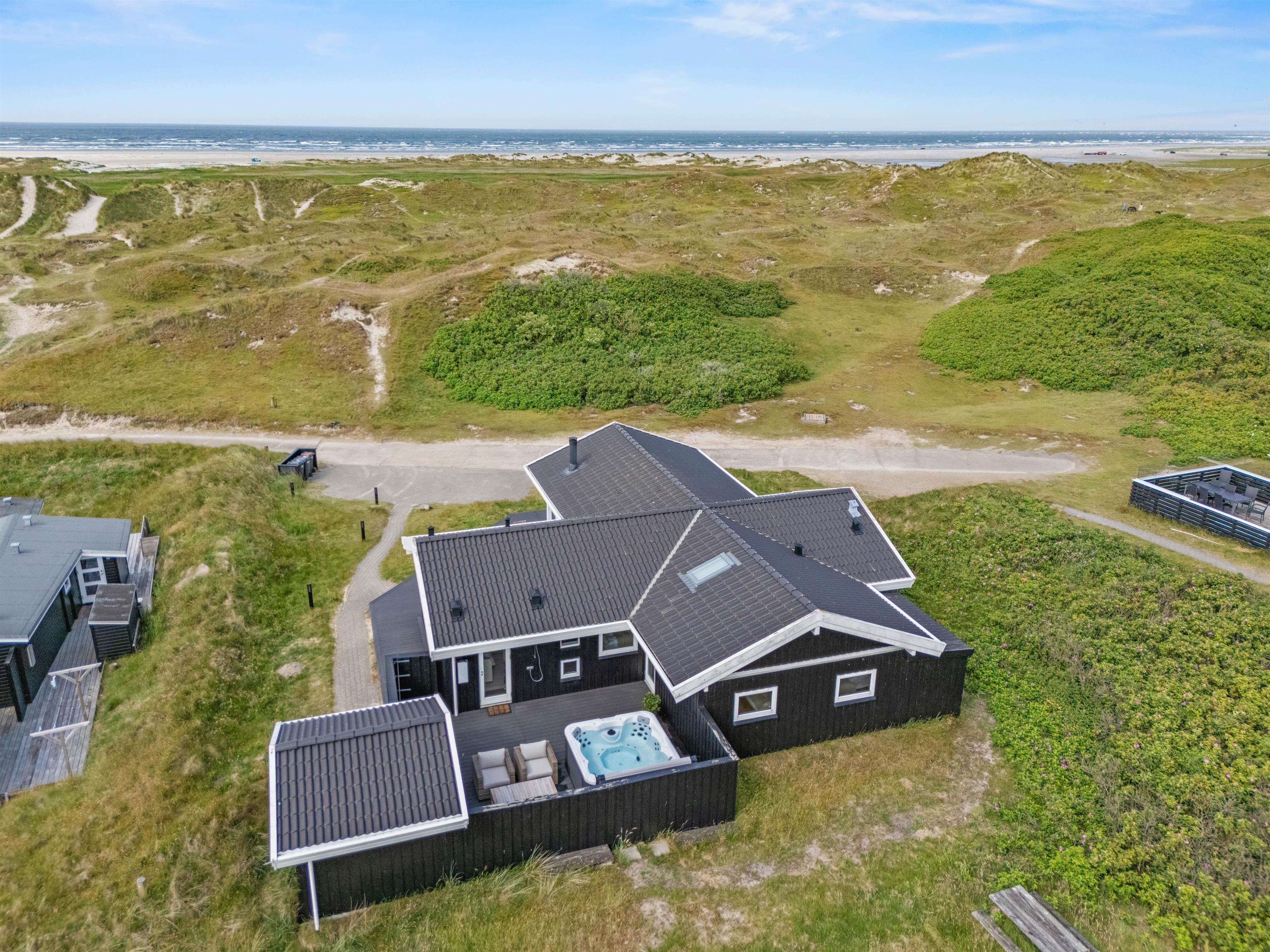 Udendørs byder feriehuset på en terrasse, der er åben og delvist overdækket, og som er det oplagte sted at tilbringe de solrige feriedage. På terrassen har I havemøbler og liggestole til rådighed, så I kan finde jer godt til rette på en plads i solen. Alt imens kan børnene gynge på gyngestativet i haven. Efter en frisk gåtur på stranden, kan I skylle jer under den udendørs bruser efterfulgt af en tur i udespaen. Den udendørs bruser kan benyttes fra april til november.