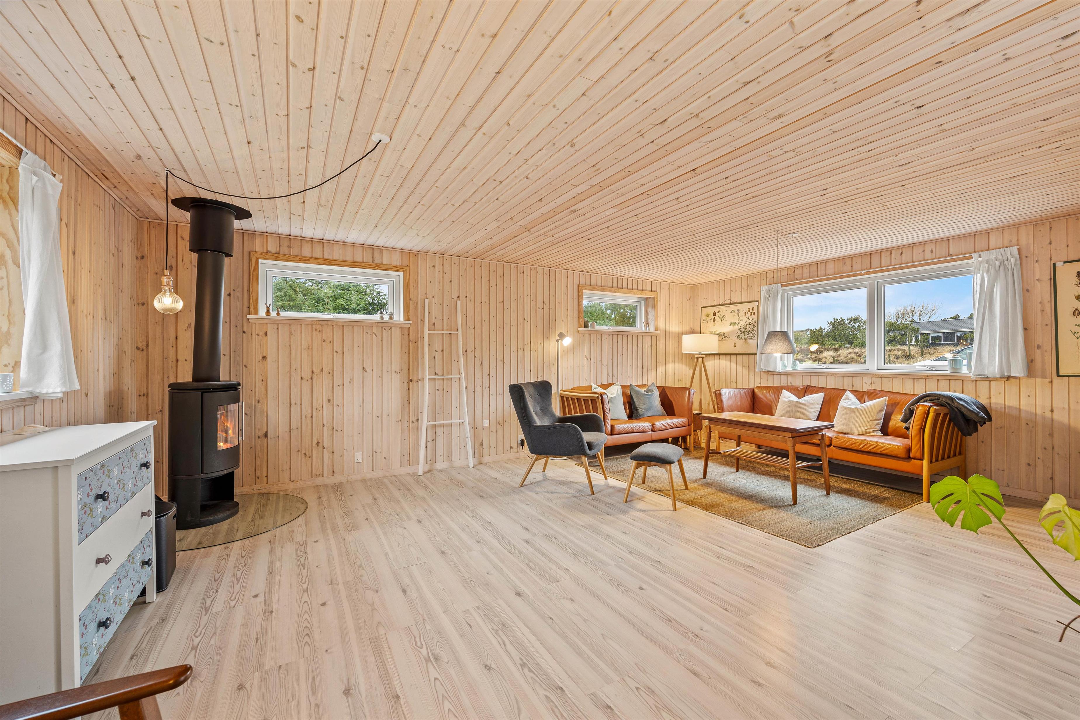 Stilfuld indretning med brændeovn og sauna