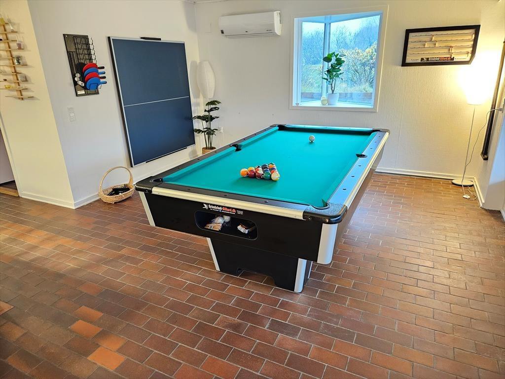 Et særligt højdepunkt er aktivitetsrummet, hvor der er rig mulighed for leg og sjov – perfekt til børnene eller til en venskabelig dyst mellem voksne. Det store opholdsmiljø er husets naturlige samlingspunkt, hvor I kan nyde måltider, brætspil eller bare afslapning sammen. De store vinduer lader masser af lys strømme ind og giver en skøn udsigt til naturgrunden, mens glasdørene gør det let at træde direkte ud på terrassen, når solen lokker.