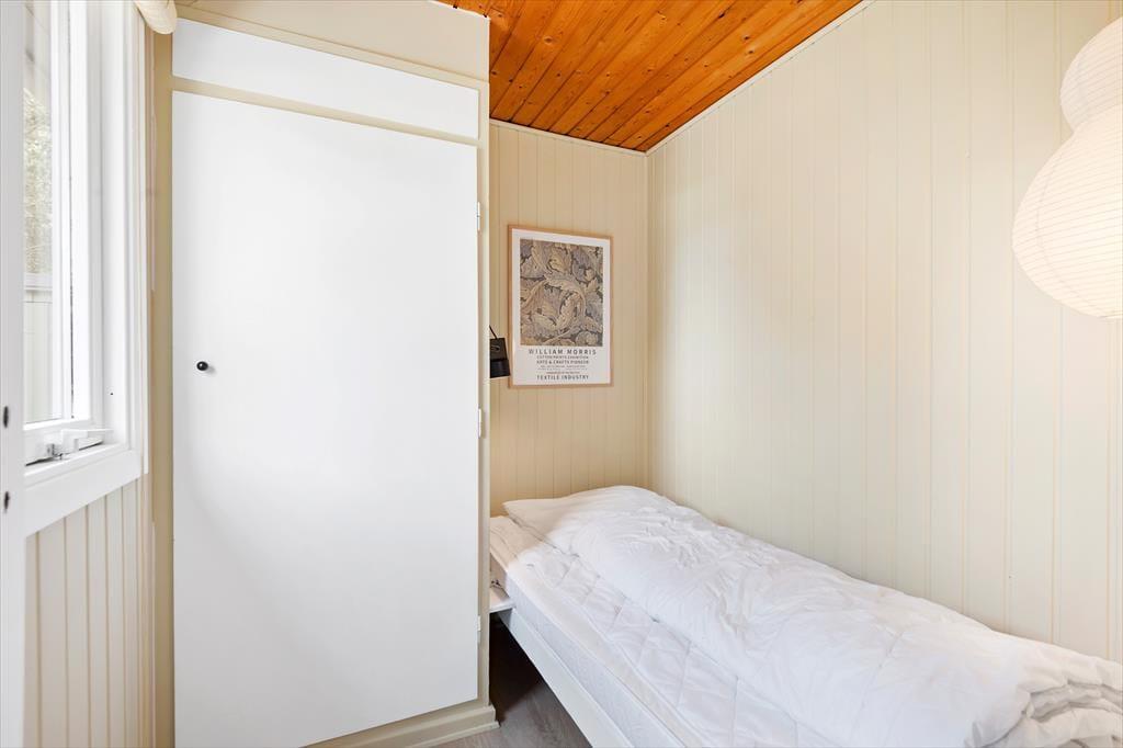 Det klassiske træhus ligger på en stor naturgrund, der har en varieret bevoksning med åbne arealer, tætte hybenbuske og krogede fyrretræer. Her kan du trække vejret dybt ned i lungerne og straks føle dig hjemme, for det er dejlige og velduftende omgivelser at opholde sig i – uanset om du leger med børnene på plænen eller slapper af i en havestol på husets dejlige terrasse. Terrassen er for øvrigt helt aflukket med hegn, så du kan drikke kaffe i ret ugenerede omgivelser, og hvis børnene er små, er det rart at vide, at de har en tryg ramme at hygge sig i.