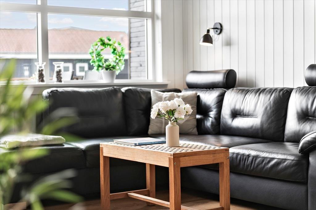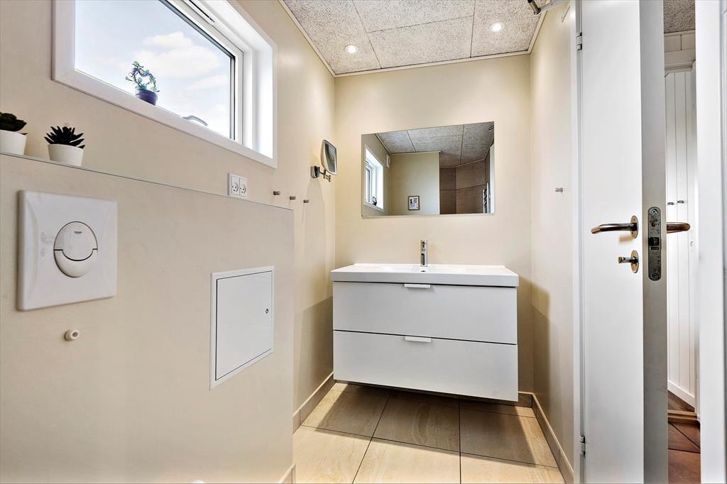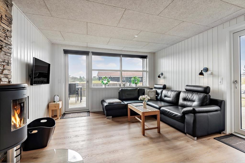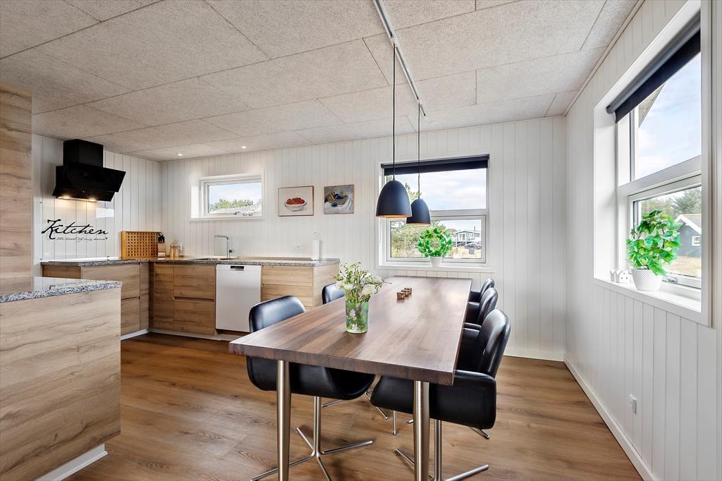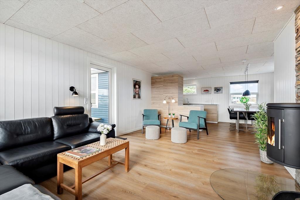 Sommerhusets badeværelse og de tre soveværelser er alle pæne rum, men det bedste er nu opholdsrummet, hvor køkken og stue ligger samlet. Her kan du hygge dig i lyse og komfortable rammer, hvad enten du trænger til at ligge på sofaen nær brændeovnen, slappe af i lænestolen med en bog eller sidde rundt om spisebordet med brætspil og popcorn. Vil du have andet end snacks at spise, kan du glæde dig til at finde råvarerne frem fra køleskabet i det elegante køkken – her er der ovn i ståhøjde, emhætte over komfuret og alt det andet, der gør feriemadlavningen til en leg.