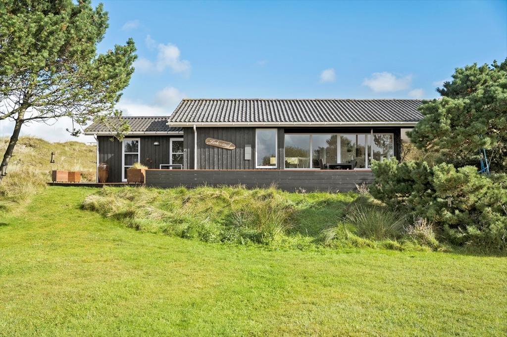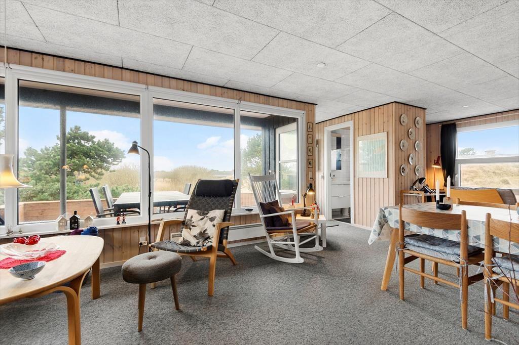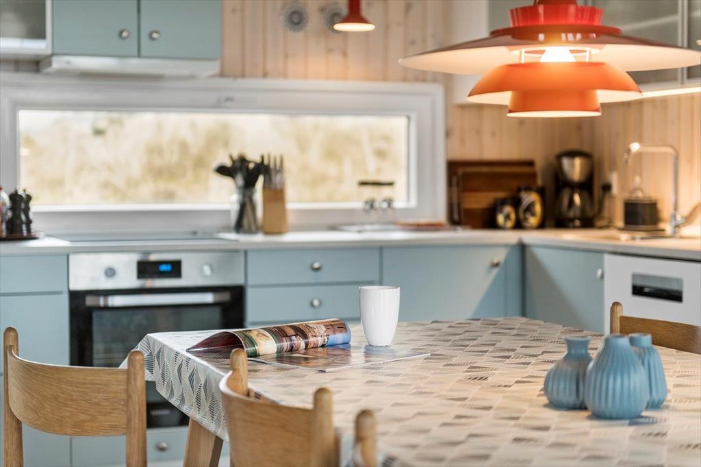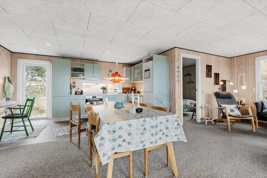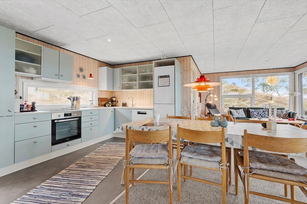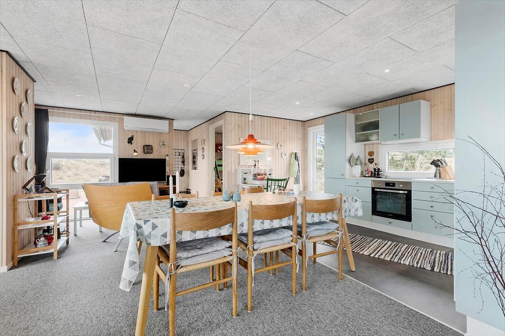 Sommerhuset har en dejlig placering i klitterne, så du kan se lige ud på bølgende marehalm og krogede fyrretræer, men også videre ud over området. Særligt i stuen sørger de store vinduer for at invitere lyset og naturen indenfor, og selvom du slapper af inden døre, bliver du stadig mindet om, at du er på ferie langt væk fra hverdagens trummerum. Både sofaafdelingen og spisebordet er hyggelige samlingspunkter, og hvis I er flere i familien, der kan lide at lave mad, kan I sagtens stå flere i det åbne køkken, når der skal skæres sprød salat eller laves velduftende gryderetter.