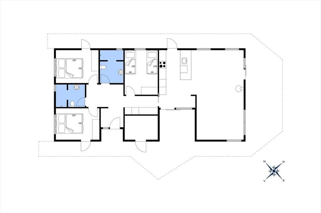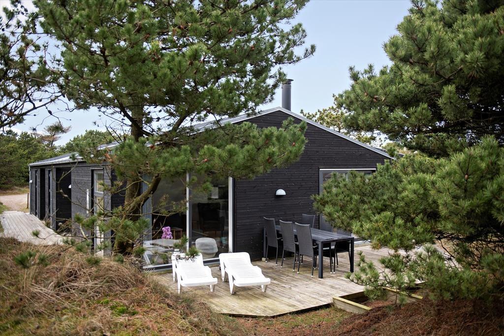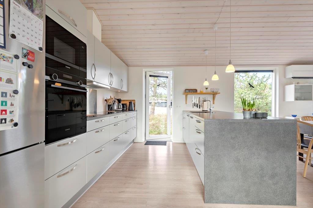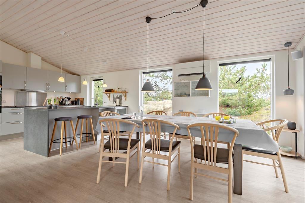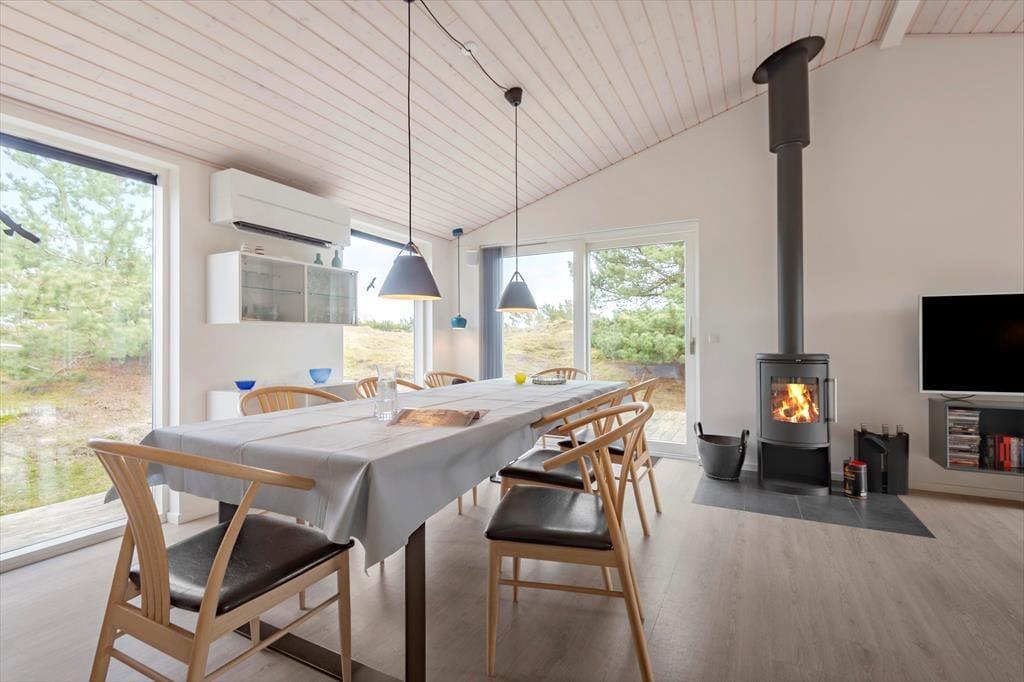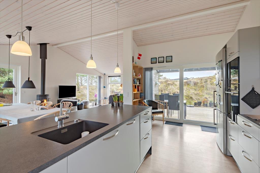 Sommerhusets planløsning er gennemtænkt, så både nattesøvnen, morgenbadet og de sociale stunder kan udspille sig i skønne omgivelser. I den ene ende af huset ligger tre gode soveværelser og to pæne badeværelser samlet – det vil sige, at du har mulighed for at trække dig tilbage for at sove, selv hvis de andre skulle have lyst til at blive længe oppe for at høre musik og spille spil i opholdsafdelingen. Når I alle sammen hygger jer her, har I god plads til både sofaafslapning og lækre middage såvel som madlavning i det åbne og veludstyrede køkken. Der er brændeovn i det lyse og højloftede rum, og de store vinduespartier sørger for, at både solen og naturen bliver inviteret helt indenfor.