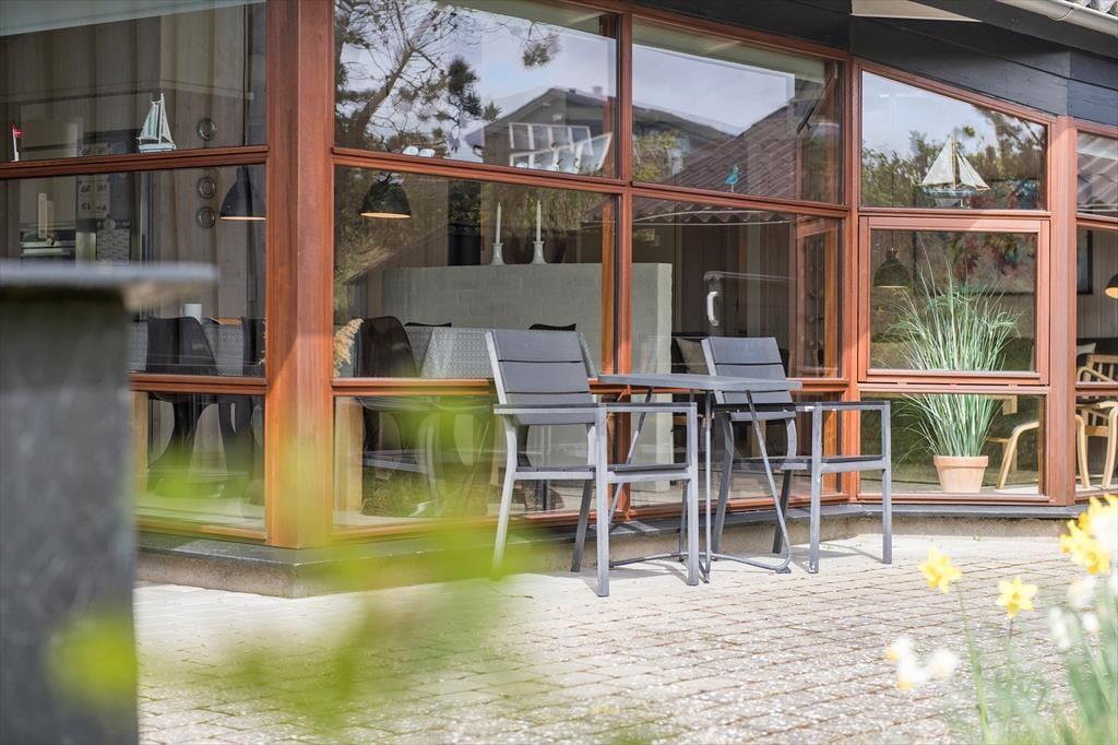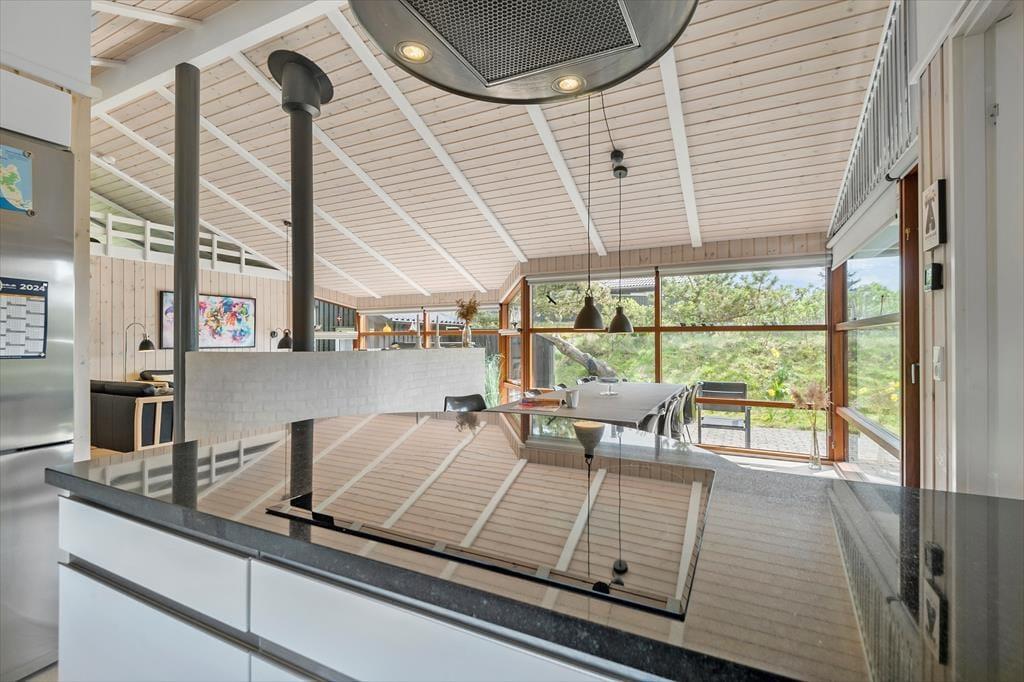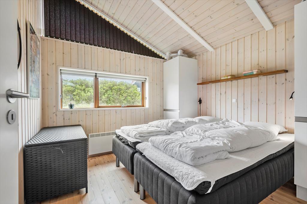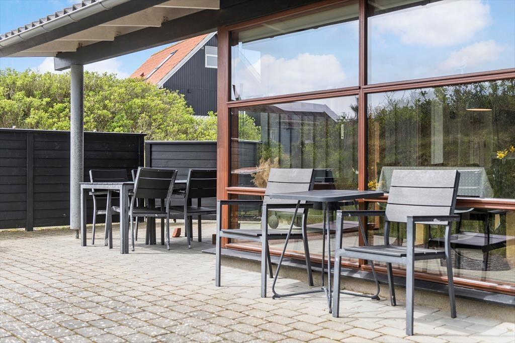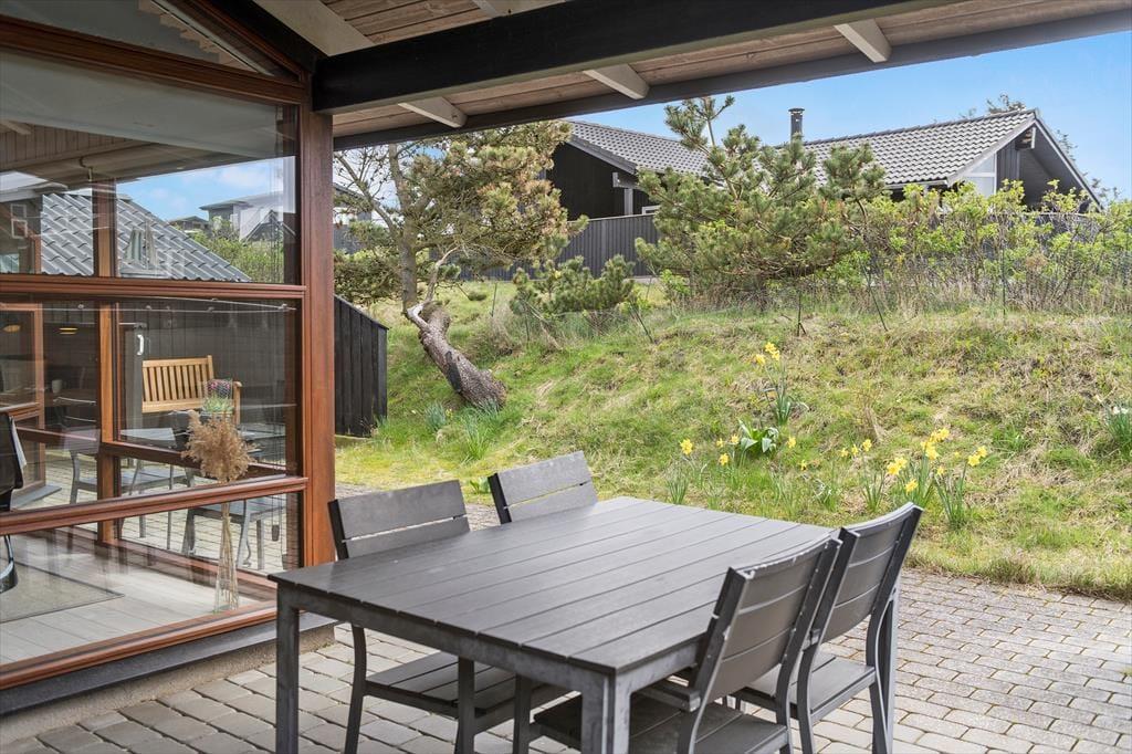 Sommerhusets terrassemiljø byder på flere gode opholdspladser, så du bestemmer selv, om du vil sidde under åben himmel eller rykke ind under overdækningen. Et hegn i træ skærmer af ud mod vejen, og den kuperede naturgrund er med til at give dig fornemmelsen af, at du sidder uforstyrret i en lille gryde, når du slikker sol, får en middagslur eller griller med familien. Til de alleryngste feriegæster er der en sandkasse, hvis I ikke smutter ned på stranden for at bygge sandslotte og lege på de åbne vidder. I så fald kan du sagtens lade bilen stå ved huset, for selv med små børn i hånden, kan du hurtigt være fremme ved Vesterhavet.