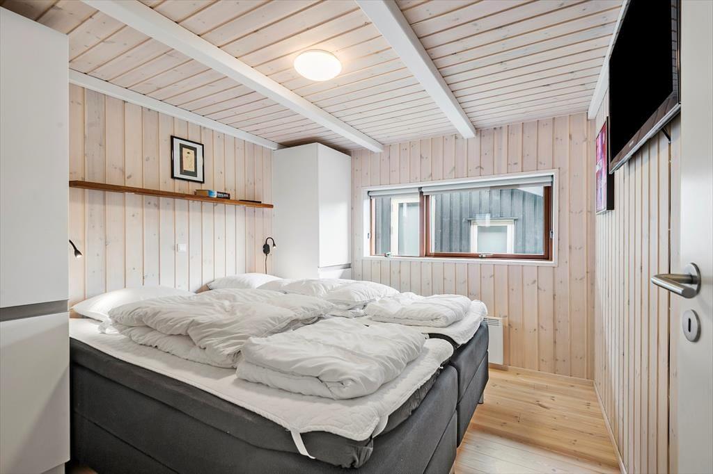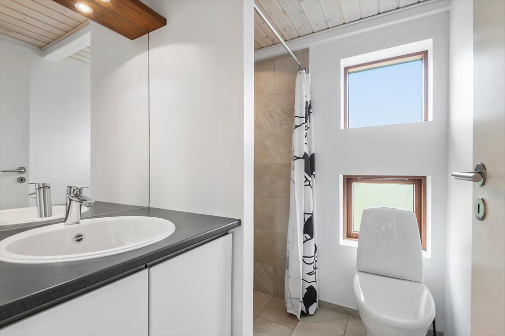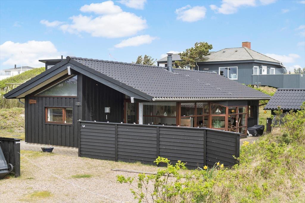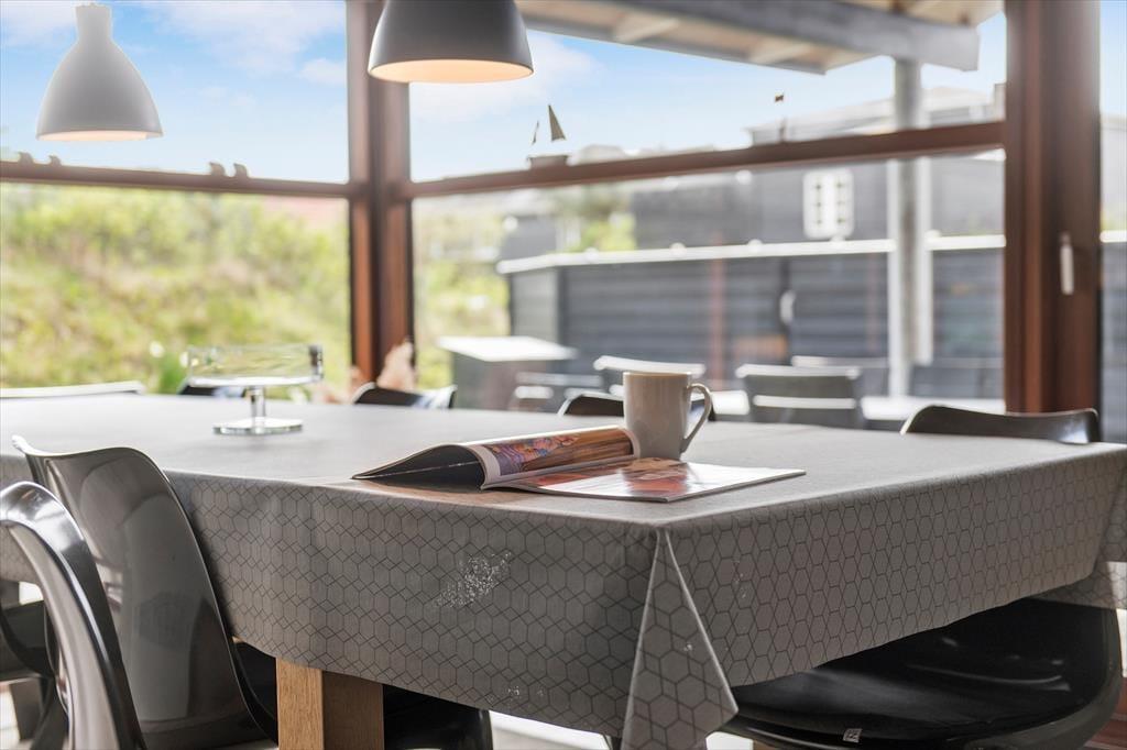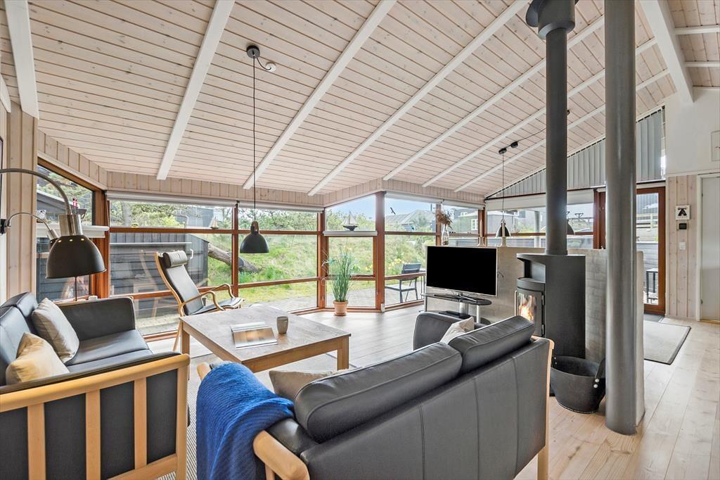 Sommerhusets terrassemiljø byder på flere gode opholdspladser, så du bestemmer selv, om du vil sidde under åben himmel eller rykke ind under overdækningen. Et hegn i træ skærmer af ud mod vejen, og den kuperede naturgrund er med til at give dig fornemmelsen af, at du sidder uforstyrret i en lille gryde, når du slikker sol, får en middagslur eller griller med familien. Til de alleryngste feriegæster er der en sandkasse, hvis I ikke smutter ned på stranden for at bygge sandslotte og lege på de åbne vidder. I så fald kan du sagtens lade bilen stå ved huset, for selv med små børn i hånden, kan du hurtigt være fremme ved Vesterhavet.