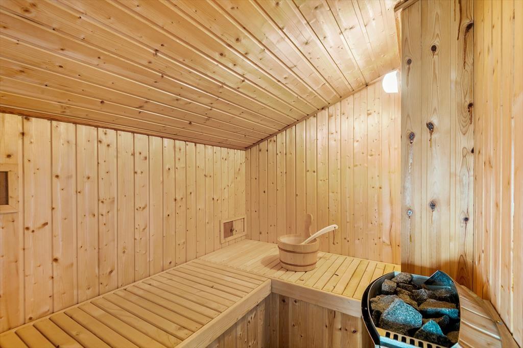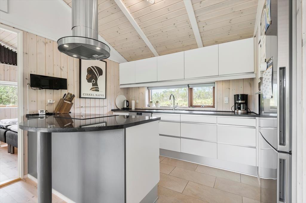 Spabadet og saunaen ligger som del af det største af husets to badeværelser – og netop wellnessbadeværelset har et skønt maritimt look med mørke maghonipaneler. Det er bare ét af de gennemførte stiltræk, der viser den høje kvalitet, som hele huset emmer af. Køkkenet er et andet eksempel, og hvis du kan lide at lave mad, kan du se frem til at trylle små og store måltider frem i de velordnede rammer. Trænger du mest af alt til at sidde i en god sofa med strikketøjet eller en spændende bog, kan du slå dig ned i stuens sofaafdeling, tæt på brændeovnen og med udsigt til den bakkede naturgrund. Hvis du sidder roligt længe nok, vil områdets fasaner måske kigge forbi på terrassen, for de kan nemlig også lide Rindbys naturskønne omgivelser.