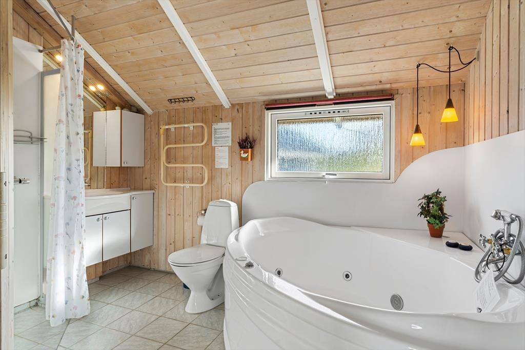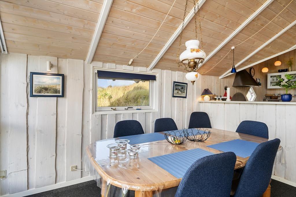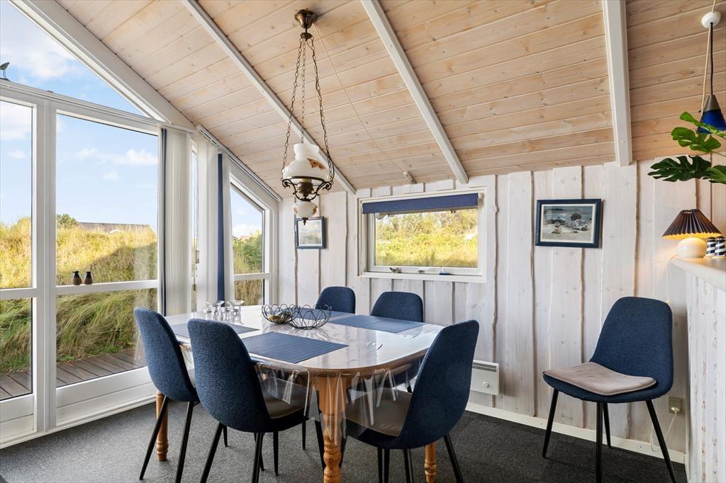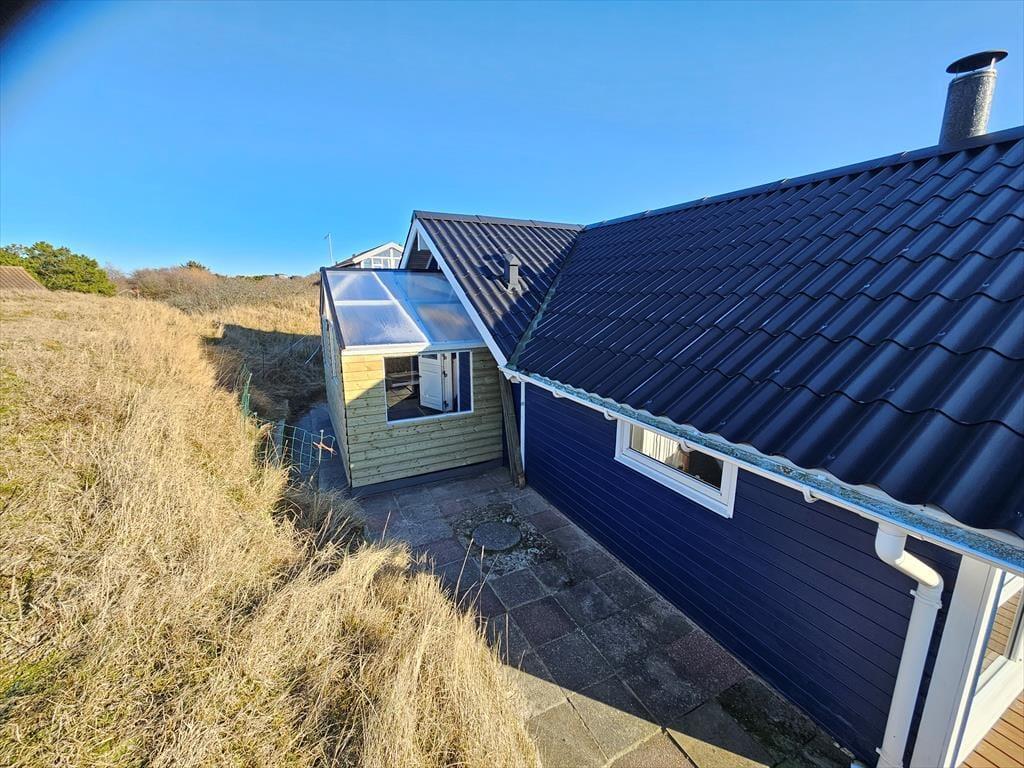 Dette hyggelige sommerhus har en rigtig fin beliggenhed, for det ligger roligt mellem klitterne på en dejlig klitgrund, bare fem minutters gang fra Rindby Strand. Det gør det nemt at smutte ned for at hilse på Vesterhavet – og alt efter vejret kan du sole dig på terrassen eller gå i spabad og sauna, så snart du vender hjem til ferieadressen.