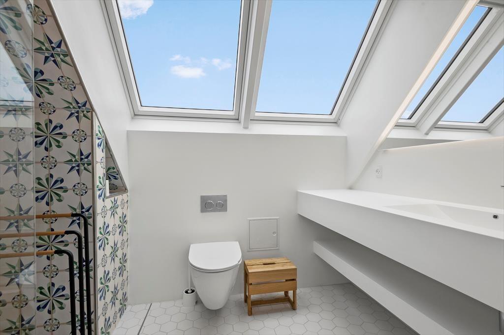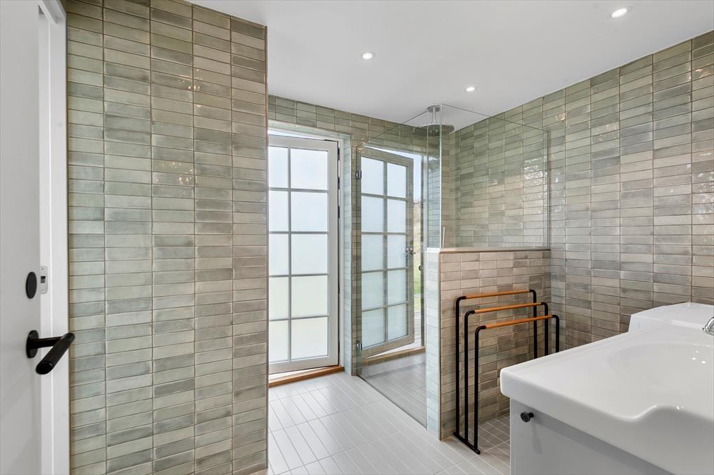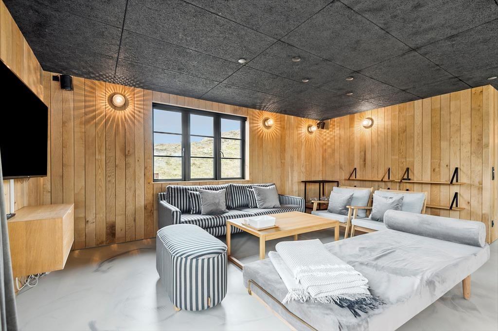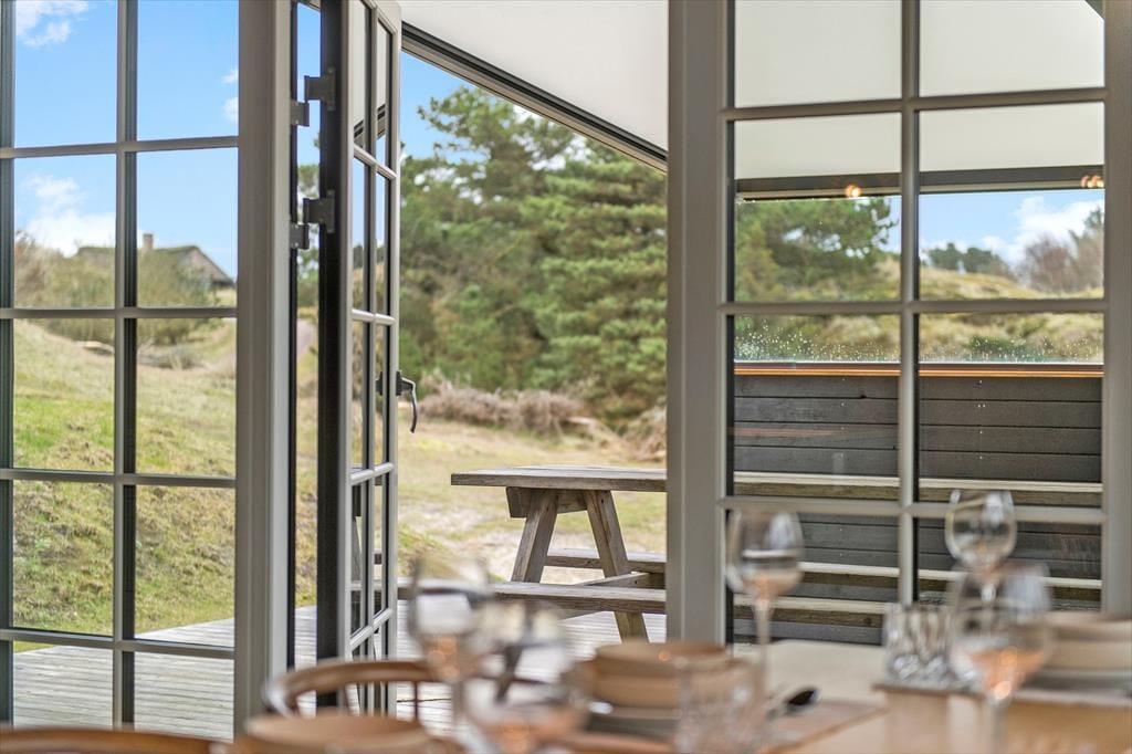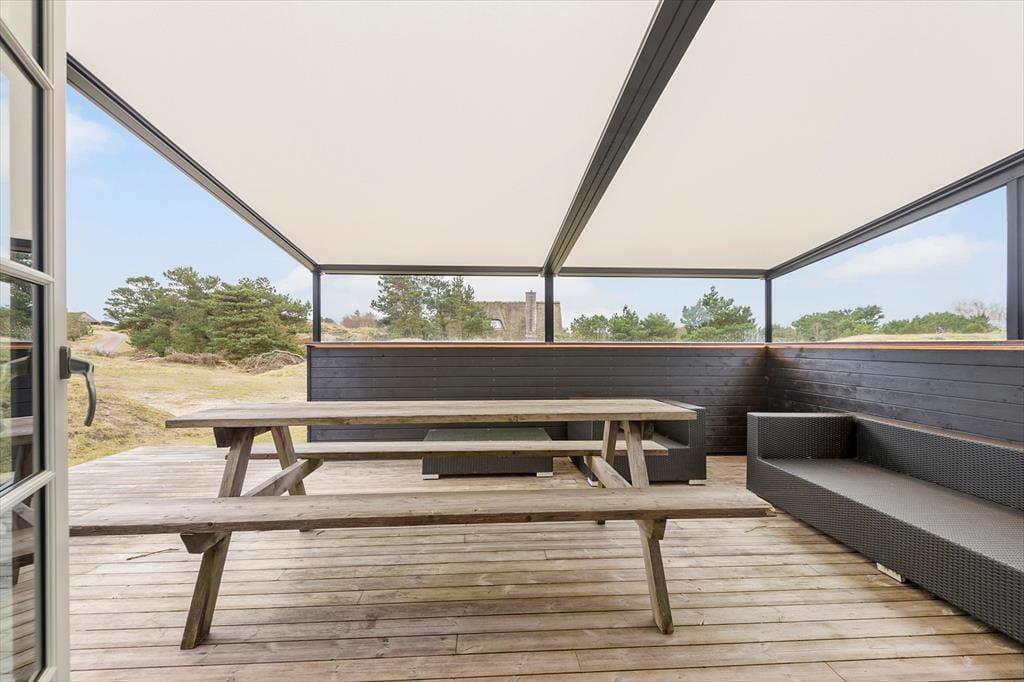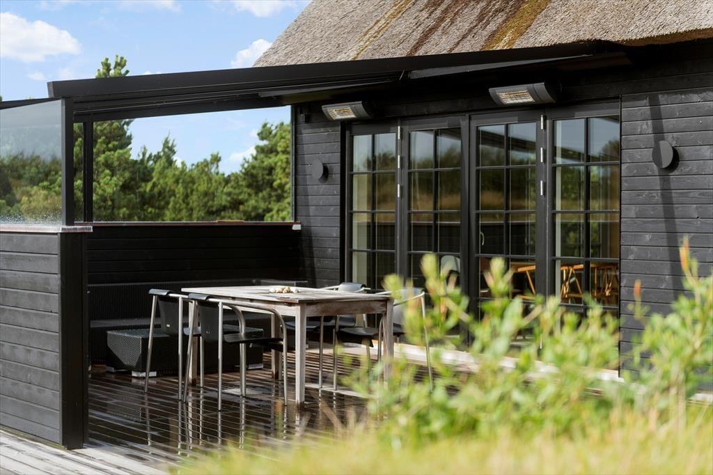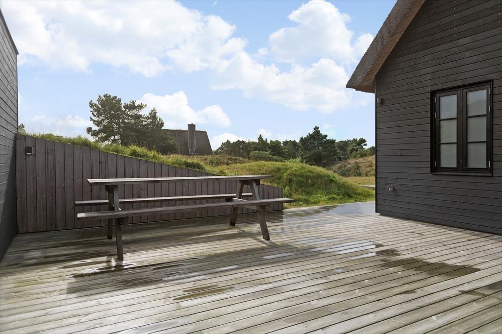 Det høje niveau kan også mærkes ude i det fri, hvor et flot terrassemiljø breder sig rundt om huset. Den sydvendte terrasse med terrassevarmere, er skærmet godt af mod vest, og øst for sommerhuset venter endnu et solrigt areal, hvor du og dine kære kan dase i ugenerede rammer. På den sydvendte facade finder du en udendørs bruser – her kan du for eksempel tage et morgenbad, mens du kigger ud over den kuperede klitgrund og mærker dagen langsomt begynde. Sommerdagene kan også passende slutte ude i det fri, hvor du kan finde lækre råvarer frem og tilberede dem på gasgrillen nær et smukt dækket havebord.