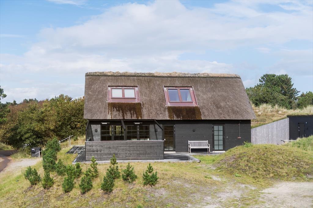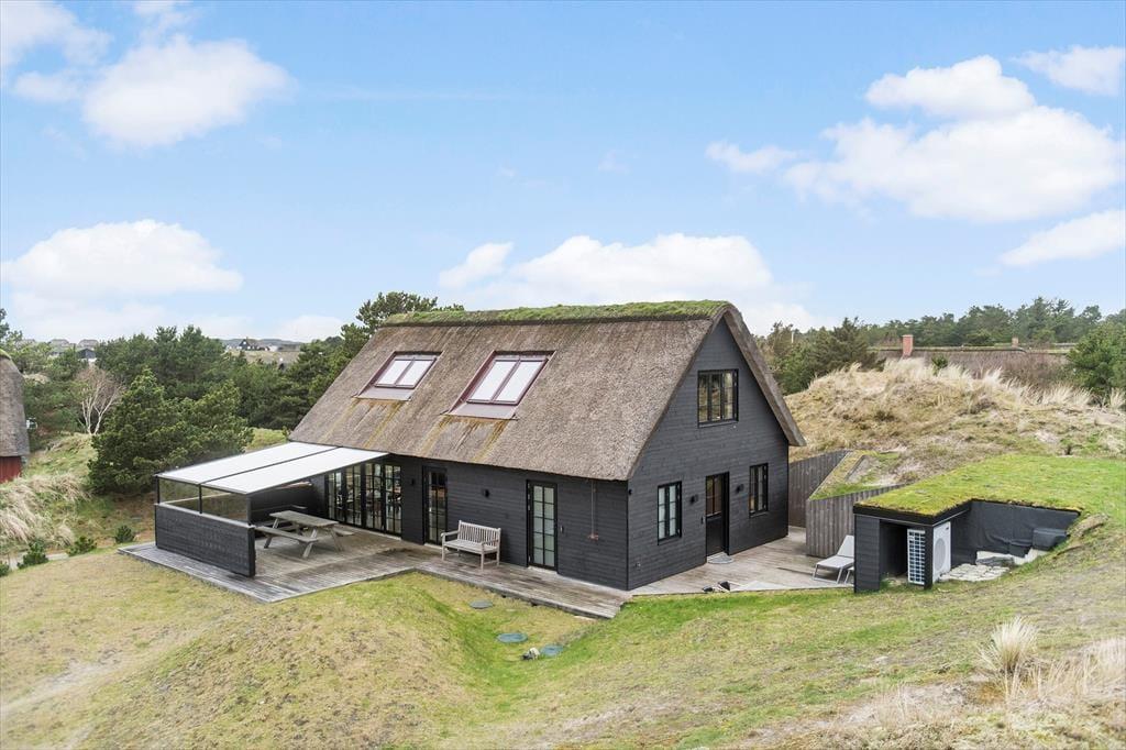 Dette stråtækte træhus har en elegant arkitektur og en utrolig stilfuld indretning – og beliggenheden på en stor klitgrund bare få hundrede meter fra Rindby Strand er selvfølgelig også med til at pynte på det hele.
