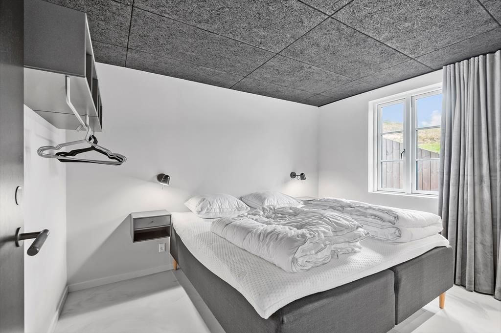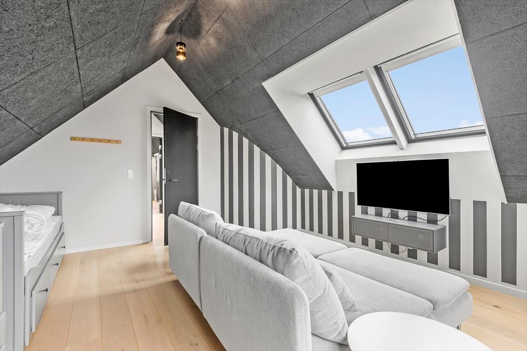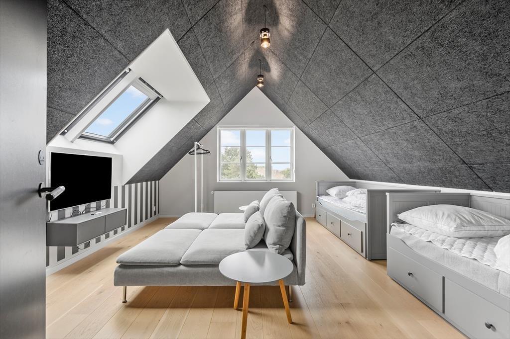 Sommerhuset er opført i 2023, og inden døre får du hele 140 velafstemte kvadratmeter at folde ferielivet ud på. Alt, lige fra det lysegrå gulv til det mørkere akustikloft viser, at der er taget sikre, smagfulde valg, når det gælder indretningen – se bare den smukt buede trappe, der forbinder stueetagen med førstesalen. En stor del af stueetagen er dedikeret til det flotte opholdsrum, hvor du kan samle familien til hyggelige madlavningsstunder, lækre middage og tilbagelænet sofaafslapning. Soveværelset og badeværelset i stueplan fungerer som den oplagte forældreafdeling, og på førstesalen venter yderligere to soveværelser og et badeværelse, der er holdt i samme gennemførte stil.