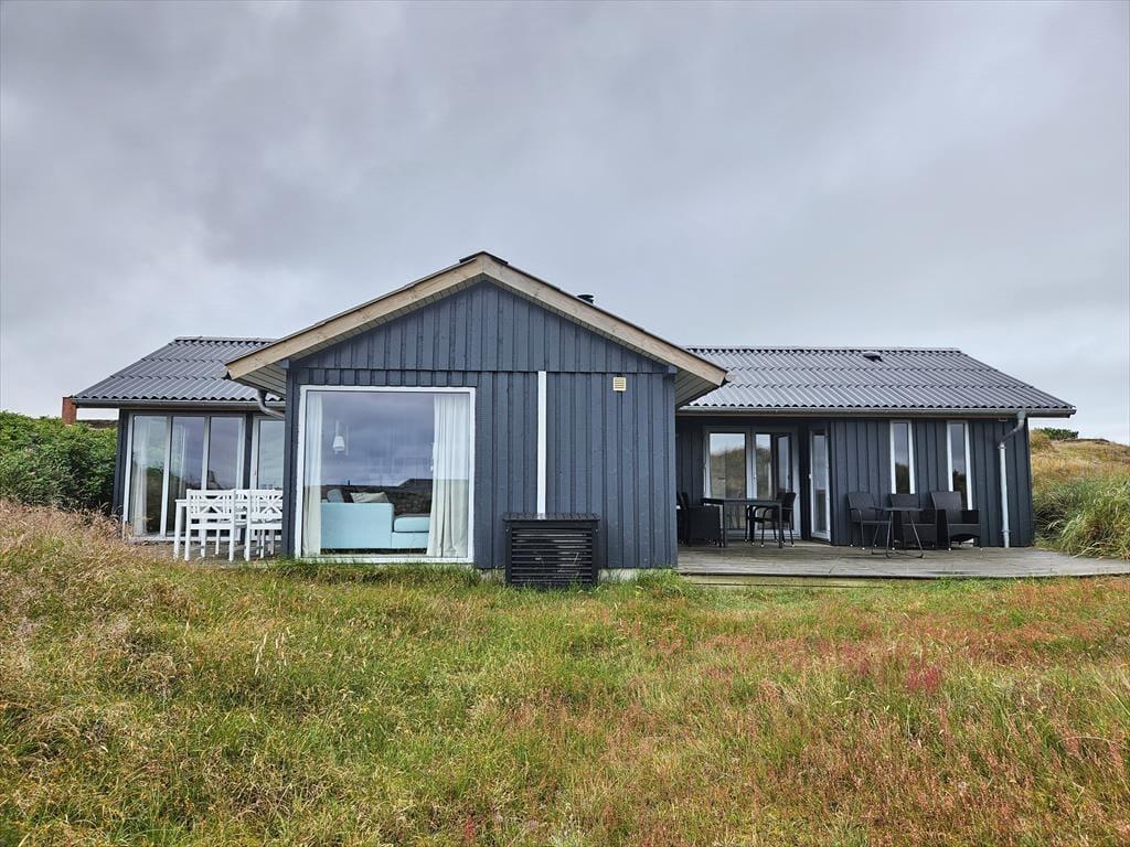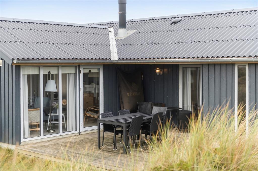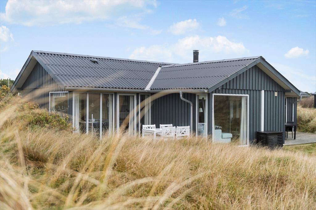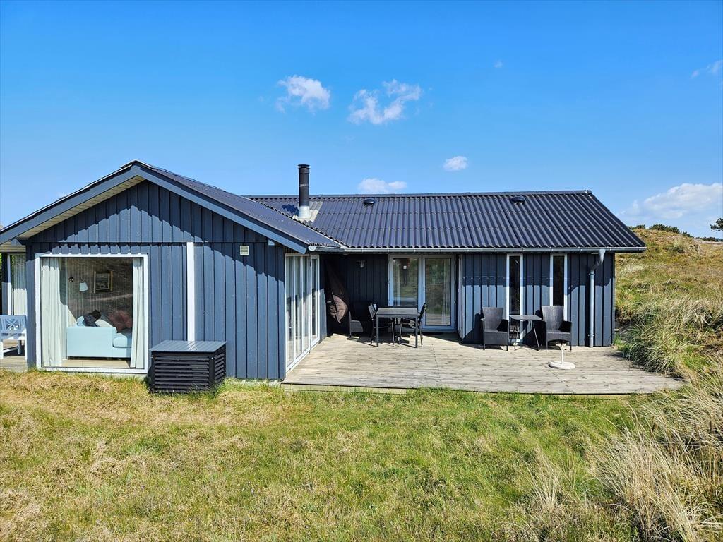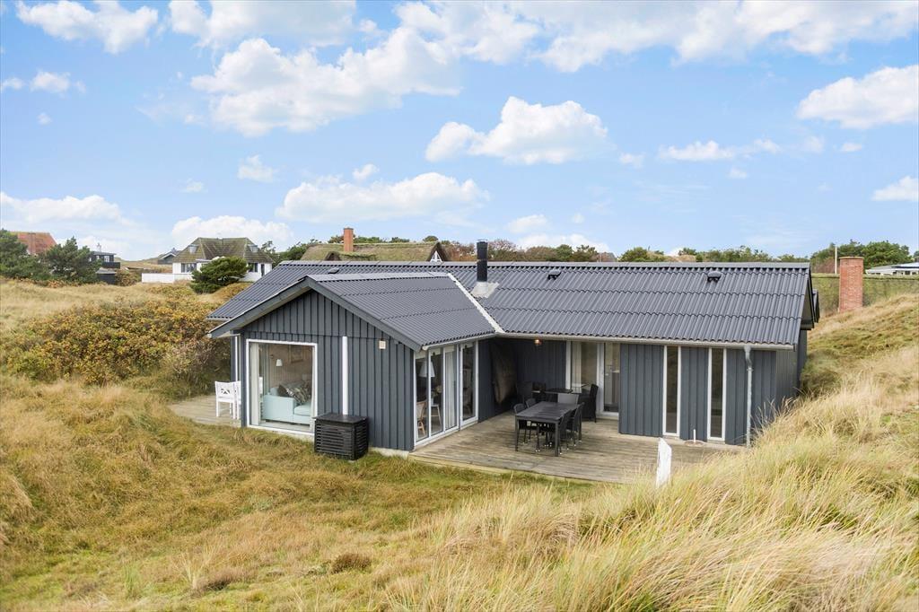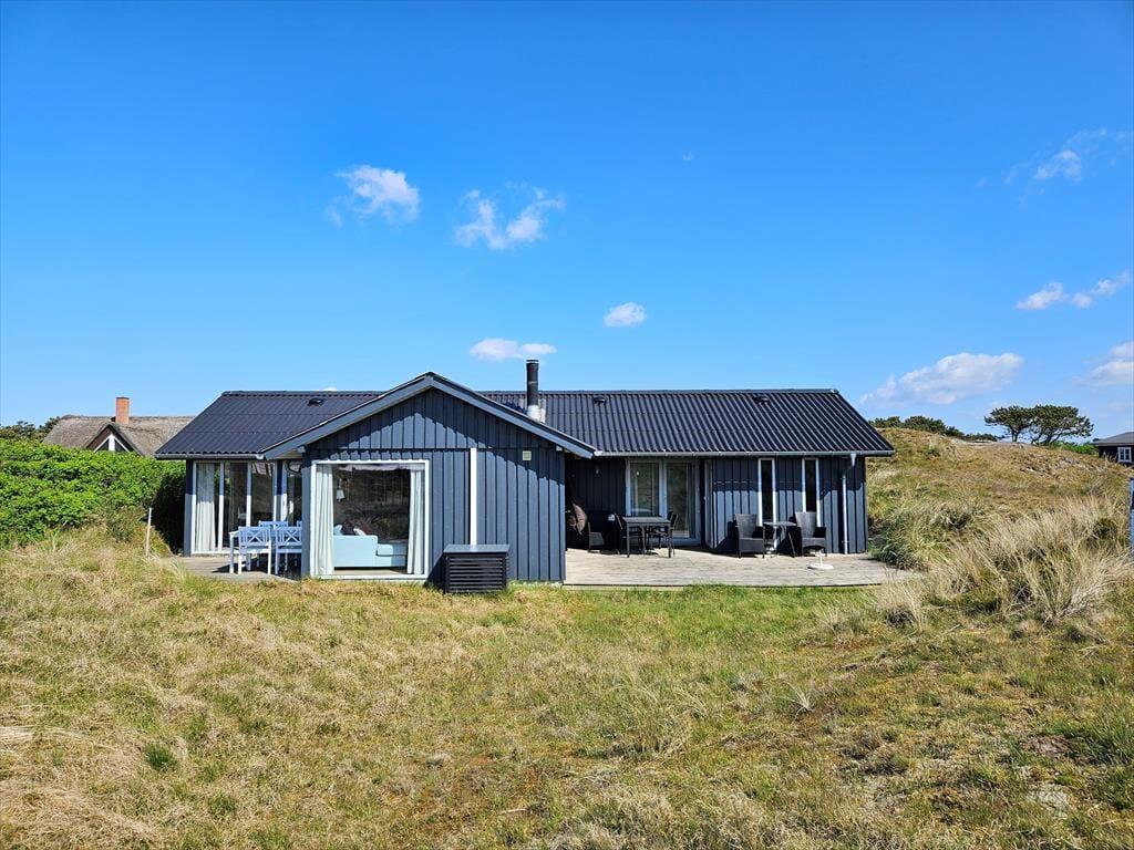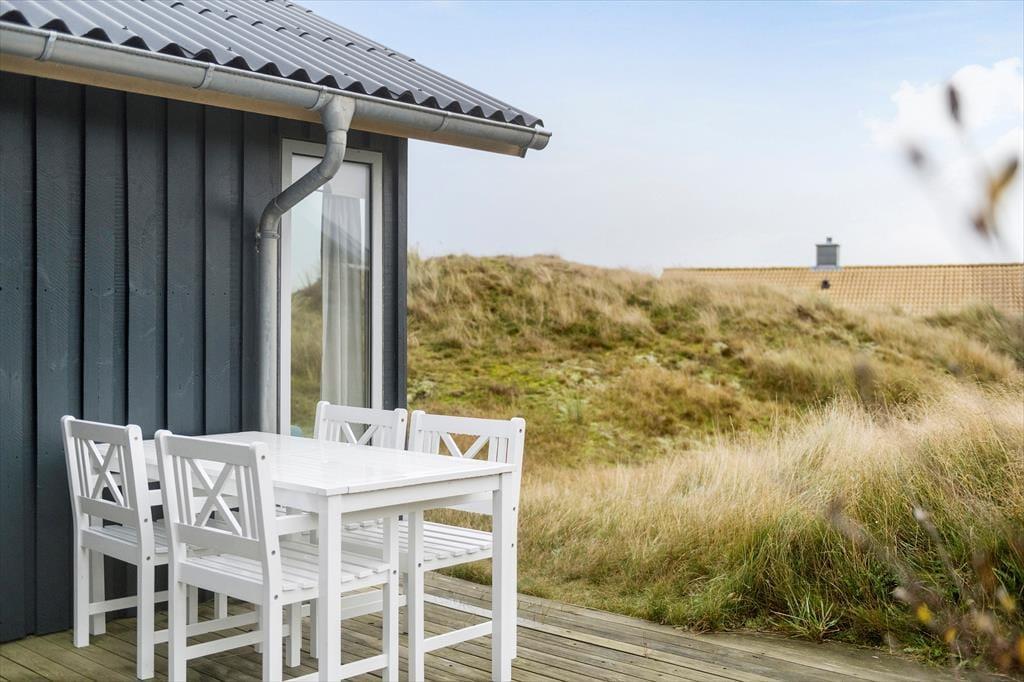 Naturgrundens klitter danner en smuk og ugeneret ramme om feriens udendørs driverliv – og hvis en brise kommer ind fra havet, er de også med til at sørge for læ. Rundt om huset er der flere terrasser at vælge imellem, når du vil solbade, læse krimier i en liggestol eller tilberede aftensmaden på havegrillen, og det er selvfølgelig også nærliggende, at alle måltider skal indtages herude i det fri, når sommeren er på sit højeste. Ud mod vejen er der god plads til at stille bilen på husets parkeringsareal – ja, der er sågar plads til to biler, hvis du har inviteret vennerne til at komme forbi til en god frokost.