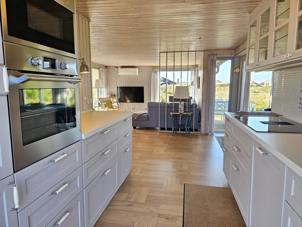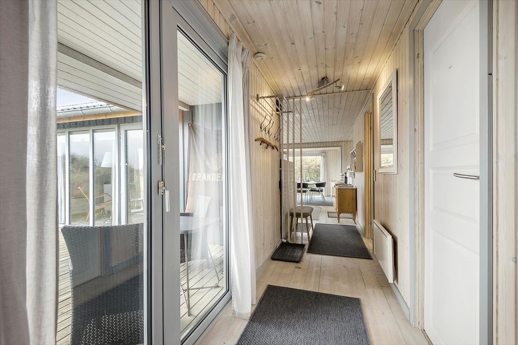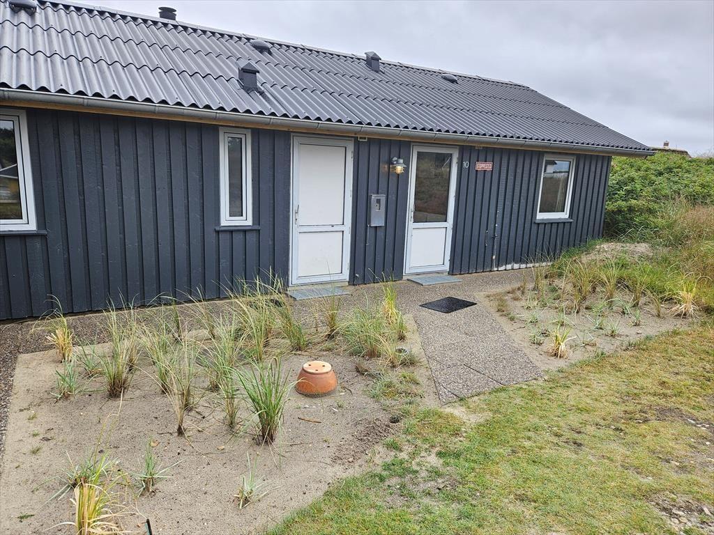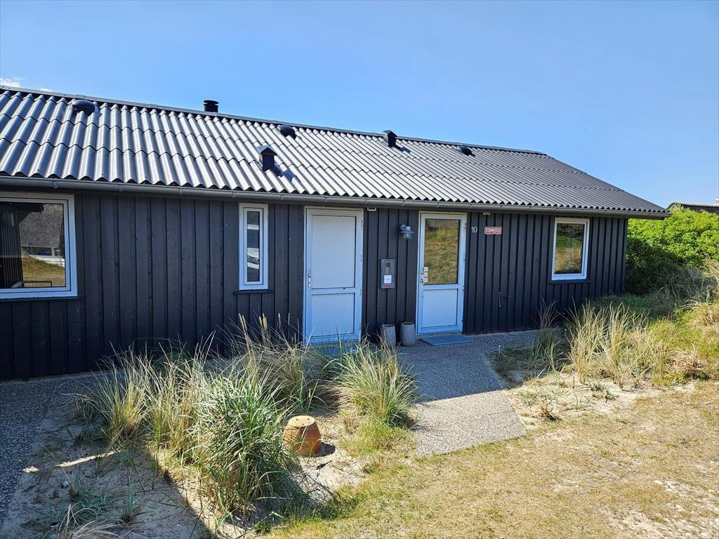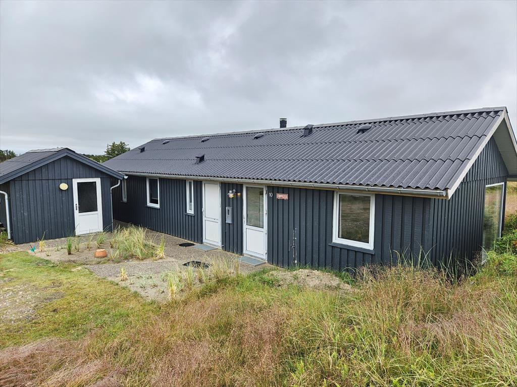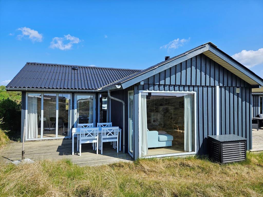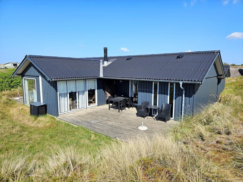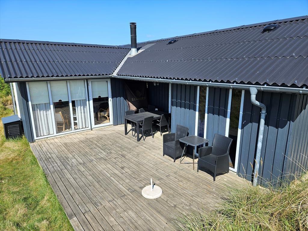 Naturgrundens klitter danner en smuk og ugeneret ramme om feriens udendørs driverliv – og hvis en brise kommer ind fra havet, er de også med til at sørge for læ. Rundt om huset er der flere terrasser at vælge imellem, når du vil solbade, læse krimier i en liggestol eller tilberede aftensmaden på havegrillen, og det er selvfølgelig også nærliggende, at alle måltider skal indtages herude i det fri, når sommeren er på sit højeste. Ud mod vejen er der god plads til at stille bilen på husets parkeringsareal – ja, der er sågar plads til to biler, hvis du har inviteret vennerne til at komme forbi til en god frokost.