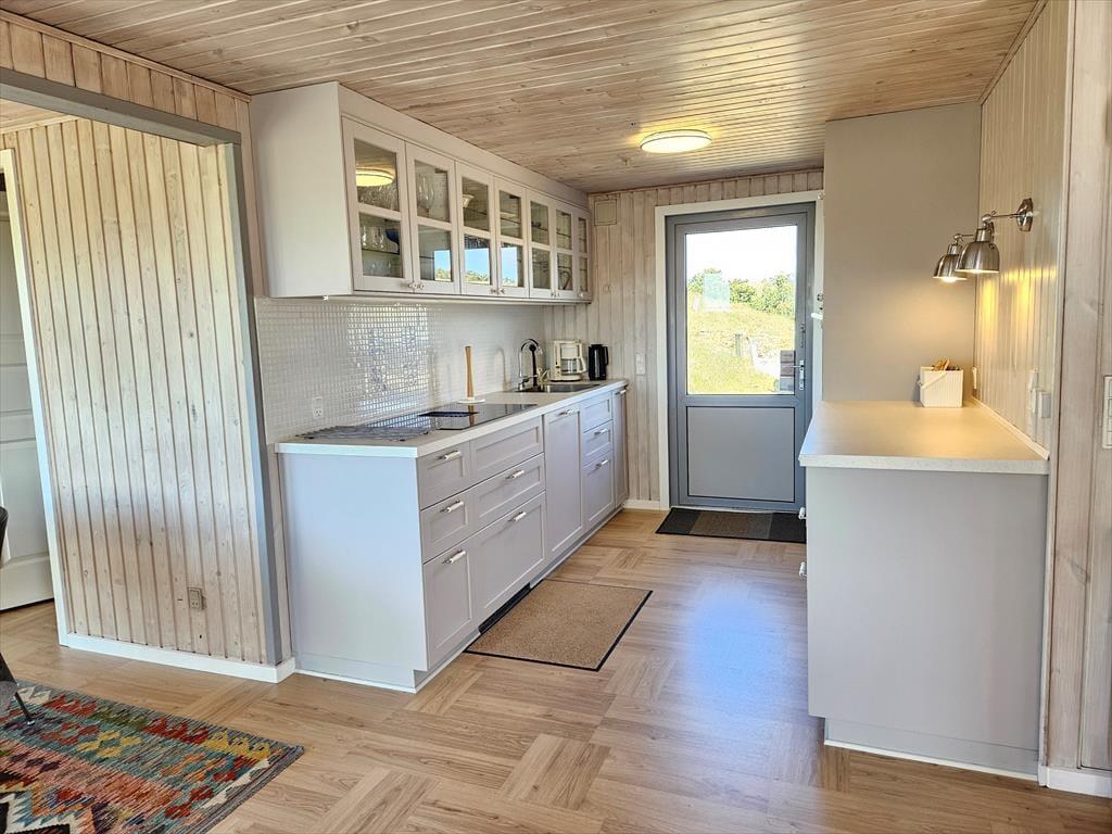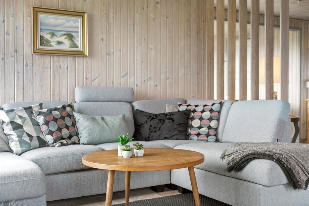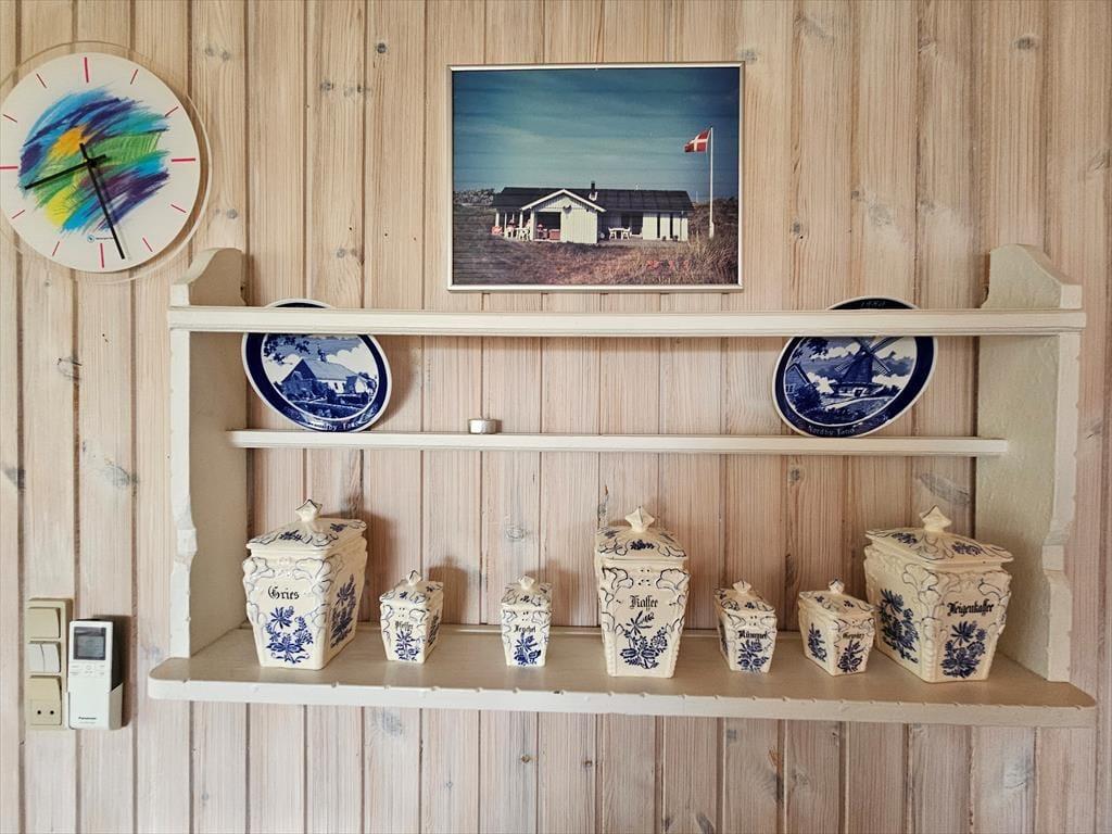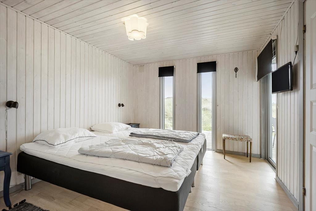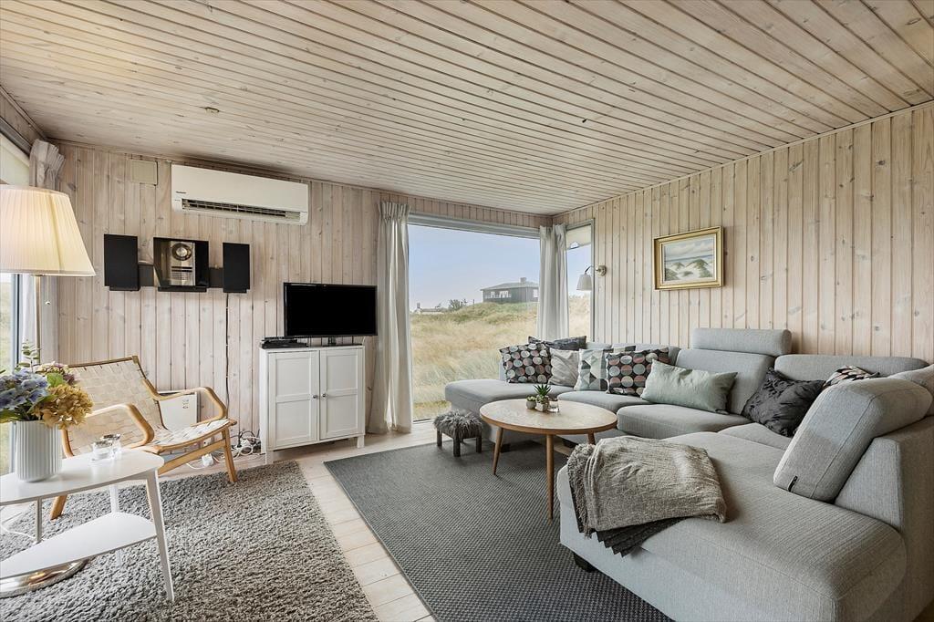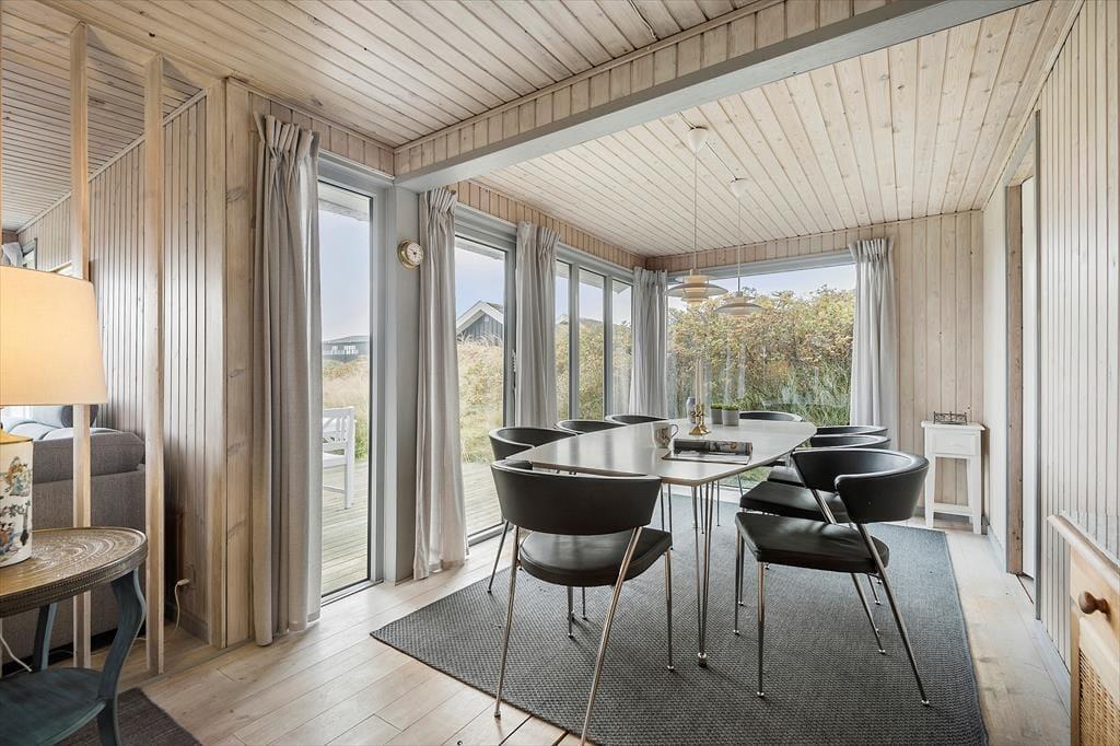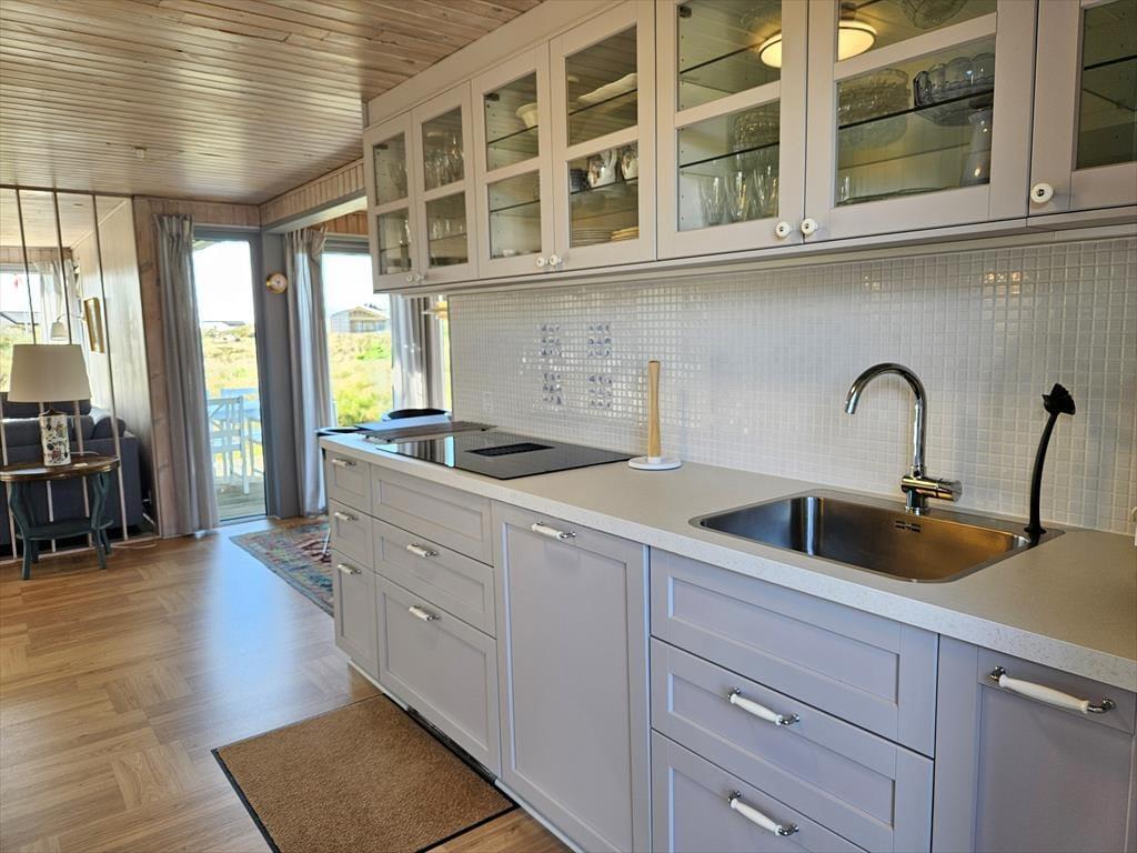 Naturgrundens klitter danner en smuk og ugeneret ramme om feriens udendørs driverliv – og hvis en brise kommer ind fra havet, er de også med til at sørge for læ. Rundt om huset er der flere terrasser at vælge imellem, når du vil solbade, læse krimier i en liggestol eller tilberede aftensmaden på havegrillen, og det er selvfølgelig også nærliggende, at alle måltider skal indtages herude i det fri, når sommeren er på sit højeste. Ud mod vejen er der god plads til at stille bilen på husets parkeringsareal – ja, der er sågar plads til to biler, hvis du har inviteret vennerne til at komme forbi til en god frokost.