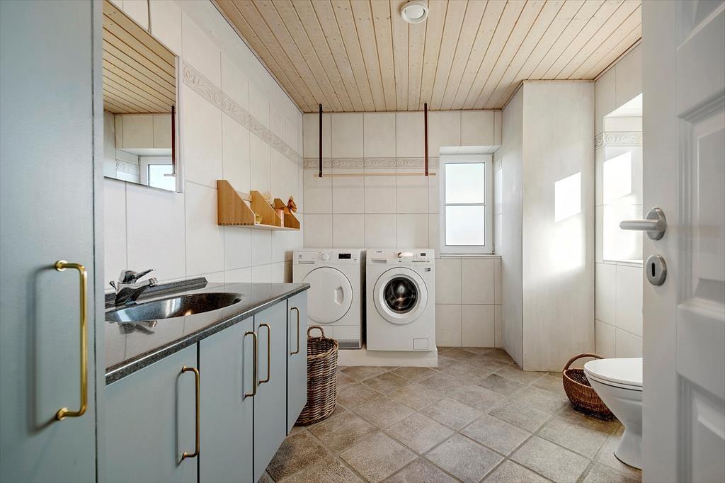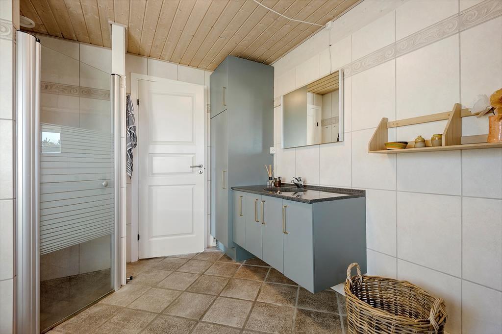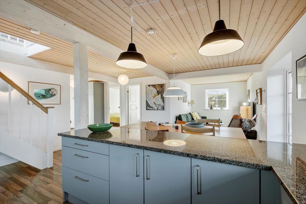 Sommerhuset er fyldt med mange lækre og moderne detaljer, der gør ferieopholdet ekstra rart – blandt andet stuens komfortable flydersofa og det flotte køkken såvel som genveksanlægget, der sørger for et behageligt indeklima. Stue og køkken ligger i åben forbindelse, og hvis alle gerne vil bidrage til madlavningen, kan I sagtens hjælpe hinanden med at skære salat og røre i gryderne. Spisebordet er et skønt sted at samles, når maden står klar, og hvis I ikke bliver siddende for at spille kort eller bare hyggesnakke efter det lækre måltid, kan I slutte dagen af med at se film i den blødere afdeling. Badeværelset er stort og flot, og når det er ved at være sengetid, har I to gode soveværelser at trække jer tilbage på.