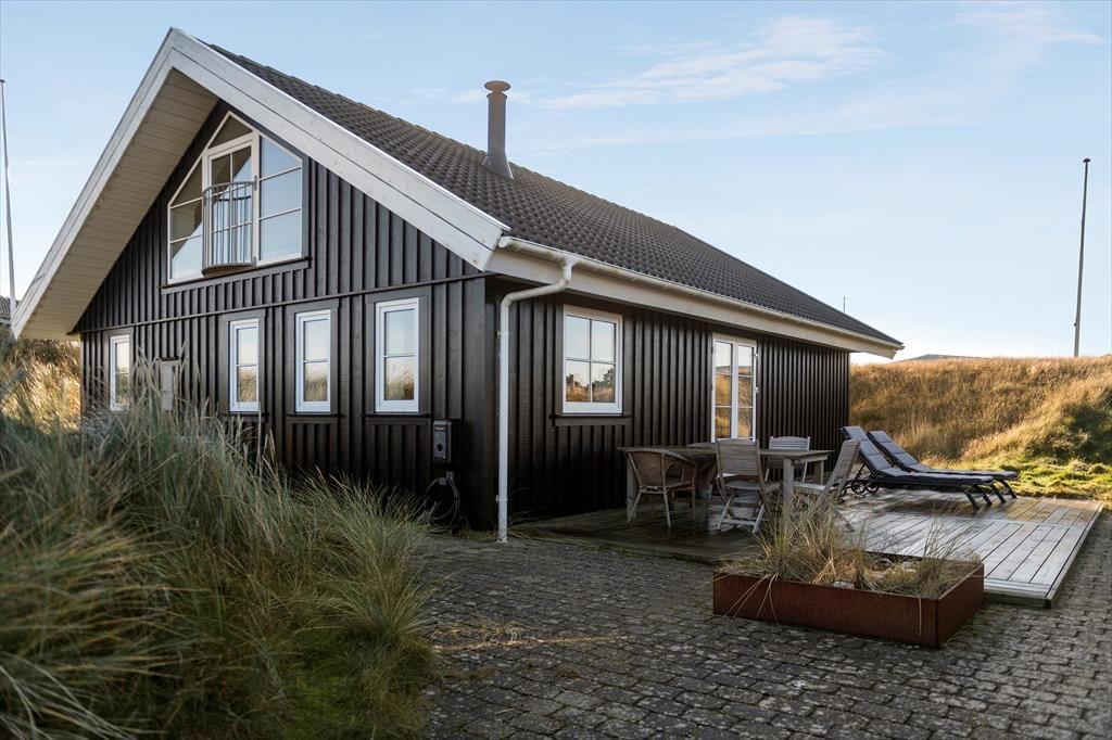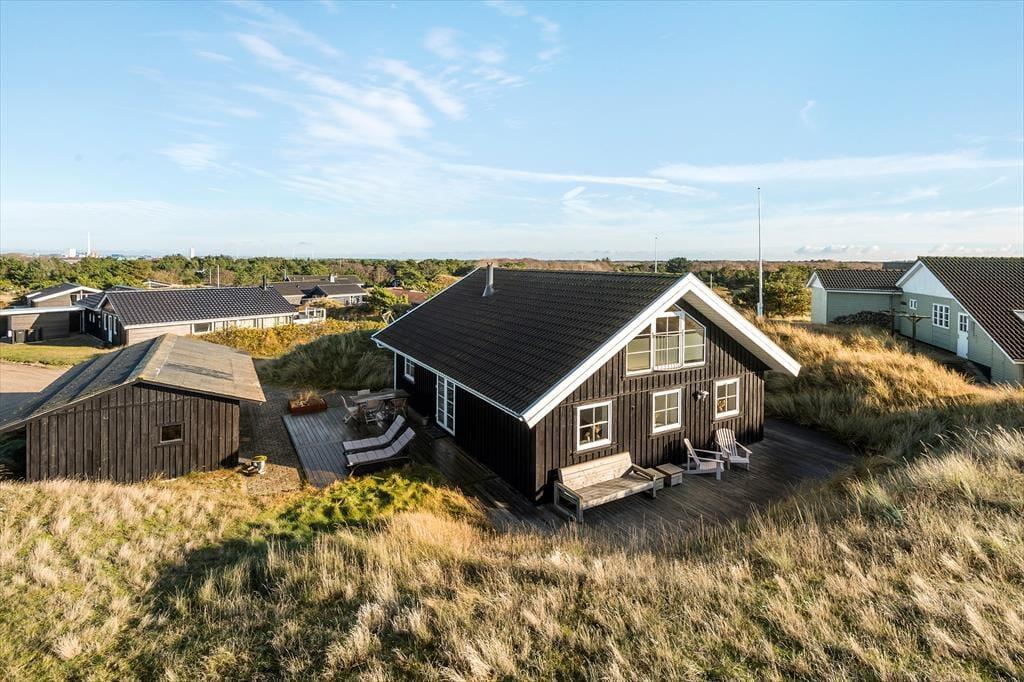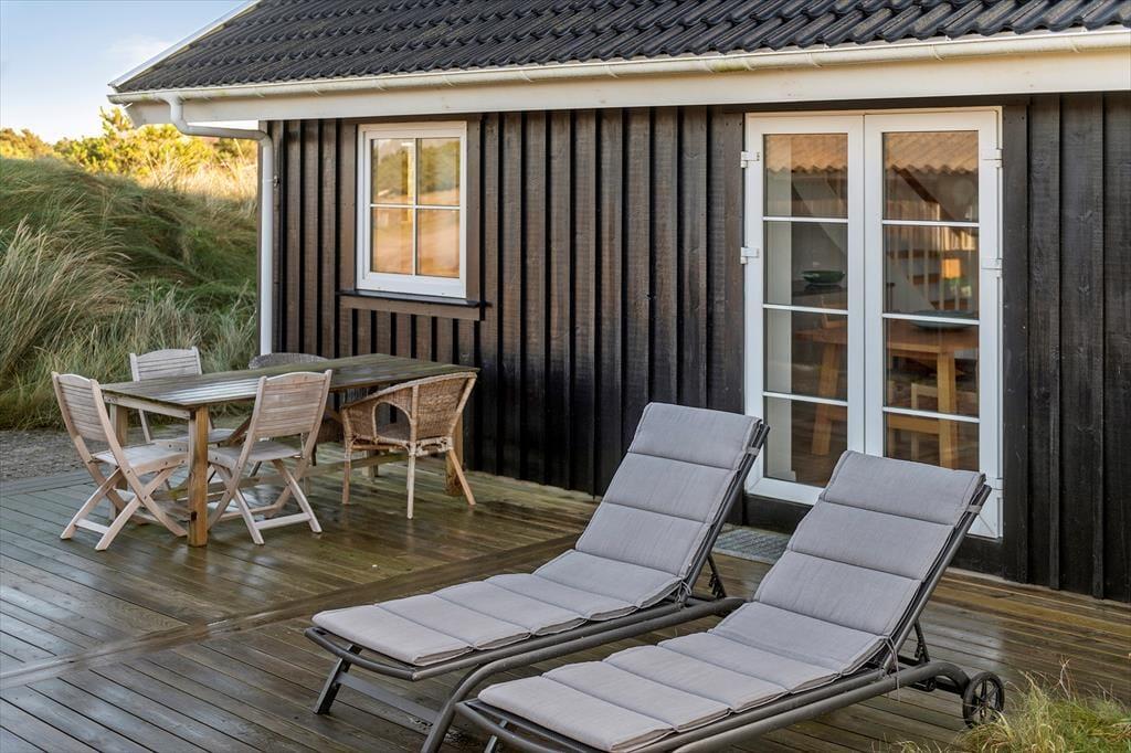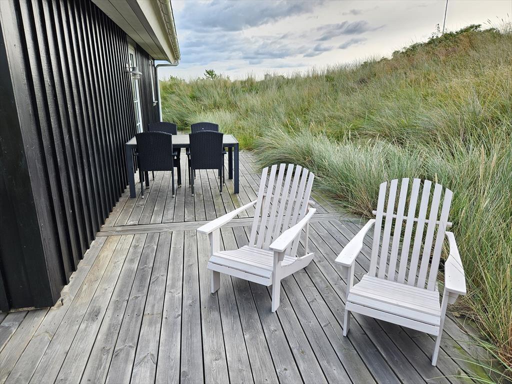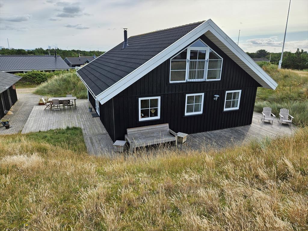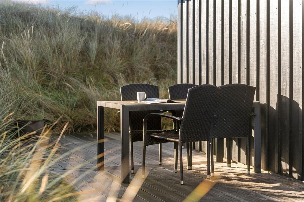 Terrassemiljøet breder sig hele vejen rundt om huset, og naturgrundens klitter er med til at skærme udearealerne af, så der er gode chancer for at finde en opholdsplads med læ. Når du kigger op fra avisen eller din medbragte feriekrimi, er det skønt at kunne kigge ud på bølgende marehalm og himlens drivende skyer – og her for enden af Skrænten er omgivelserne meget fredsommelige, så du får rig mulighed for at koble af og mærke roen brede sig helt ud i kroppen. På grunden står der et udhus, og hvis du har medbragt en cykel eller andet hobbyudstyr, er der god plads her.