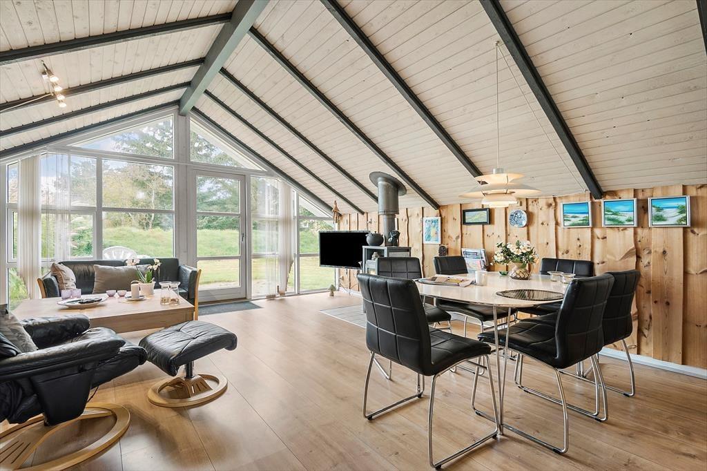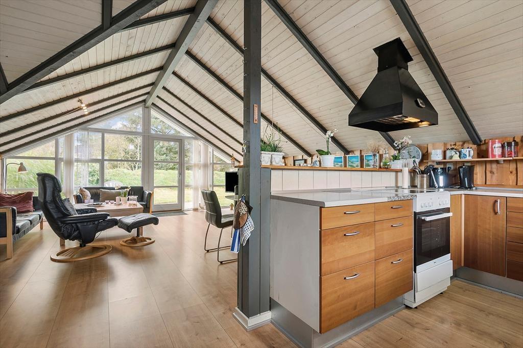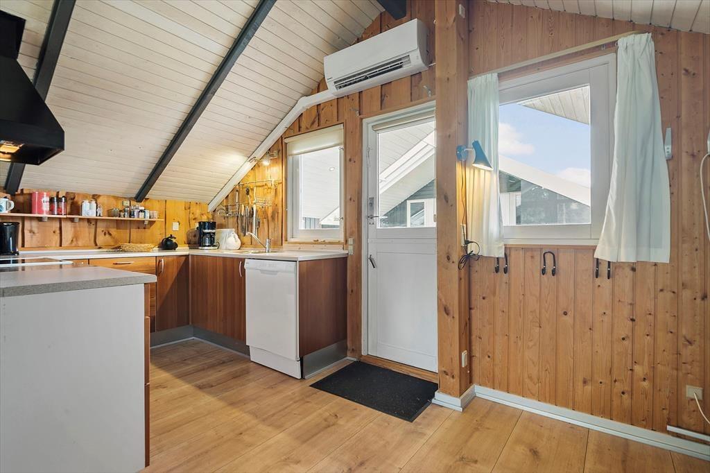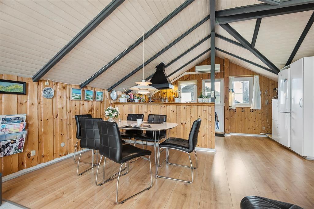Inden døre bliver du budt velkommen i de hyggelige og velindrettede rum. På klassisk manér er der loft til kip og rustik træbeklædning på væggene, mens gulvet er udskiftet i 2021 som en af husets moderne forbedringer. Det åbne køkken og stuen udgør tilsammen husets hjerte, hvor du kan samles med familien til fælles madlavning, gode middage og hyggestunder nær brændeovnen. Planløsningen byder på to komfortable soveværelser, hvor I kan se frem til at sove både godt og længe. Brusebadeværelset har en pæn og praktisk indretning, og alt i alt sørger de mange gode detaljer i huset for en hjemlig og afslappet atmosfære, der passer perfekt til ferielivet.