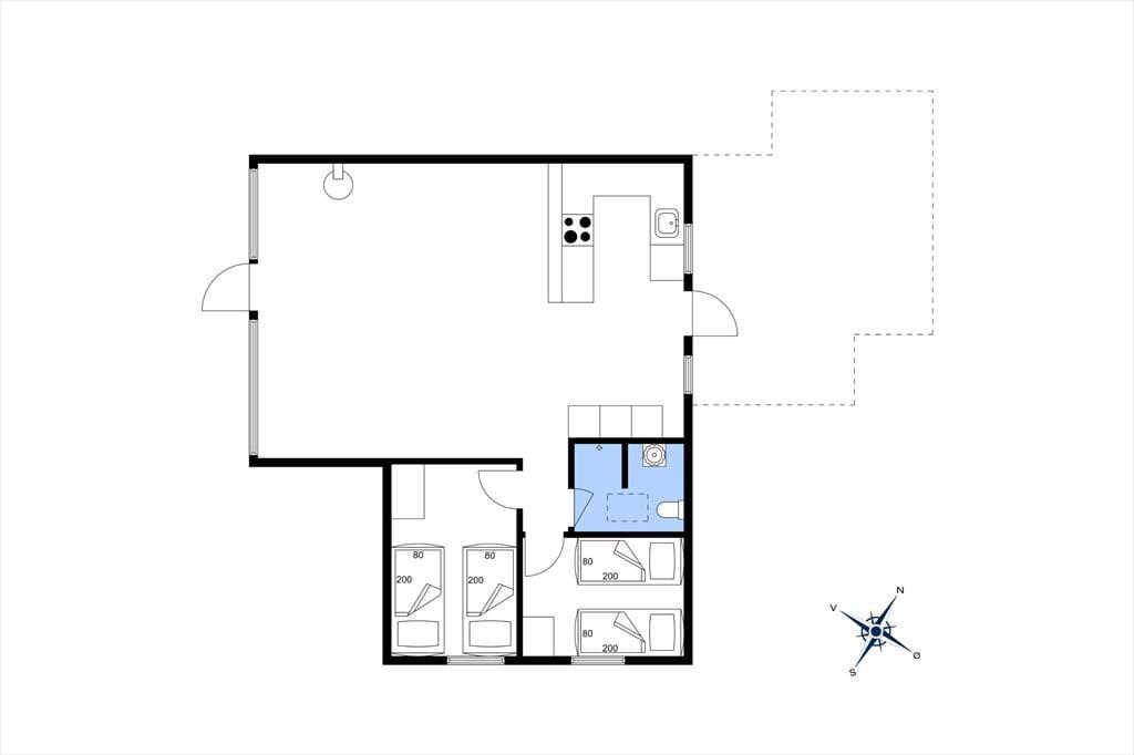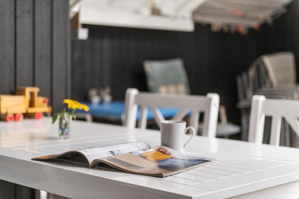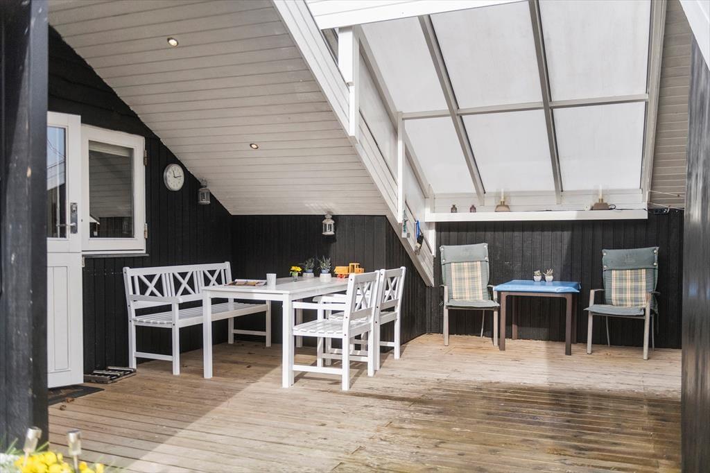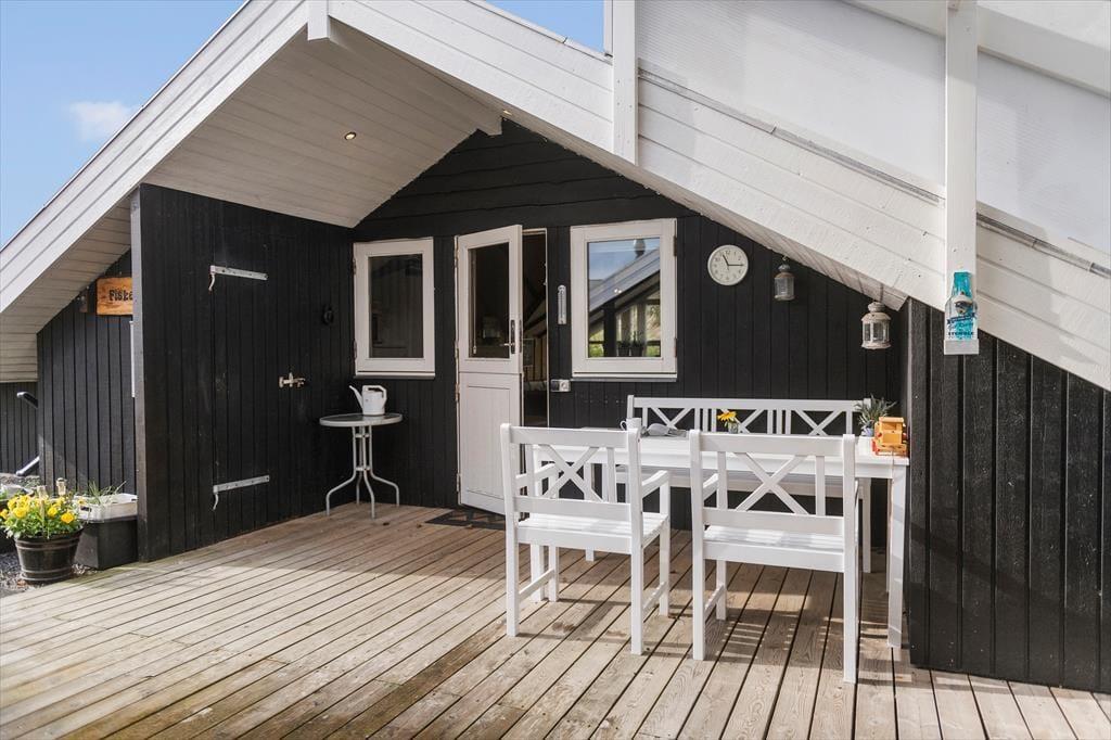 Ude i det fri er der dejligt at være på den grønne grund, der skærmes af hybenbuske og anden bevoksning. På græsplænen er der plads til at leg og aktiviteter i det fri, og når du trænger til en rolig pause i en god havestol, vil du sikkert vælge at slå dig ned på en af husets terrasser. Fra stuen har du direkte adgang til en dejlig terrasse med sydvestvendt orientering, hvor du kan slikke sol en stor del af dagen. På den anden side venter et skønt og delvist overdækket opholdsmiljø, der ligger godt i læ mellem sommerhuset og udhuset. Hvem ved: Måske er det der, du kommer til at tilbringe størstedelen af ferien?