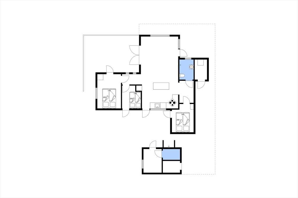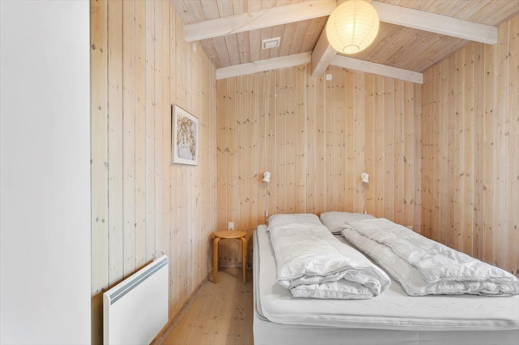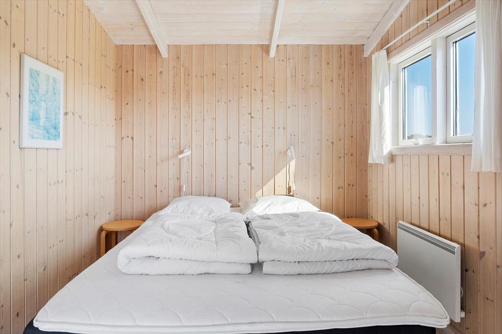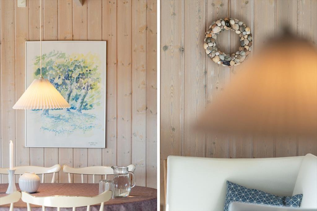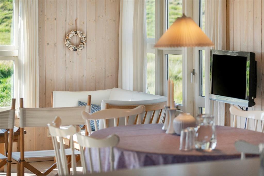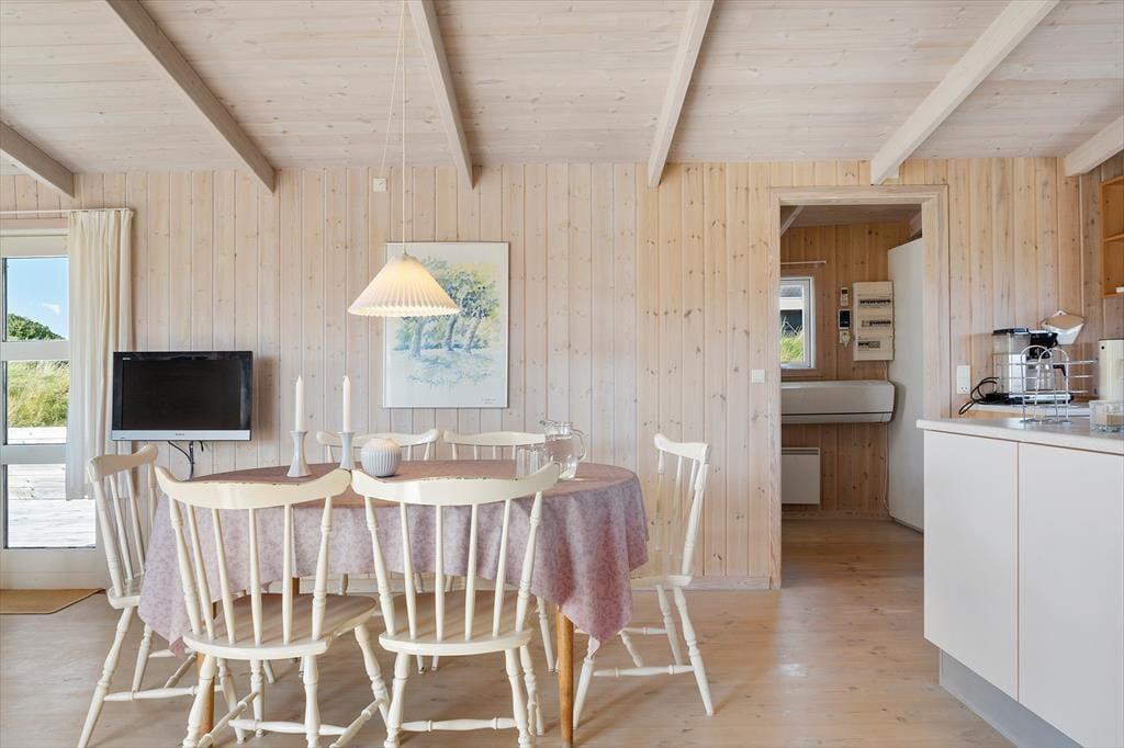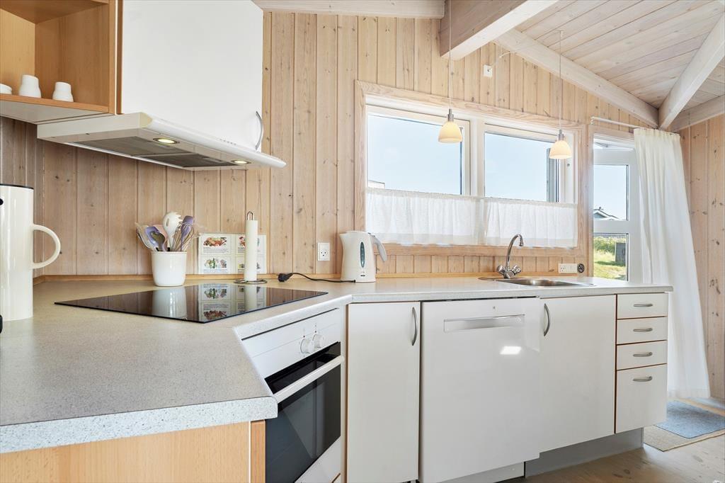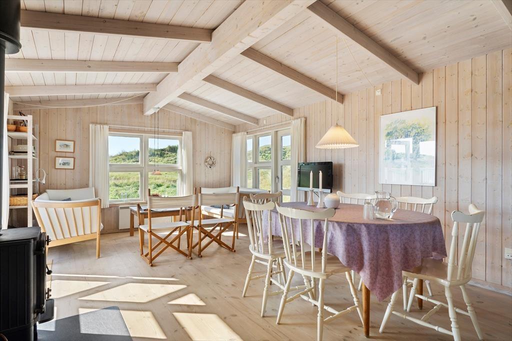 Når du træder ind i sommerhuset, vil du straks føle dig hjemme. Den hyggelige stue prydes af en brændeovn, hvor du kan nyde de lange sommeraftener med en god bog eller tilbagelænede stunder i godt selskab. De store glaspartier lukker nordsøens lys ind og giver en fantastisk udsigt til de omgivende klitter. I det velindrettede køkken med spiseplads kan du tilberede lækre feriemåltider, mens du nyder udsigten. De tre lyse soveværelser, der alle har direkte adgang til terrasserne, skaber et indbydende miljø for afslapning, og det funktionelle badeværelse med gulvvarme tilføjer ekstra komfort.