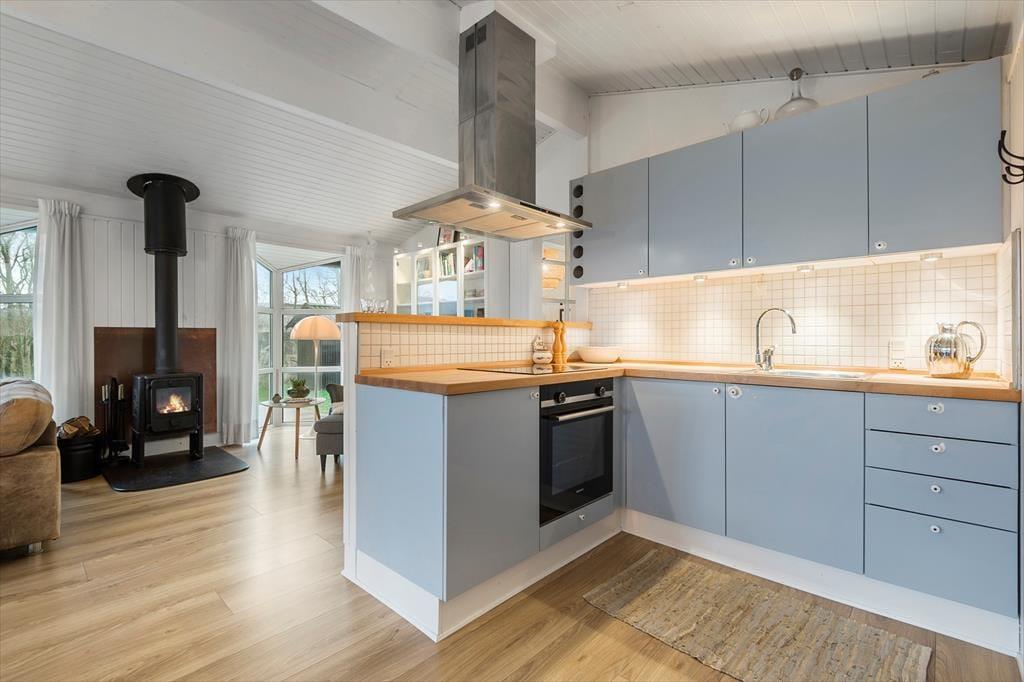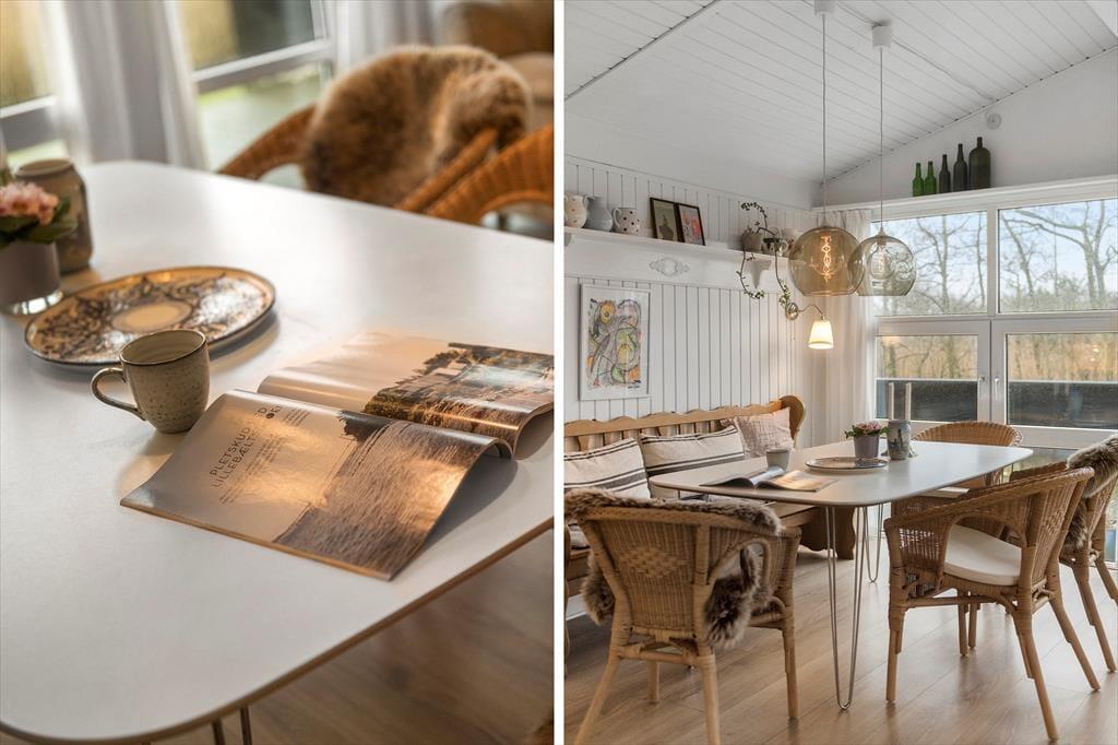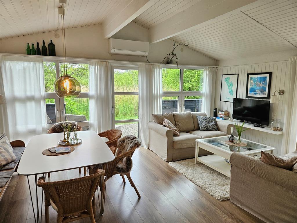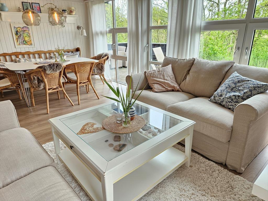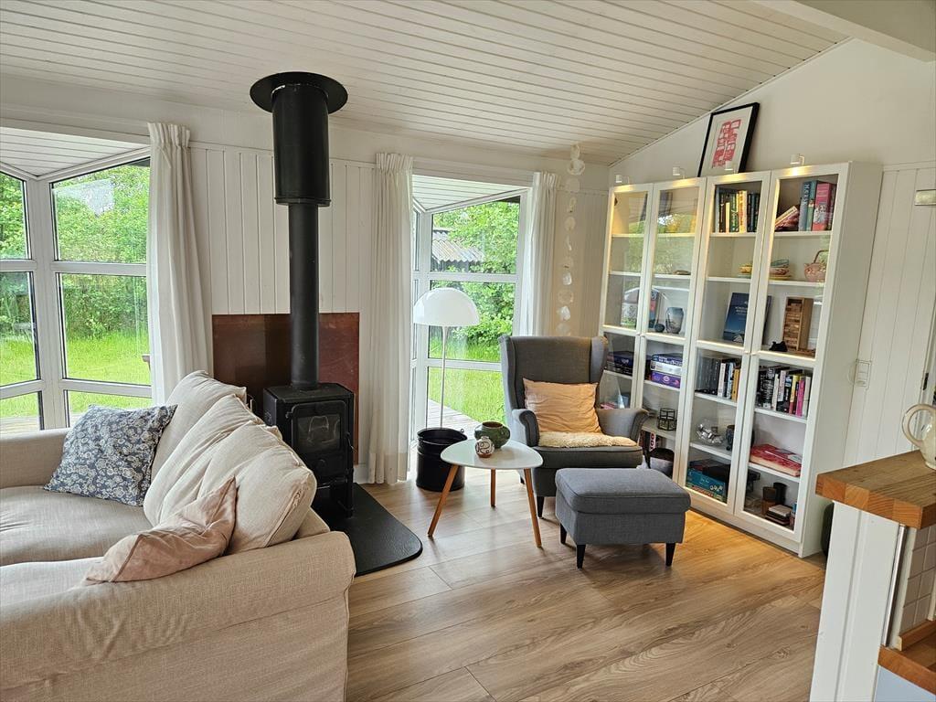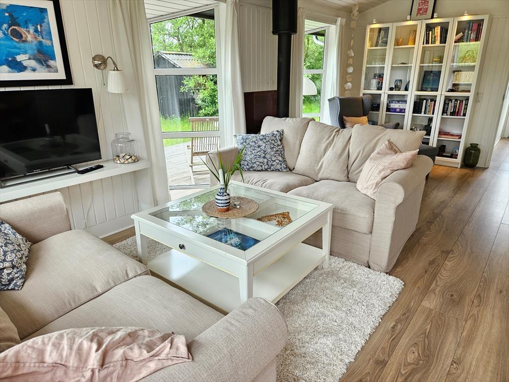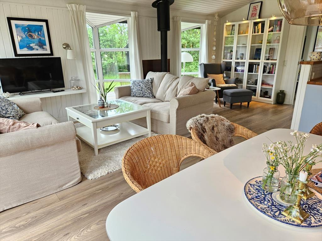 Det lyse og hyggelige sommerhus danner de ideelle rammer for en afslappende ferie. Når du træder indenfor, mødes du af en varm atmosfære, hvor stue og køkken smelter sammen og skaber et naturligt samlingspunkt. Her kan du sætte dig i sofaen med en god bog, mens lyset strømmer ind gennem vinduerne, eller samles med dine nærmeste omkring spisebordet til hyggelige måltider. Hver detalje er nøje udvalgt for at skabe en følelse af hjemlig hygge og afslapning. Det veludstyrede køkken gør det til en fornøjelse at tilberede dagens måltider, mens den afslappede stemning breder sig i hele huset.