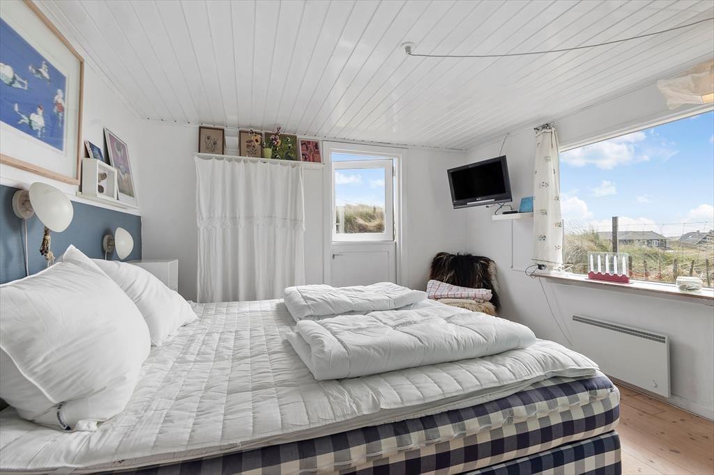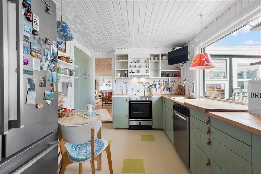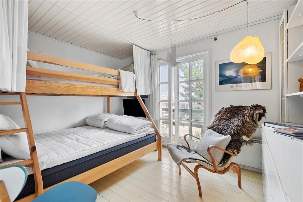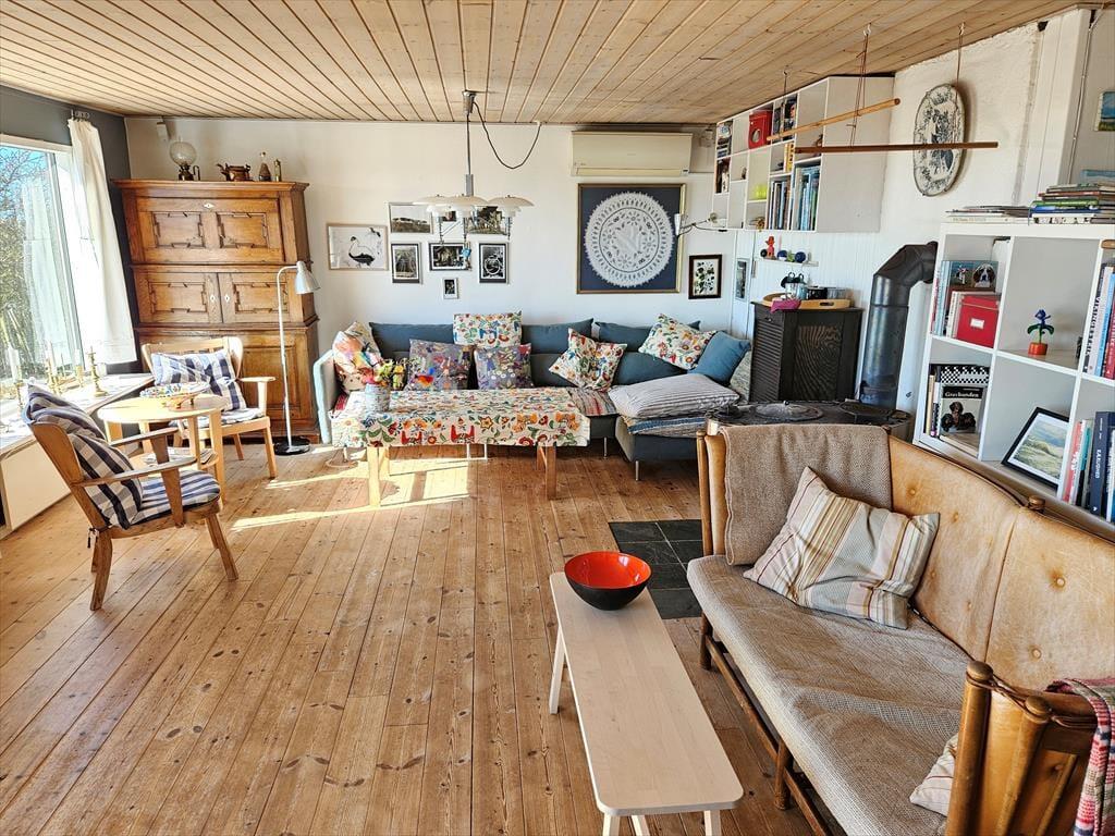 Der er noget særligt over at træde ind i dette sommerhus. Måske er det den autentiske indretning, der emmer af historie og varme, eller måske er det følelsen af at være et sted, hvor der er tænkt over detaljerne – uden at det føles tilstræbt. Huset, der stammer fra midten af 1900-tallet, har bevaret sin oprindelige charme og sjæl, men fremstår samtidig moderne og indbydende med bløde møbler, personlige detaljer og et dejligt lysindfald. Stuen og spisestuen ligger i forlængelse af hinanden og danner rammen om nærvær og fælles stunder, uanset om du tænder stearinlys til middagen eller bare smider benene op og nyder udsigten over havet fra sofaen. Her er det nemt at finde ro og mærke ferien sænke sig over skuldrene. Selv fra det ene soveværelse kan du begynde dagen med havudsigt – en luksus, der hurtigt bliver en vane.