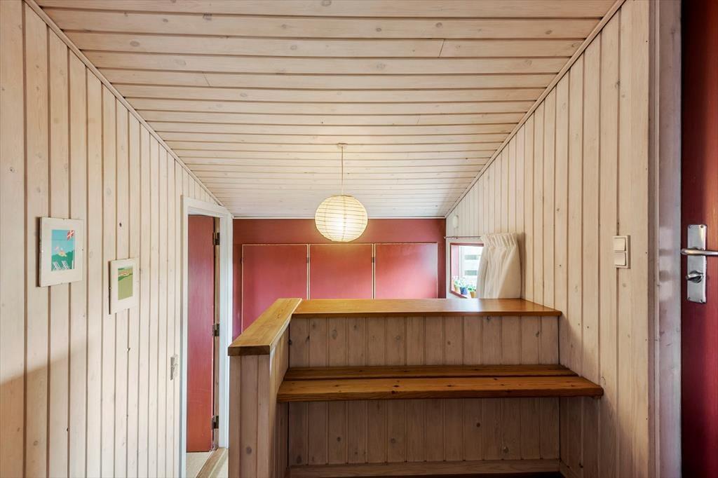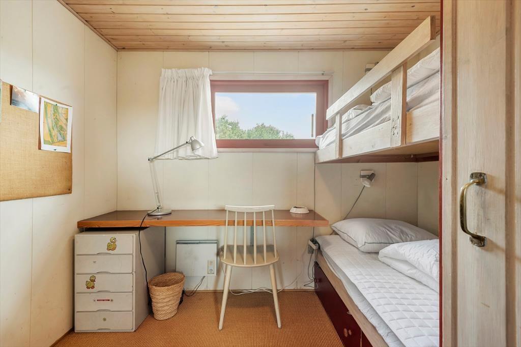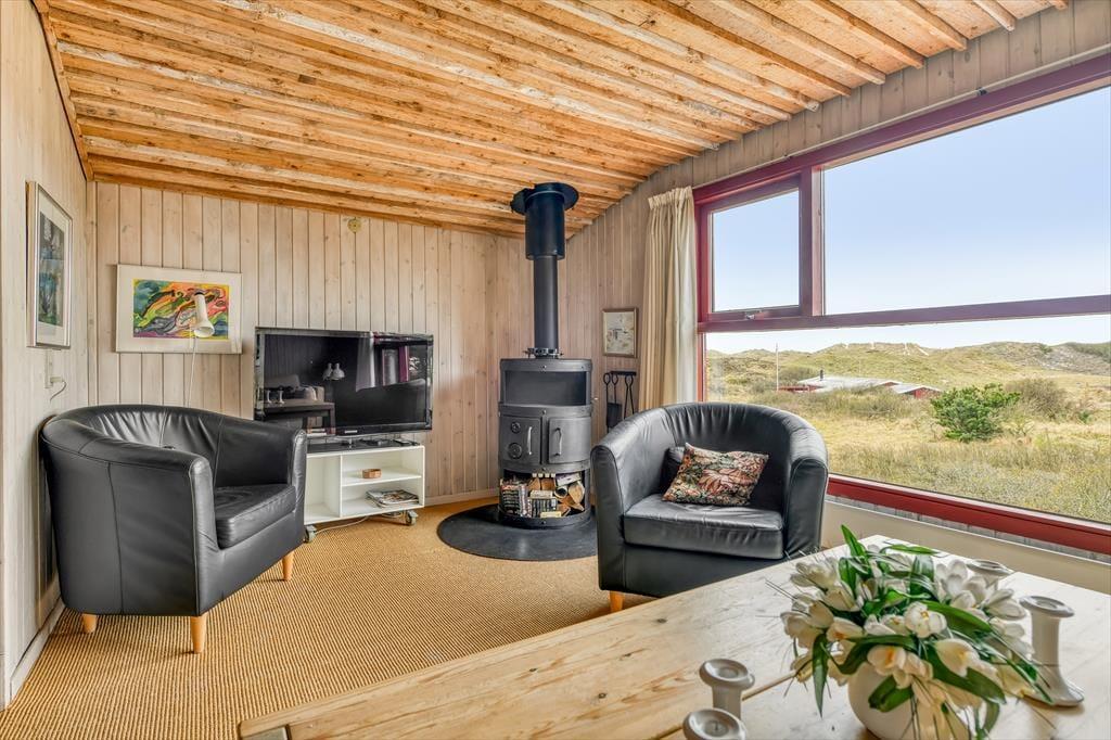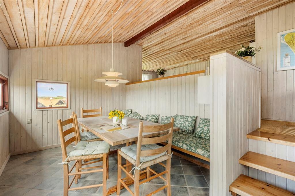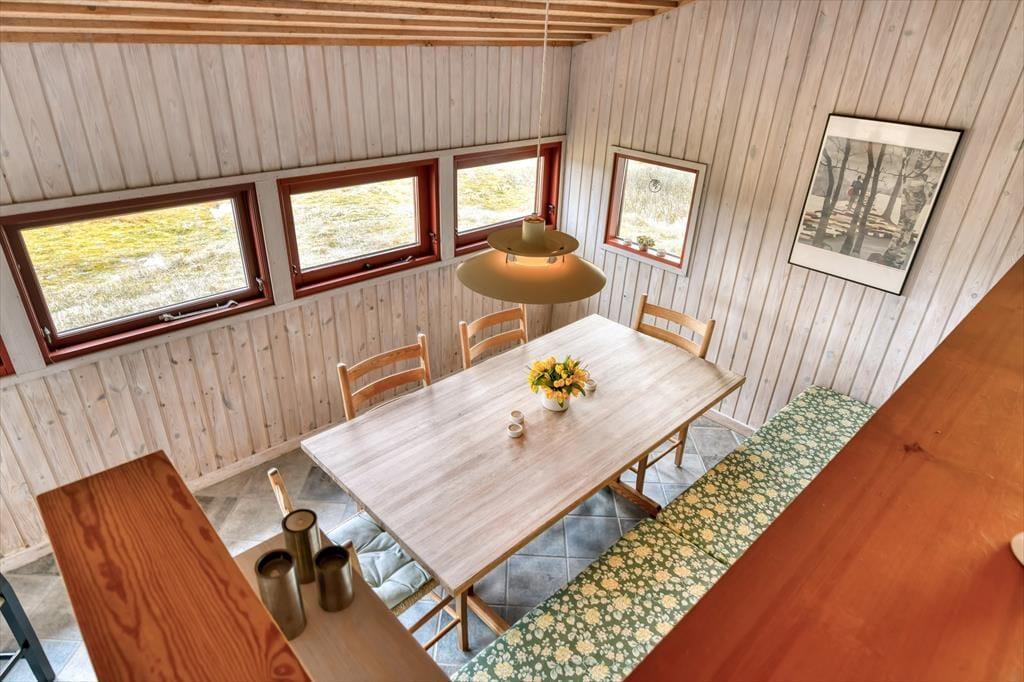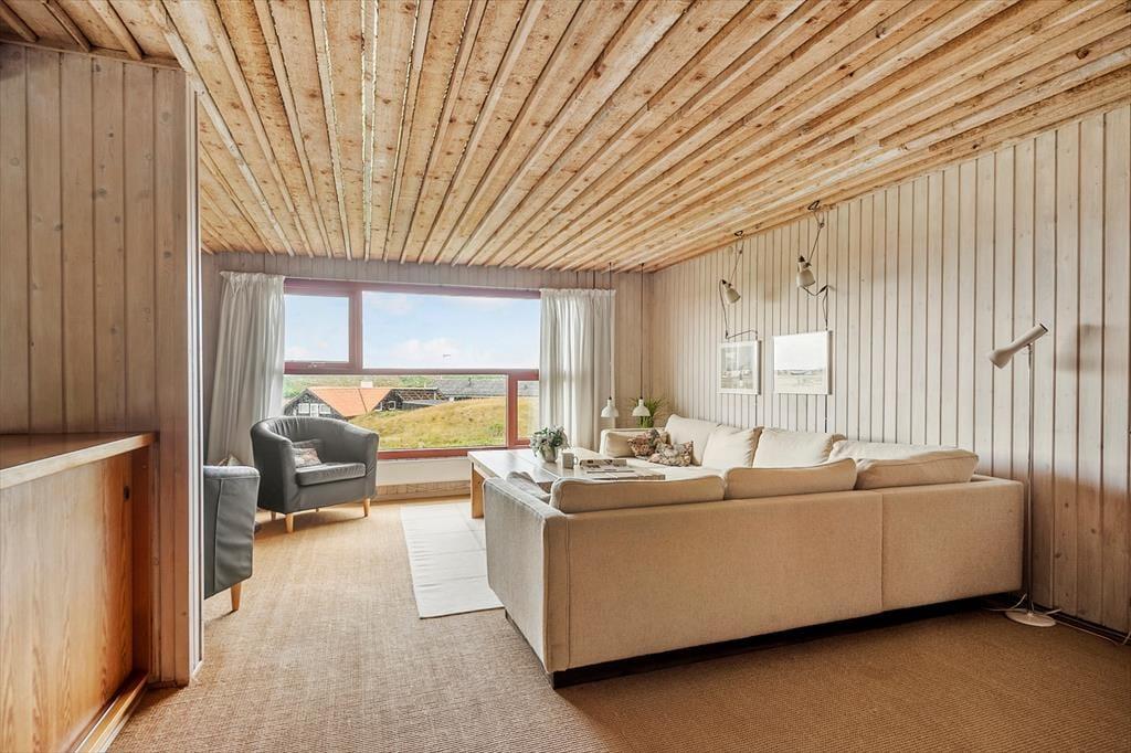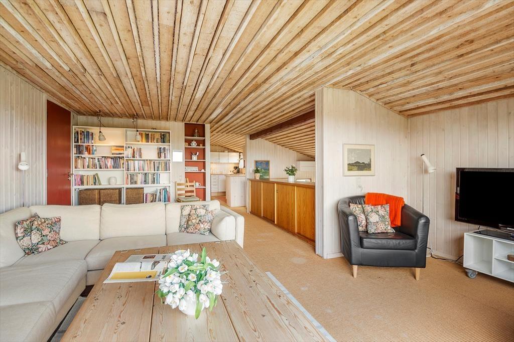 Det første, du lægger mærke til, når du træder ind i sommerhuset på Krebsestien 7, Rindby, er det særlige lys, der strømmer ind gennem de store vinduer og falder blødt ind over rummene. Den lyse indretning, kombineret med charmen fra husets originale islæt, skaber en varm og imødekommende atmosfære, hvor det er nemt at falde helt ned i gear. Opholdsrummet byder på forskudte niveauer, som giver oplevelsen af flere små zoner i ét samlet rum – en indbydende spiseplads ligger let hævet i forhold til stue og køkken, og det skaber en spændende dynamik i rummet. Her kan du lave mad i det åbne køkken og samtidig følge med i snakken ved spisebordet eller nyde udsigten til det omgivende klitlandskab fra sofaen. Når aftenen falder på, er det oplagt at tænde op i brændeovnen og finde ro i de bløde møbler, mens dagens indtryk langsomt falder på plads.