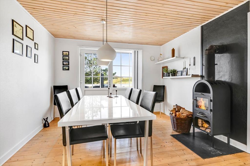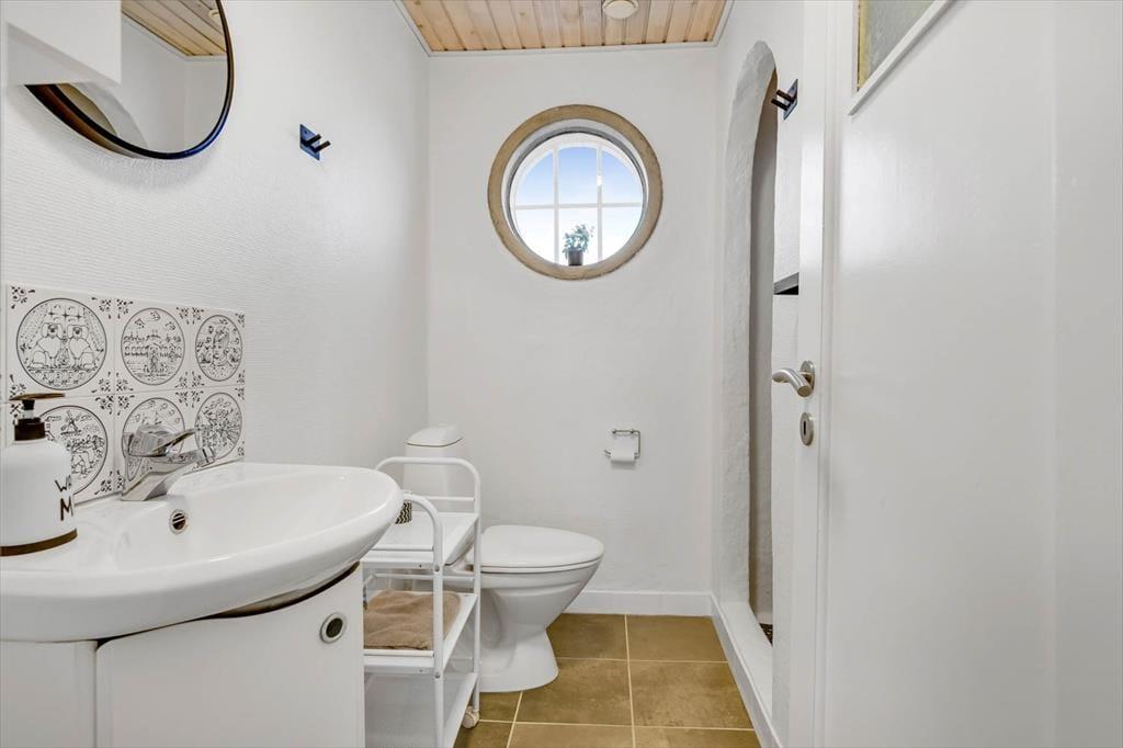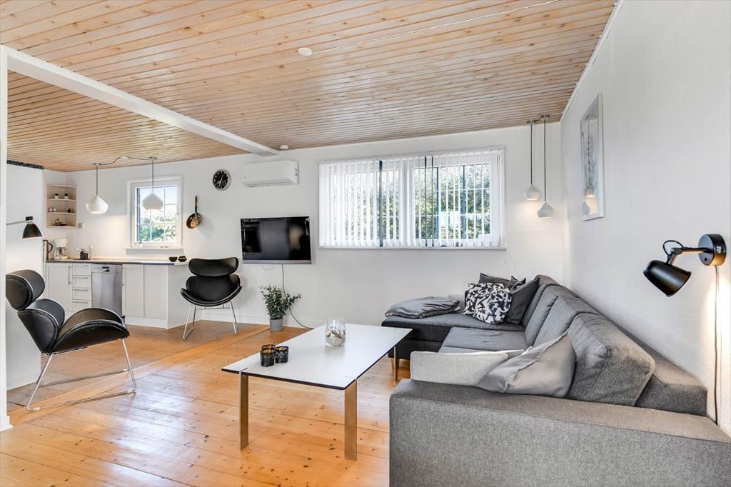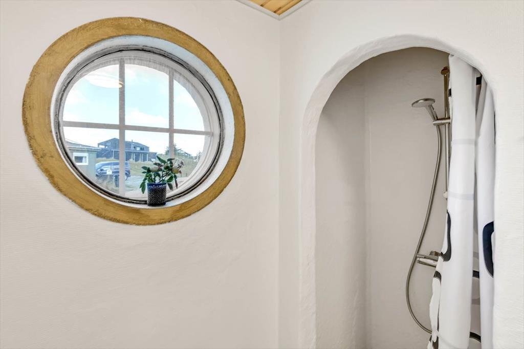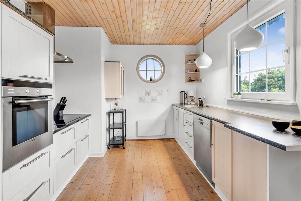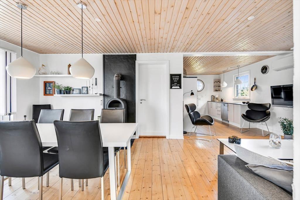 Indenfor mødes du af en varm og imødekommende stemning, hvor den enkle indretning og de fine detaljer skaber ro for øjet og plads til samvær. Opholdsrummet fungerer som husets naturlige hjerte, hvor det åbne køkken og stuen med spiseplads smelter sammen i ét – perfekt til lange feriedage med nærvær og hygge. De karakteristiske, runde vinduer i gavlen er med til at give huset sin egen særlige charme og lukker et smukt lys ind i rummet, der forandrer sig i takt med dagens timer. Her er hverken pyntet unødigt eller overmøbleret – og netop dét giver plads til, at du og dine kære kan sænke skuldrene og finde jer godt til rette. Uanset om I samles til morgenmad, brætspil eller aftensmad, føles huset som et trygt og rart sted at være.