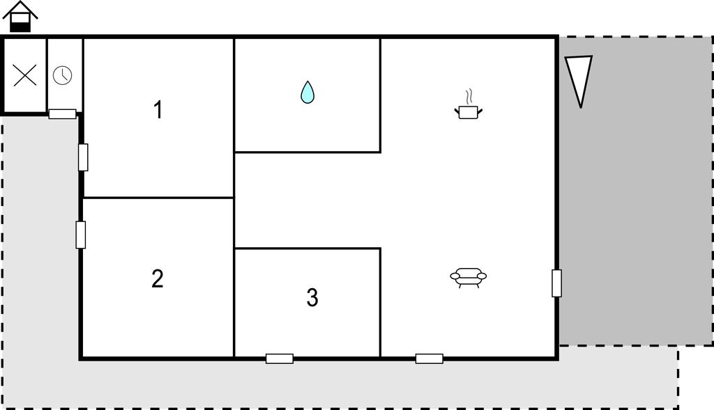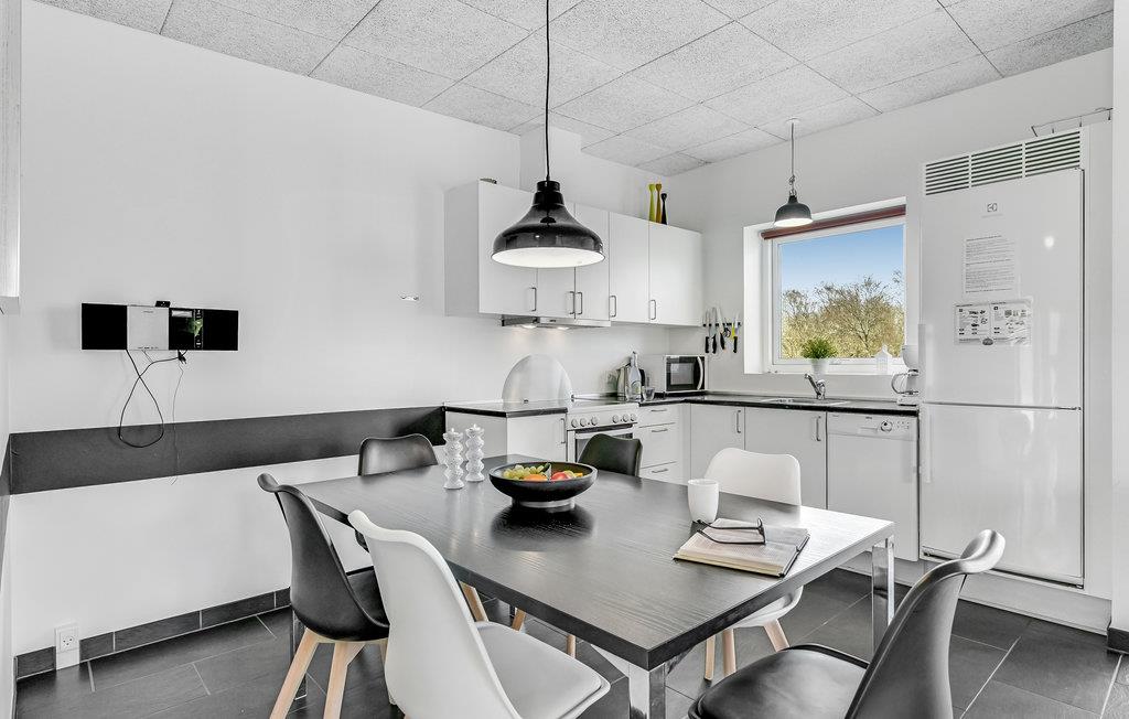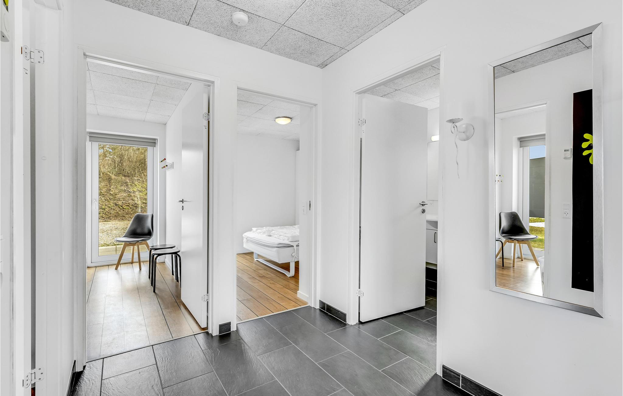 Huset er indrettet med 3 soveværelser samt badeværelse med bruser. Køkkenet og stuen ligger i åben forbindelse, og herfra er der udgang til terrassen.