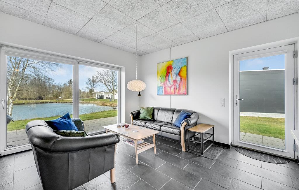 Dette hyggelige sommerhus ligger i Naturpark Vest i Hee og har udsigt over en smuk fiskesø, der ligger lige ude foran terrassen.