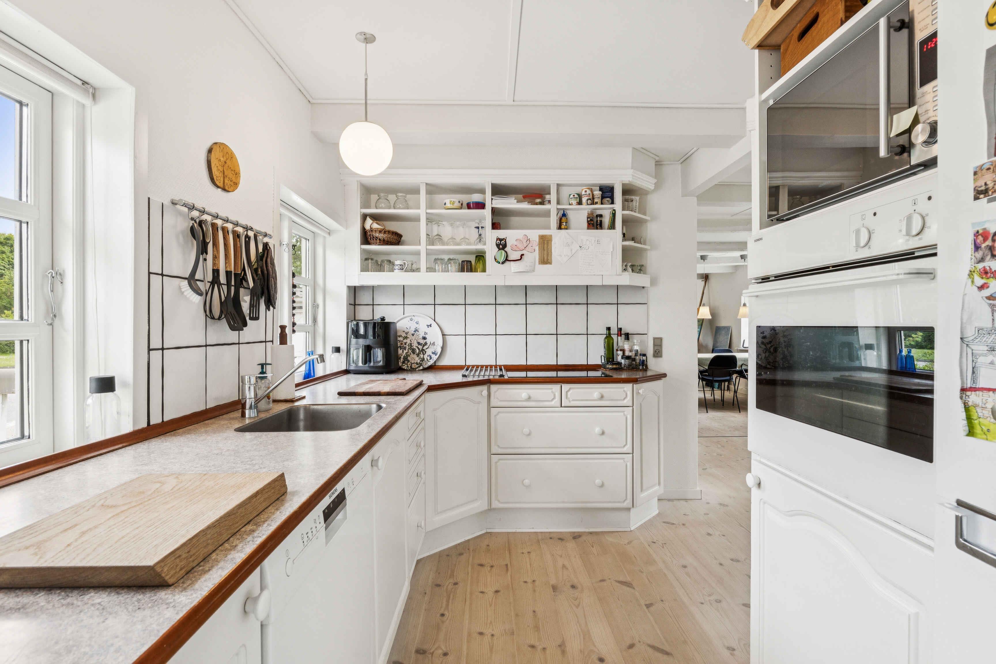 98 m² sommerhus med 3 soveværelser, 6 sengepladser, åbent køkken/alrum, lys stue med store vinduer, fint badeværelse, terrasse, nær strand, fjord, golf og naturstier.