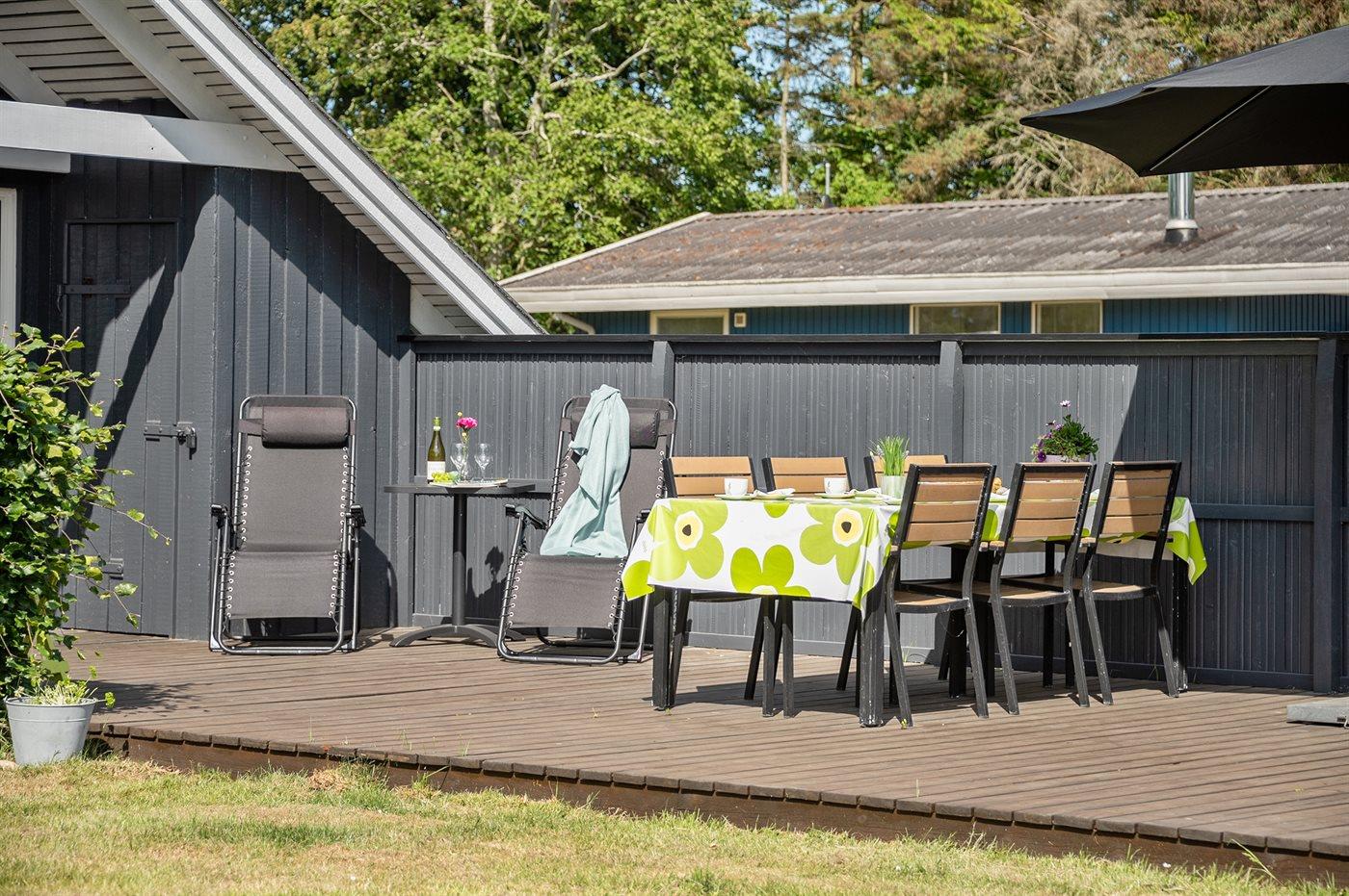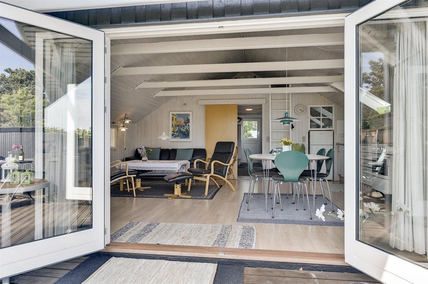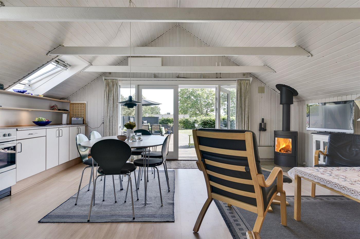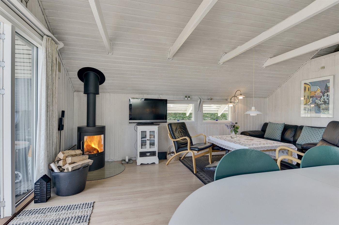 Pænt og velholdt sommerhus i træ, bygget i 1980 og renoveret i 2011, beliggende 700 m. fra vandet på en dejlig velanlagt havegrund med havkig fra både hus og grund. Til huset hører en solrig, delvist overdækket og afskærmet terrasse med havemøbler, hvorfra der er en skøn udsigt. Indvendigt fremtræder huset lyst og venligt med lofter til kip og en hyggelig indretning. Det åbne køkken er bl.a. udstyret med opvaskemaskine, varmluftovn, komfur med keramiske kogeplader samt fryser. I opholdsstuen findes der brændeovn, TV, DVD-afspiller, PlayStation2 spillekonsol samt radio. Sovepladserne fordeler sig på 1 værelse med dobbeltseng og 1 værelse med 2 enkeltsenge i huset samt 2 sovepladser i annekset i henholdsvis en enkeltseng eller i en køjeseng. Husets badeværelse har bruseniche. Der er installeret energibesparende varmepumpe i huset og gulvbelægningen er af både træ, klinker og linoleum. Til børnene findes der gynge på grunden. Et skønt sommerhus beliggende i et naturskønt område tæt på badestrand og med gode fiskemuligheder i nærheden.