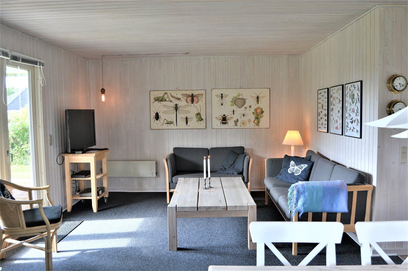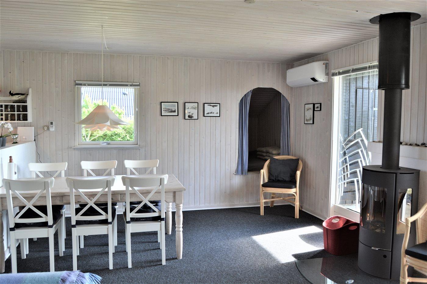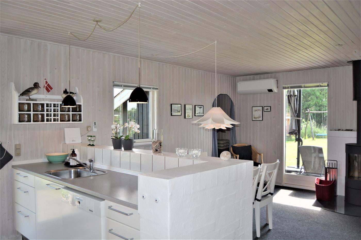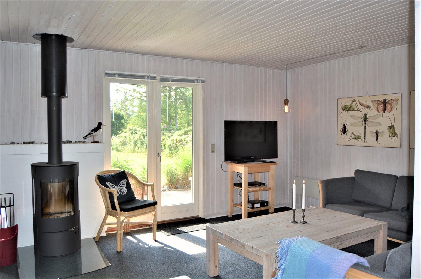 Det pæne køkken er kombineret med spise-/opholdstuen og bl.a. udstyret med opvaskemaskine, køleskab, fryser med en kapacitet på 70 liter, varmluftovn samt komfur med induktionskogeplader. I opholdsstuen, hvorfra der er adgang til den overdækkede terrasse, finder I brændeovn med brændeovnsgitter, TV (mindst 4 danske kanaler), DVD-afspiller samt radio med CD-afspiller. Husets sovepladser fordeler sig på 3 gode værelser; 2 med dobbeltseng og 1 med 2 enkeltsenge. Der findes ét badeværelse med bruseniche og adgang til husets sauna samt ét badeværelse med badekar. Af yderligere udstyr kan gratis, trådløs internetforbindelse, vaskemaskine samt tørretumbler nævnes og der er installeret energivenlig luft til luft varmepumpe. Der er installeret stik til opladning af elbil, type 2 stik med 11 kW ladeeffekt. Til de mindste feriegæster er der 2 høje barnestole, og på grunden findes der legehus, gynge, sandkasse, trampolin, shelter og bålsted.