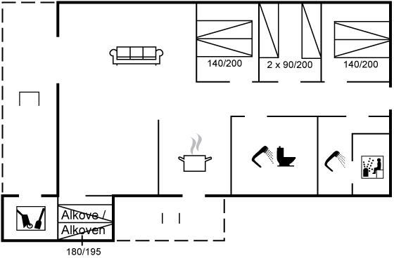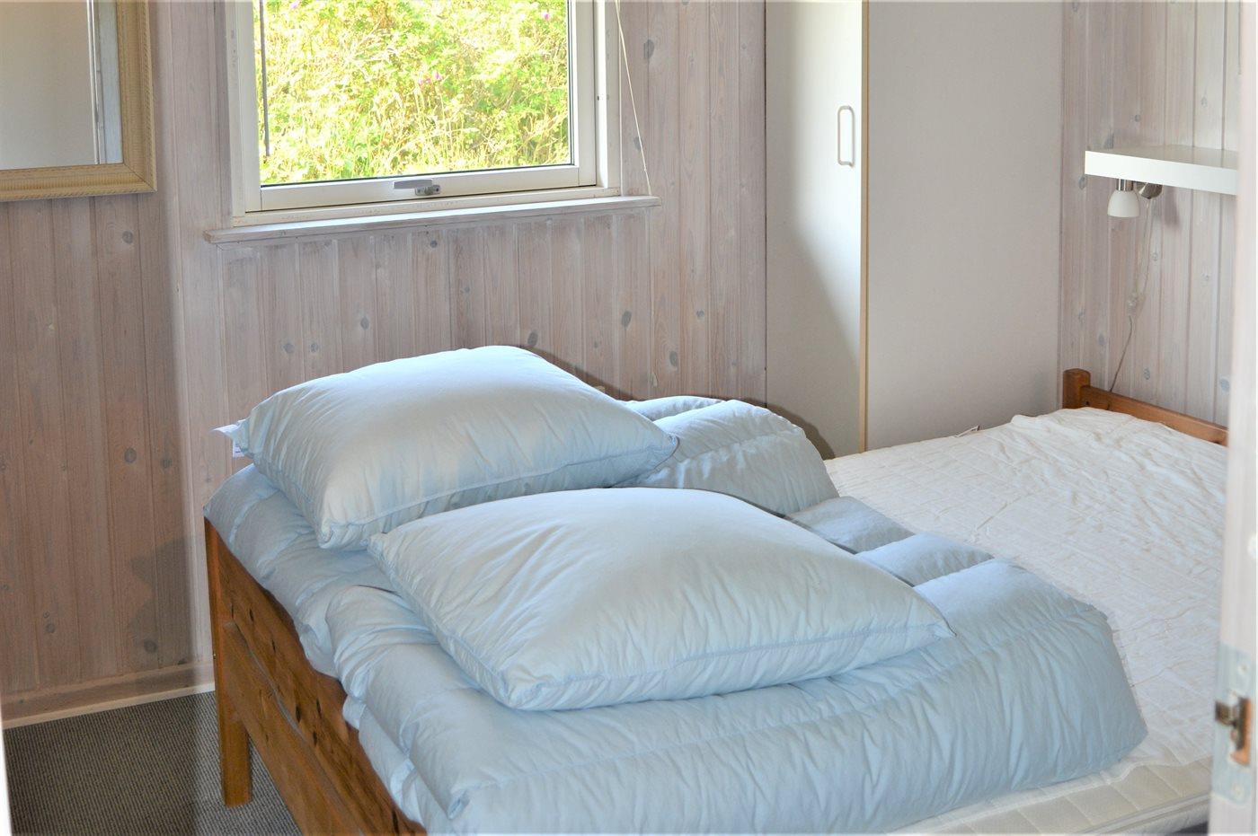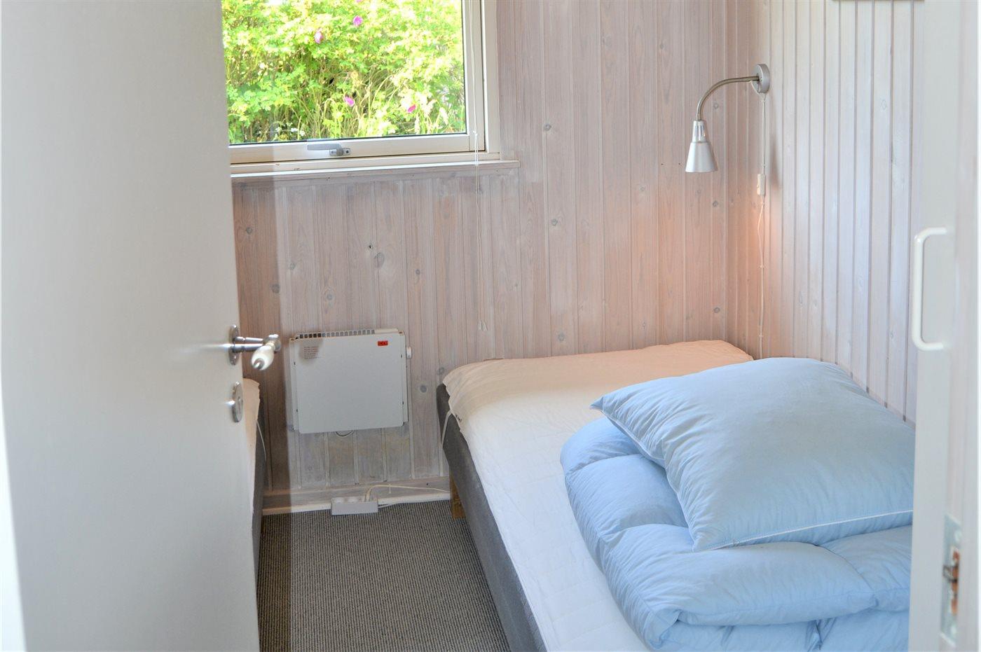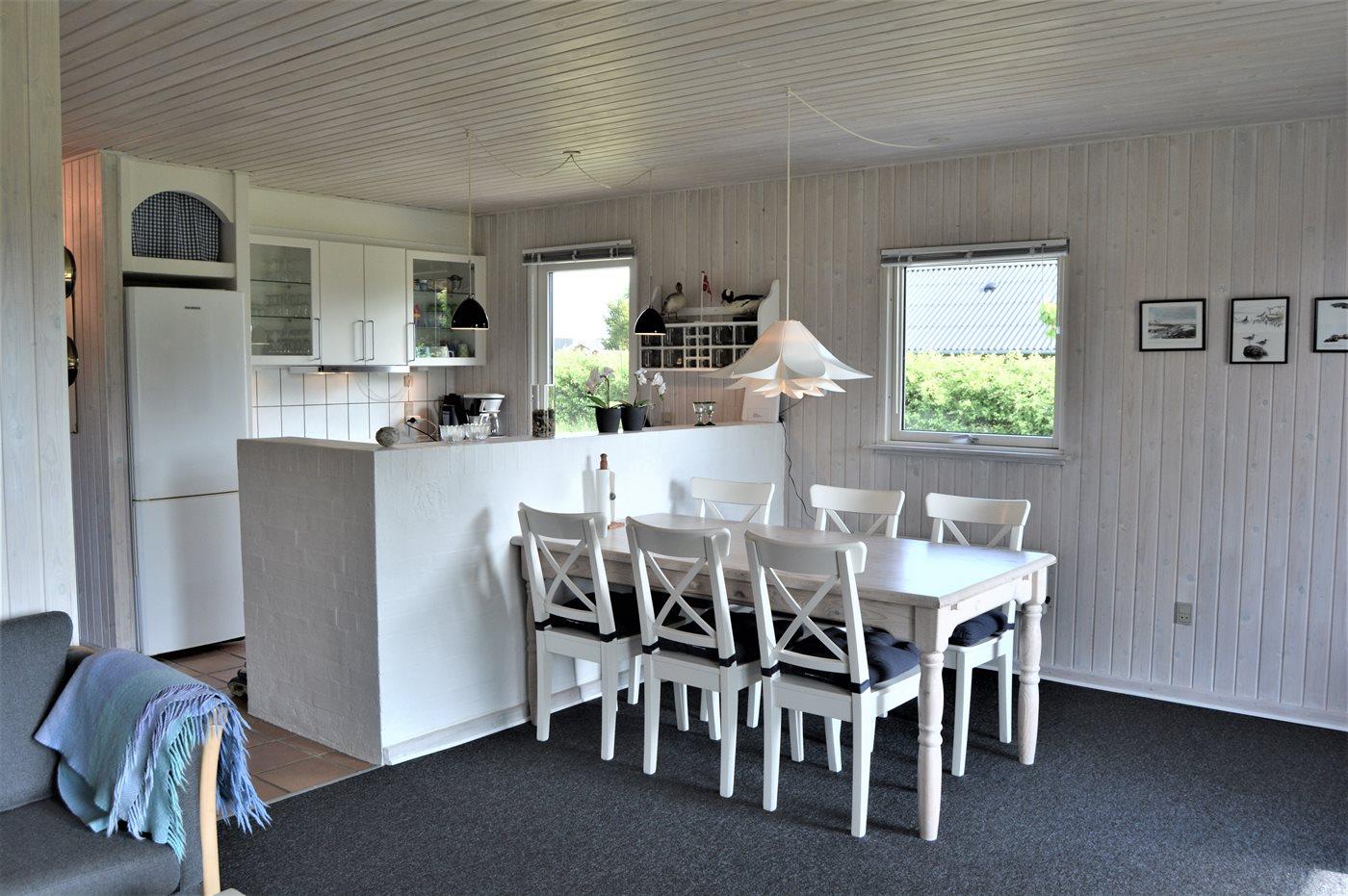 Det pæne køkken er kombineret med spise-/opholdstuen og bl.a. udstyret med opvaskemaskine, køleskab, fryser med en kapacitet på 70 liter, varmluftovn samt komfur med induktionskogeplader. I opholdsstuen, hvorfra der er adgang til den overdækkede terrasse, finder I brændeovn med brændeovnsgitter, TV (mindst 4 danske kanaler), DVD-afspiller samt radio med CD-afspiller. Husets sovepladser fordeler sig på 3 gode værelser; 2 med dobbeltseng og 1 med 2 enkeltsenge. Der findes ét badeværelse med bruseniche og adgang til husets sauna samt ét badeværelse med badekar. Af yderligere udstyr kan gratis, trådløs internetforbindelse, vaskemaskine samt tørretumbler nævnes og der er installeret energivenlig luft til luft varmepumpe. Der er installeret stik til opladning af elbil, type 2 stik med 11 kW ladeeffekt. Til de mindste feriegæster er der 2 høje barnestole, og på grunden findes der legehus, gynge, sandkasse, trampolin, shelter og bålsted.