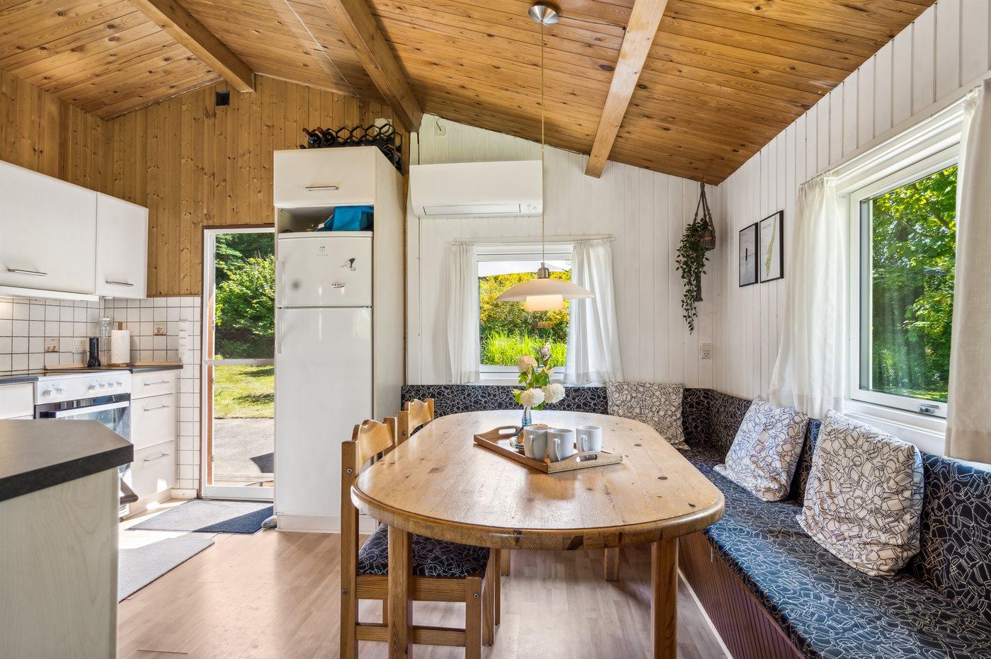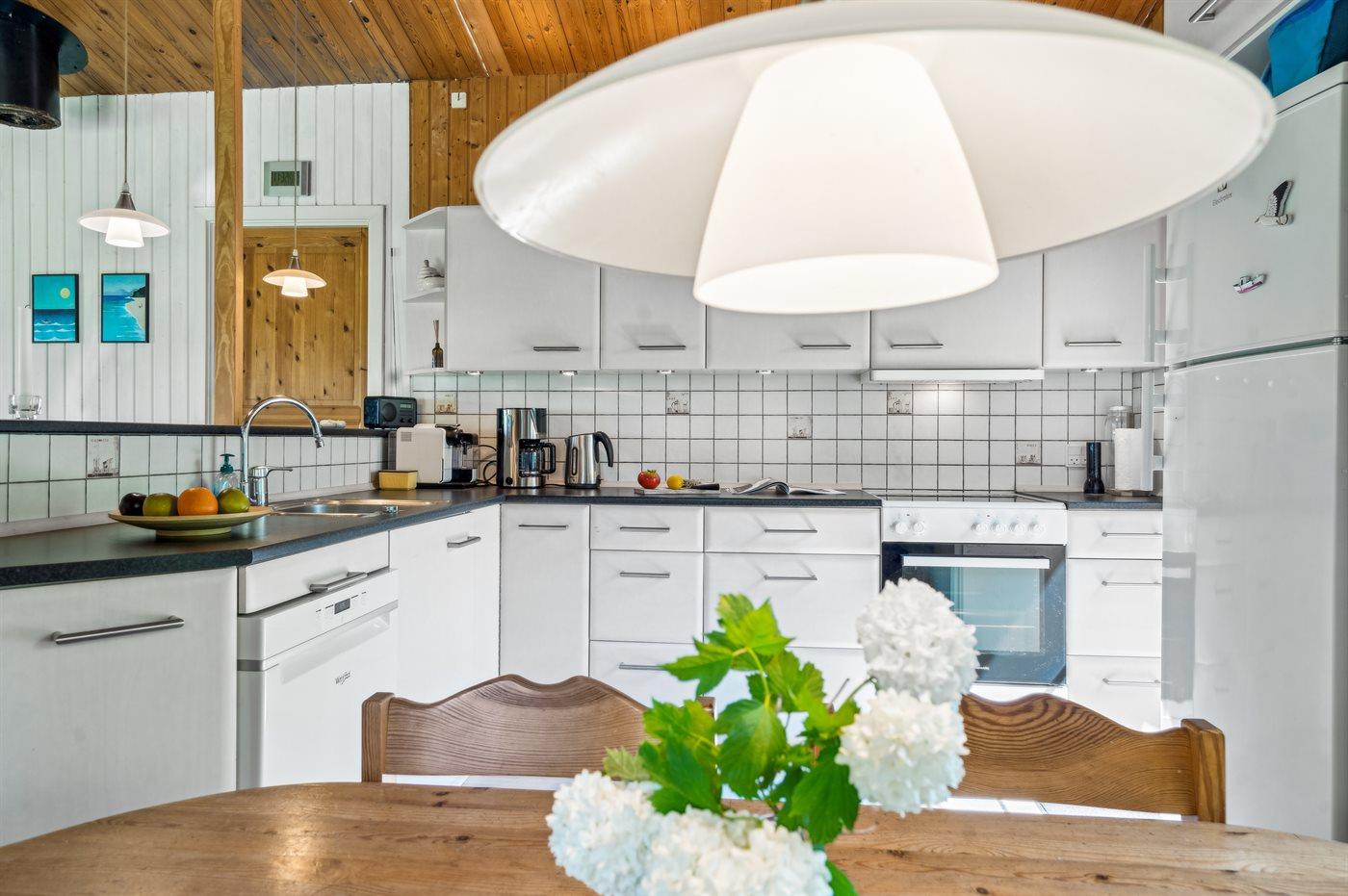 Køkkenet er udstyret med 1 køleskab. Der er 4 keramiske kogeplader, varmluftovn samt opvaskemaskine.