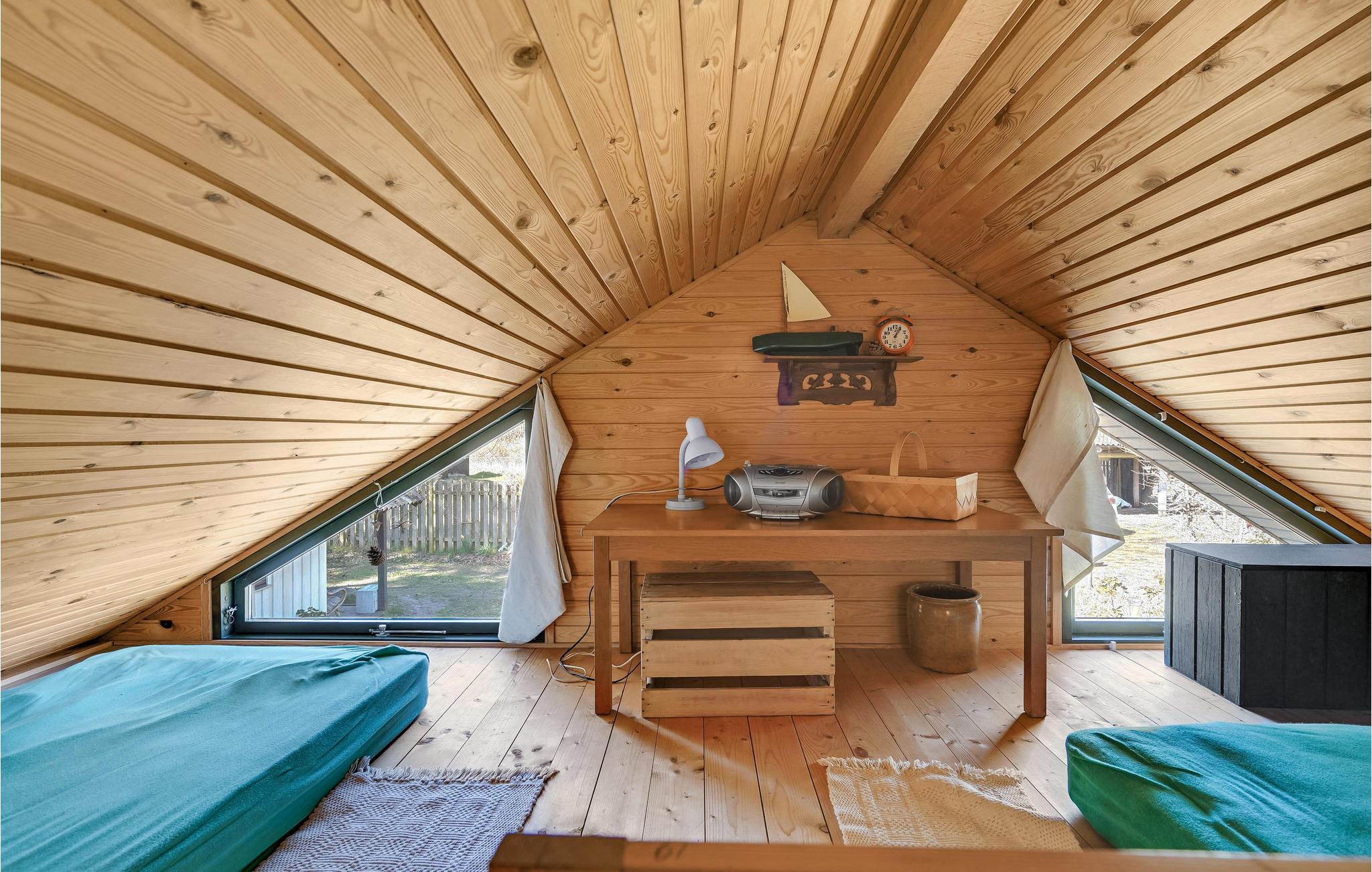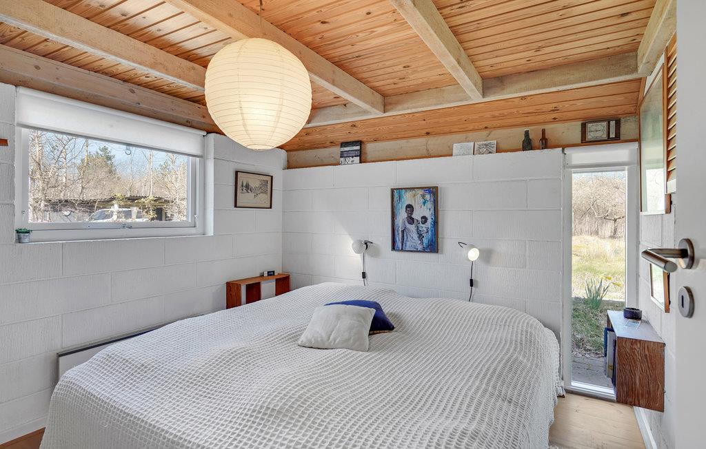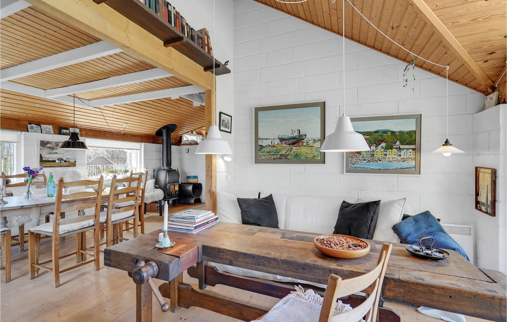 Velkommen til dette nydelige feriehus med plads til en familie og to hunde. Huset er gennemgående pænt og komfortabelt indrettet og har næsten en helt hytteagtig stemning takket være de stemningsfulde trælofter og med synlige bjælker. Har I børn, vil de formentlig trygle om at få sovepladserne under det hyggelige, spidse tag på 1. sal.