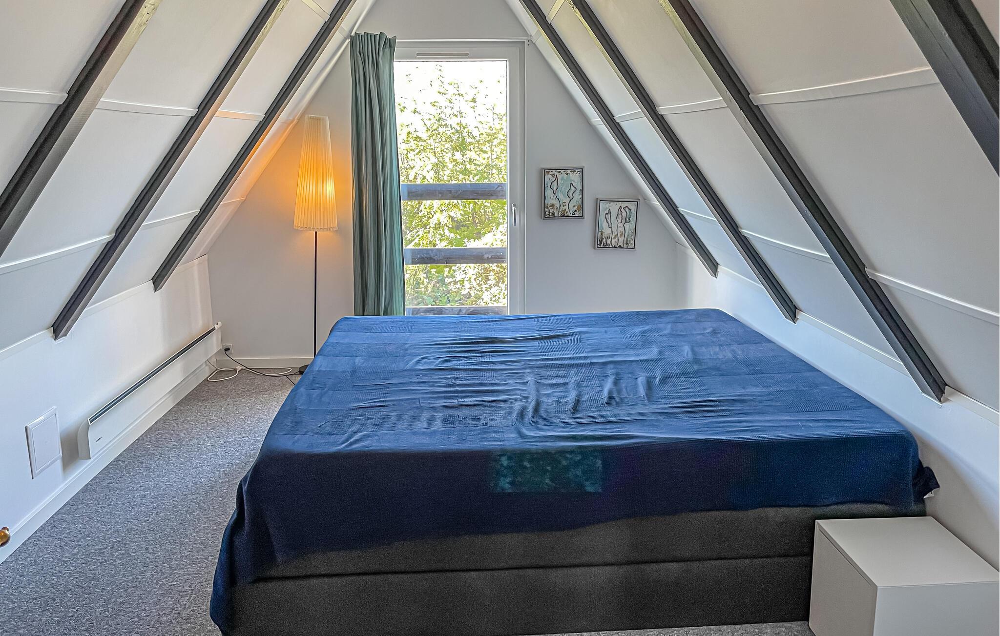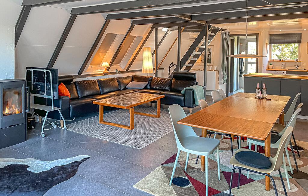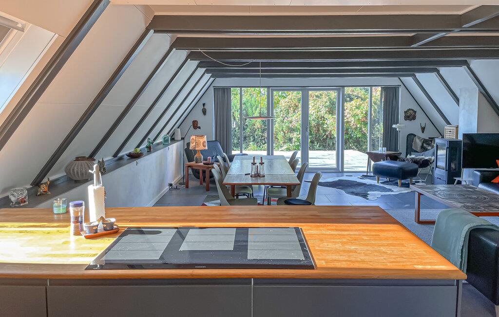 Jeres feriehus er noget særligt med sin unikke arkitektur med et spids gavltag og en lys, åben planløsning. Træd ind i den rummelige opholdsstue og bliv betaget af den moderne skandinaviske stil. Kombinationen af ??lyse overflader, mørke træelementer og store vinduer skaber en luftig, men hyggelig atmosfære. Find jer til rette i den hyggelige sofa foran brændeovnen eller nyd måltiderne sammen ved det lange spisebord. Det åbne køkken med sine elegante facader, træbordplader og moderne apparater lægger op til at lave mad og nyde måltider sammen.