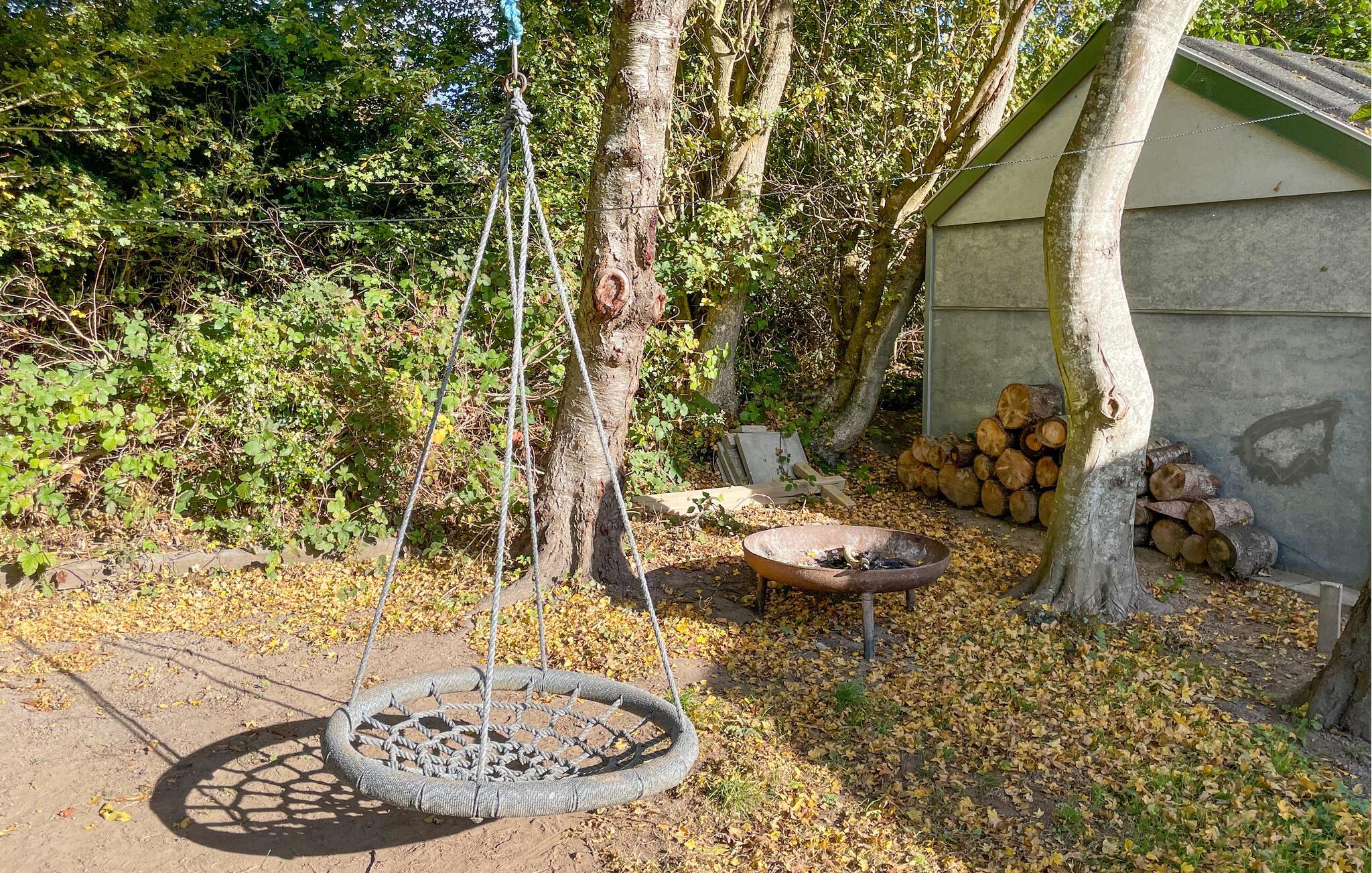 Træd ud på den rummelige terrasse, som er delvist overdækket og derfor tilbyder beskyttelse selv på blæsende dage. Spis under åben himmel, slap af i liggestolene eller se børnene lege i haven. Den store græsplæne, gyngen og bålstedet gør ejendommen til et sted at tilbringe tid sammen og slappe af udendørs.