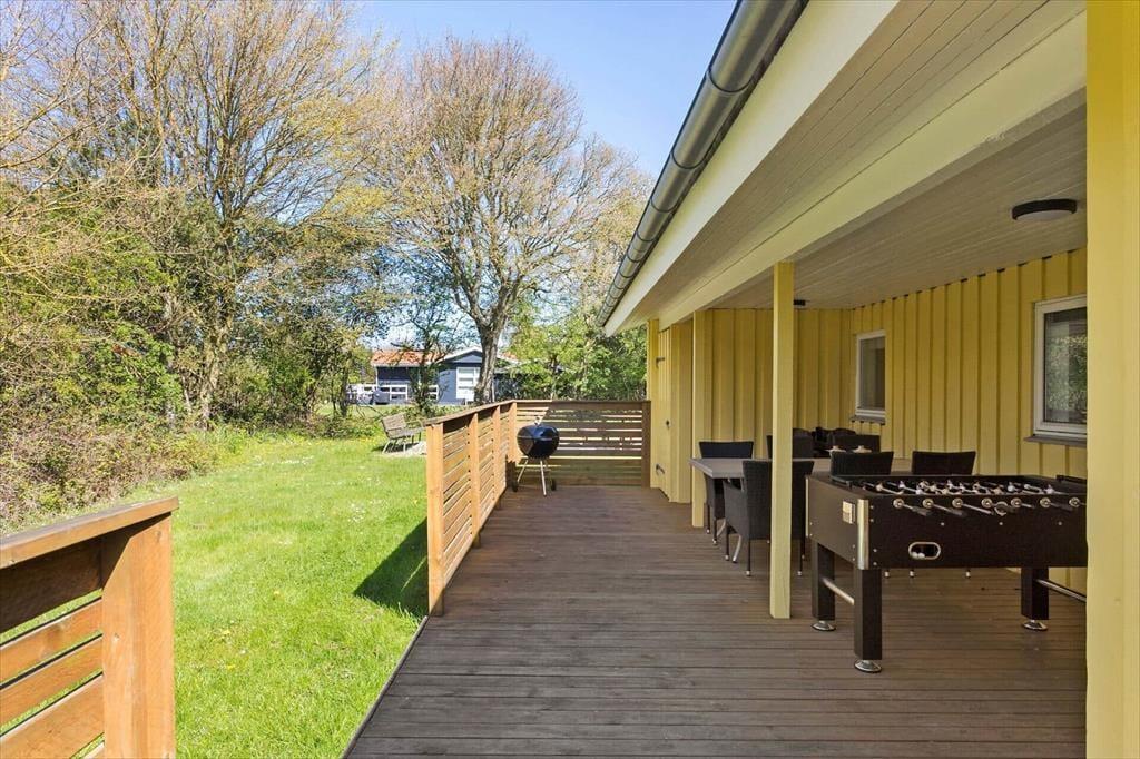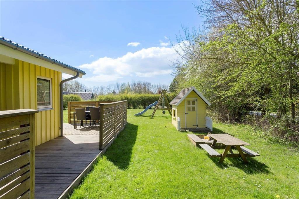 Det store udeområde omkring sommerhuset indbyder til masser af udendørs aktiviteter og afslapning. Terrassen er perfekt til morgenkaffen eller en hyggelig grillaften, og med den delvise overdækning kan I nyde udelivet, selvom vejret ikke altid viser sig fra sin bedste side. Børnene vil elske haven, hvor de kan lege på gyngestativet, suse ned ad rutsjebanen eller bygge sandslotte i sandkassen. Mens de små boltrer sig, kan I tænde op i bålpladsen og riste skumfiduser eller bage snobrød – en oplevelse, der med garanti vil skabe ferieminder for livet.