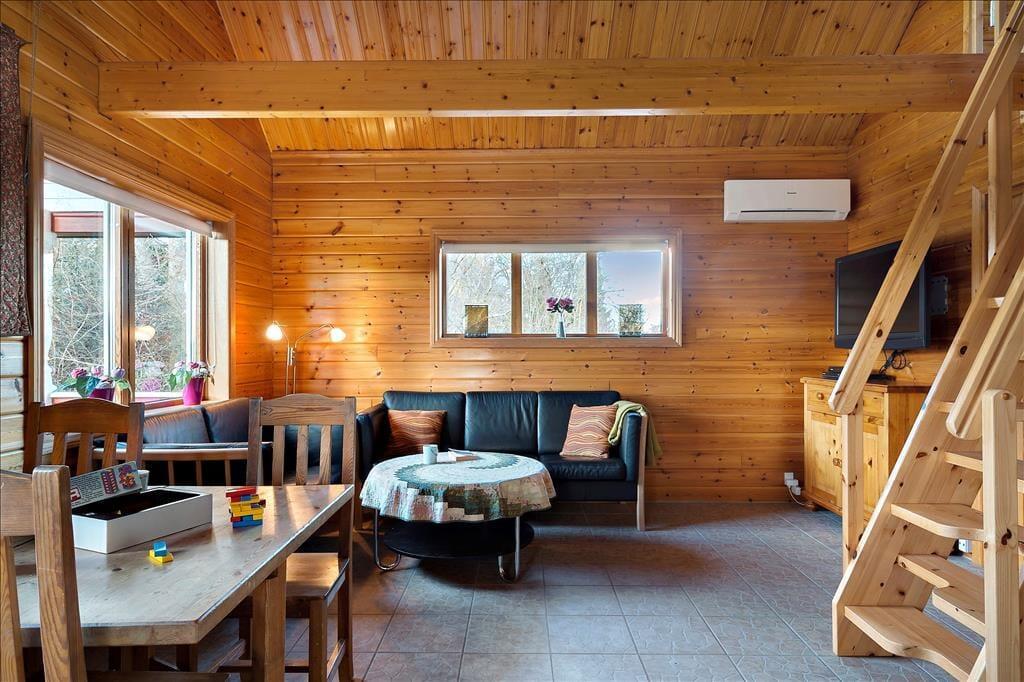 Stue med spiseplads og sofahjørne med TV. Varmepumpe med køl. Internet.