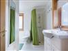 Pænt stort badeværelse med bruseniche, toilet og håndvask samt vaskemaskine.