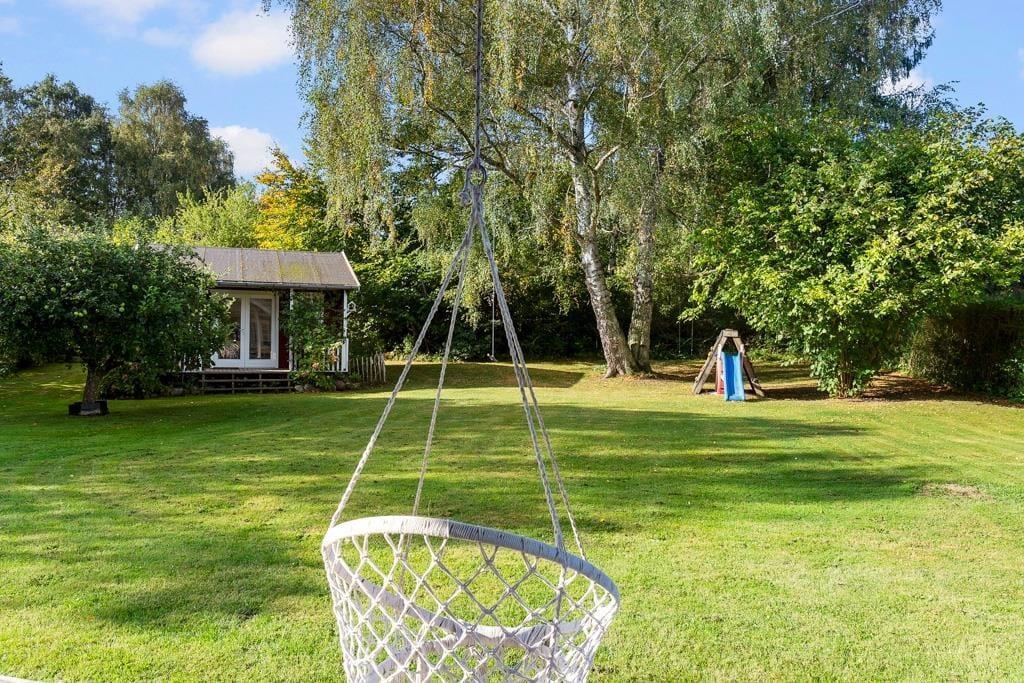 Her møder I den skønne lukkede have – sandkasse, gynger og rutsjebane til stor glæde for de små-hyg jer med bål i haven, som kan danne ramme om en hyggeaften med snobrød.