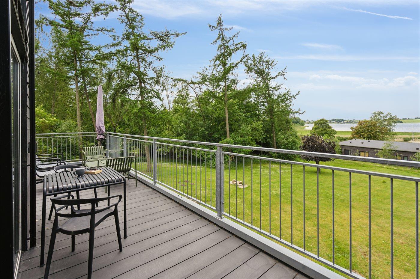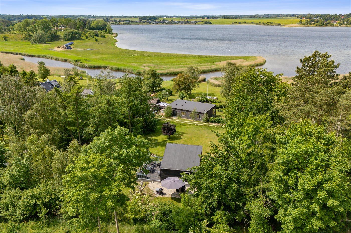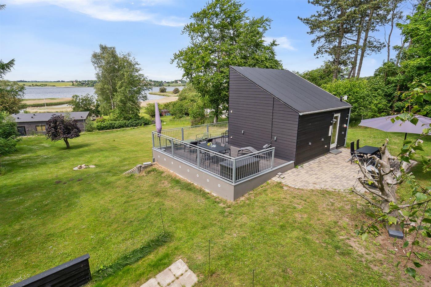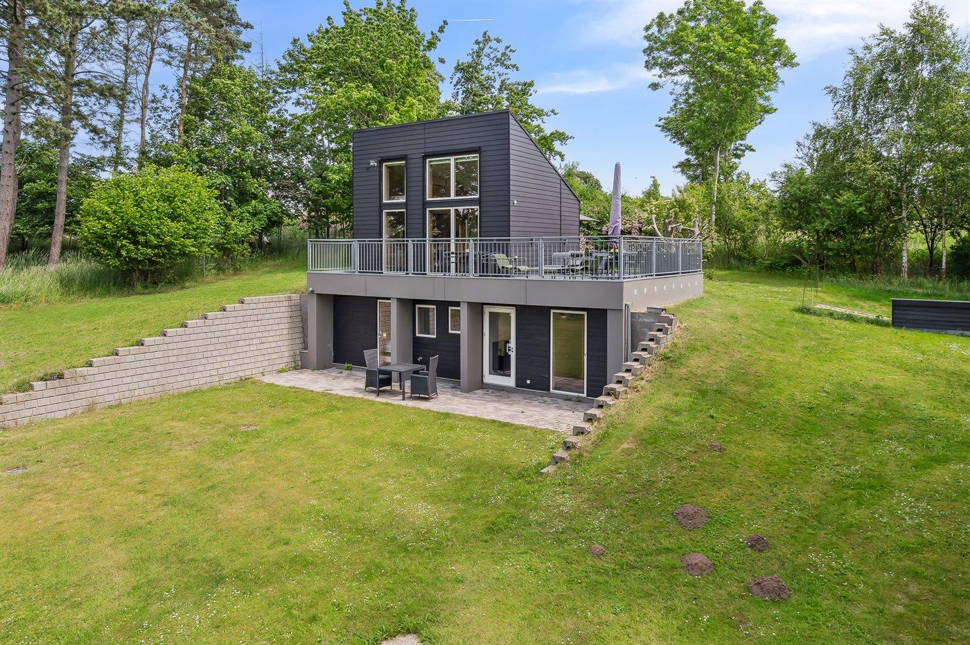 Arkitekttegnet sommerhus i Roskilde med fantastisk fjordudsigt og tre terrasser i naturskønt område nær skov og fjord.