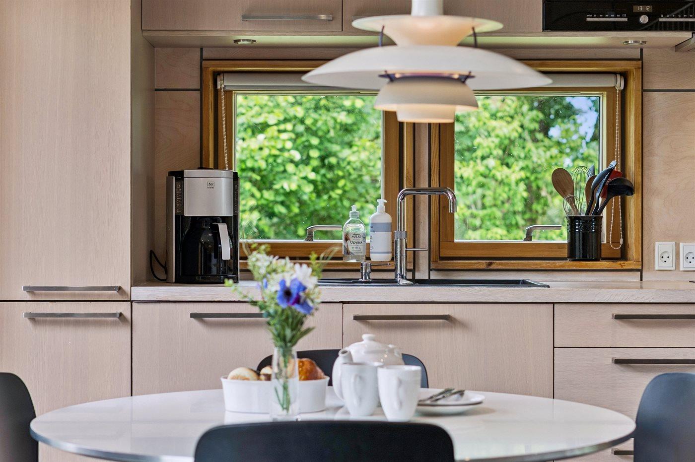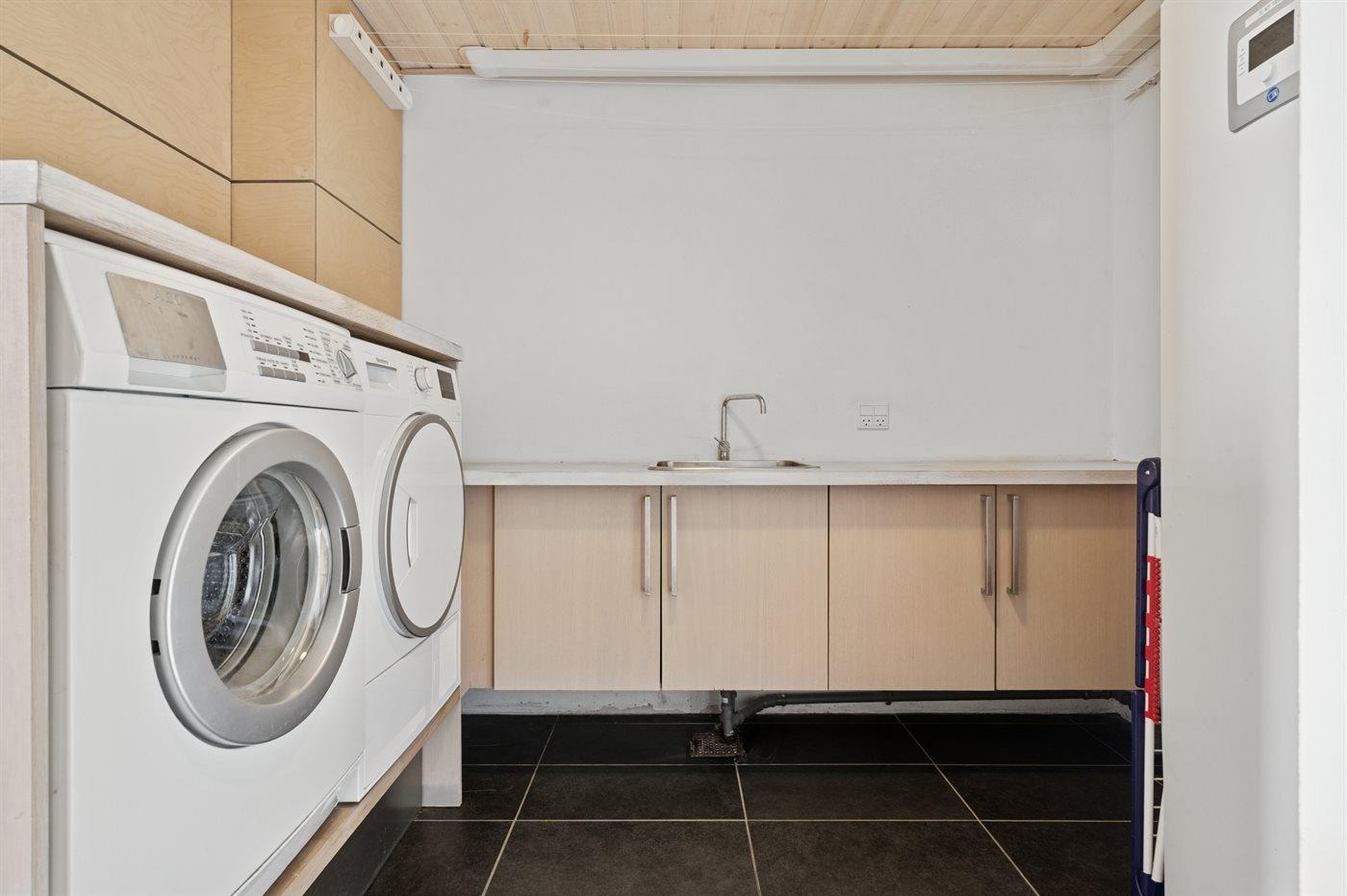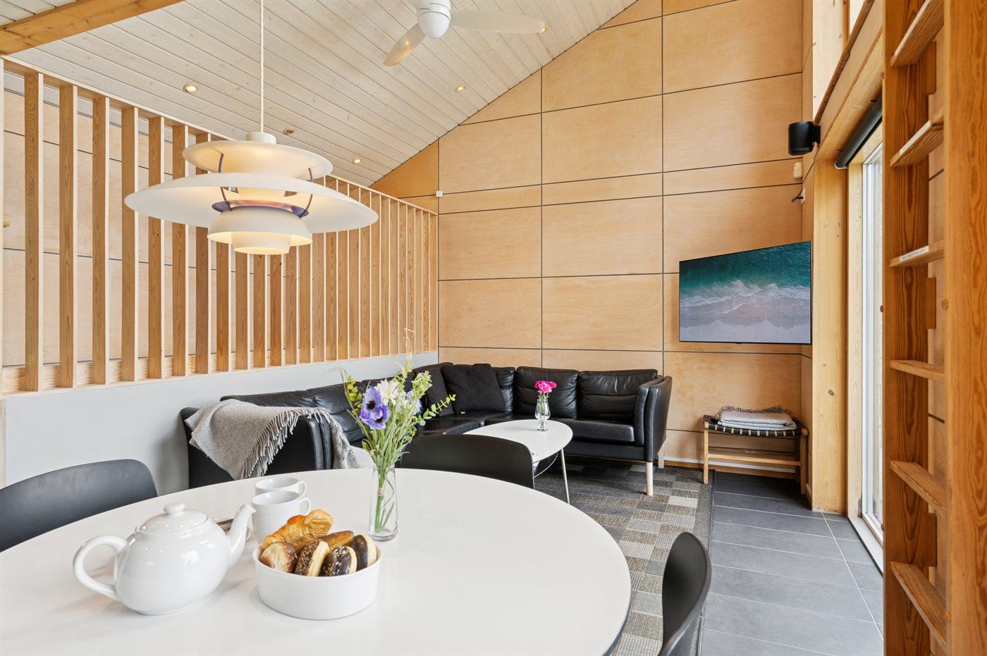 I den eksklusivt møblerede opholdsstue er der et smart TV - 4K OLED, med bla. AppleTV og Netflix. Gratis, trådløs internetforbindelse. Af yderligere udstyr findes vaskemaskine og tørretumbler. Der er endvidere installeret ladestander (11 kwh - type 2) til opladning af elbiler ved huset.